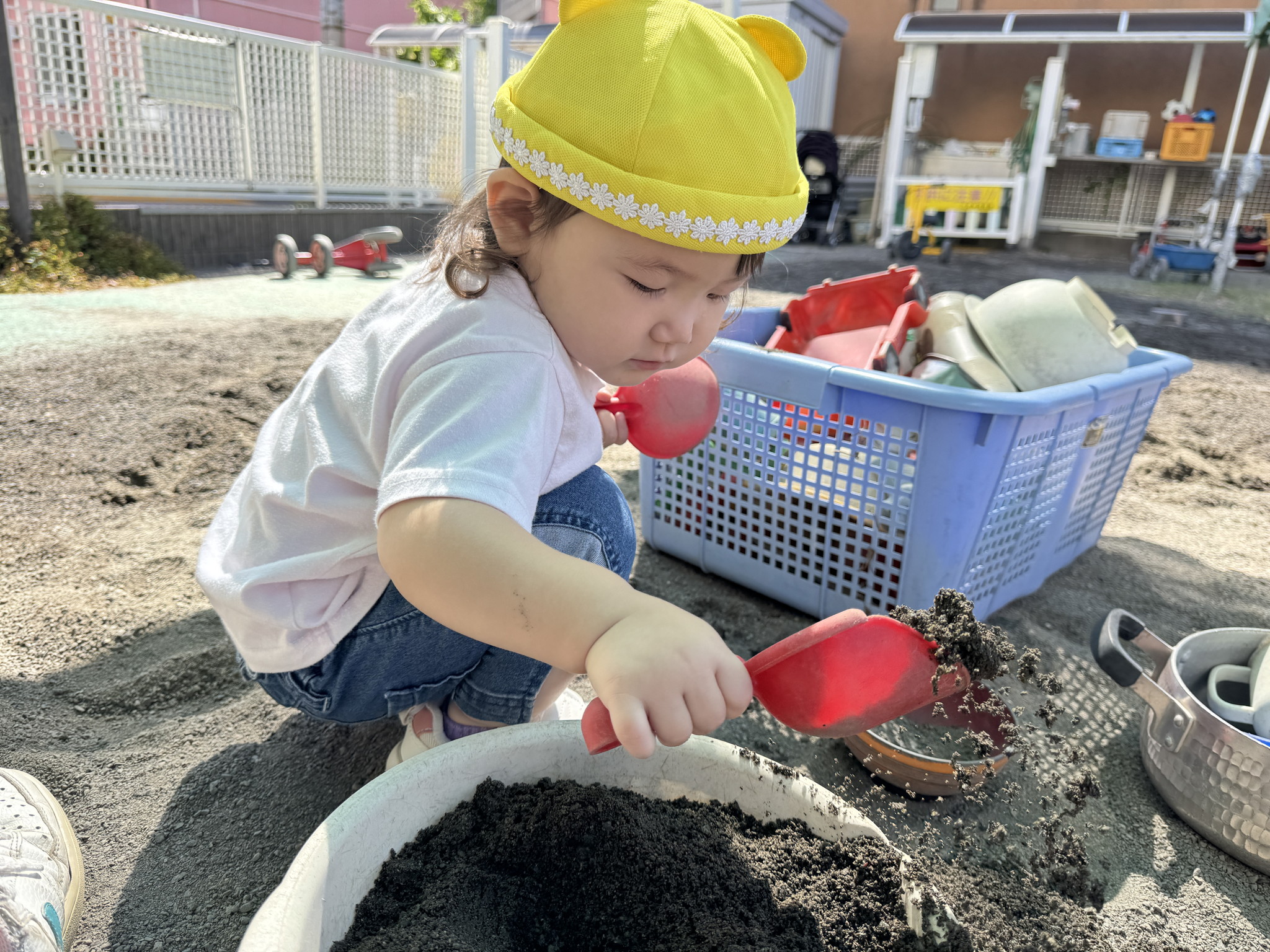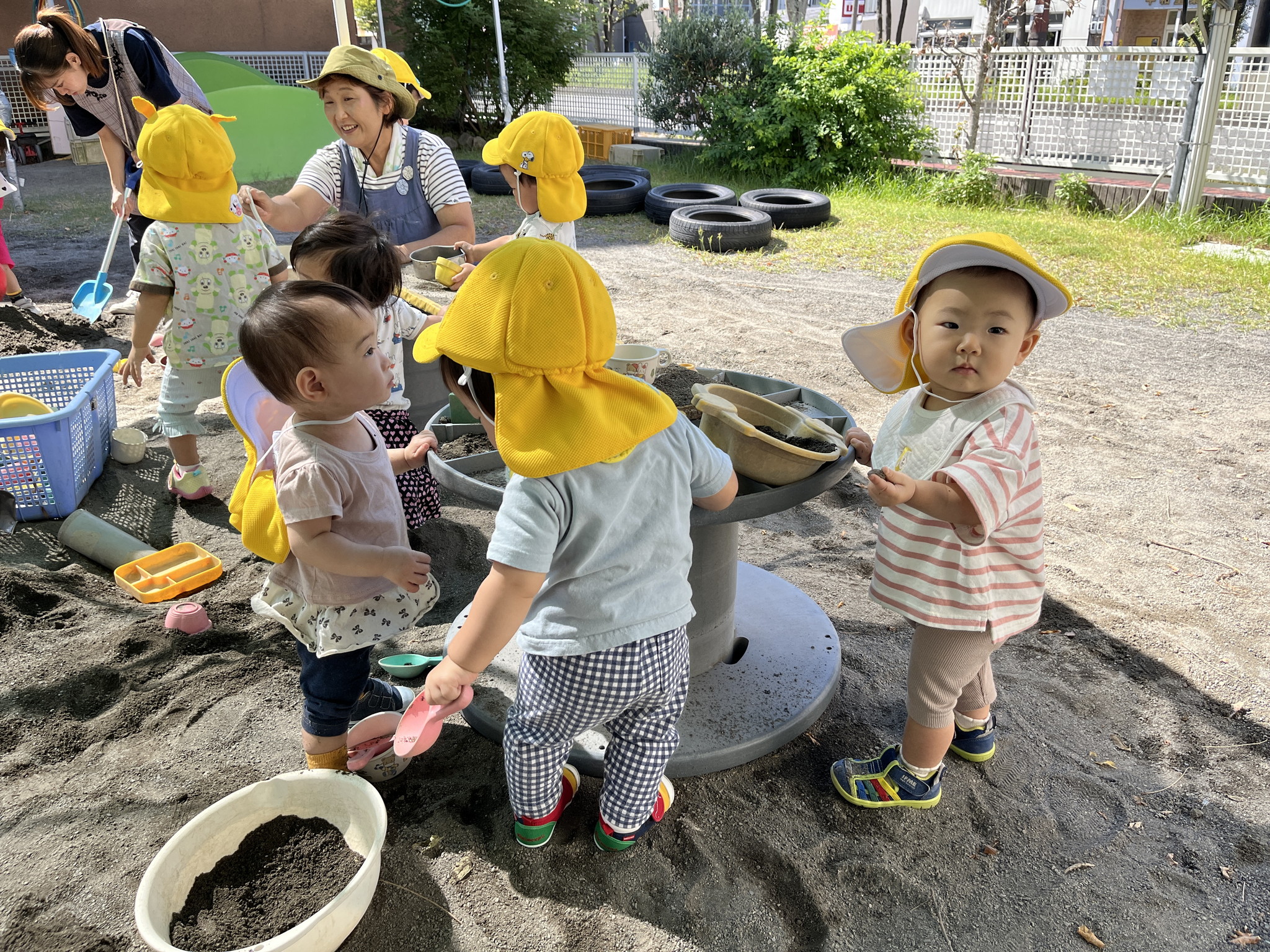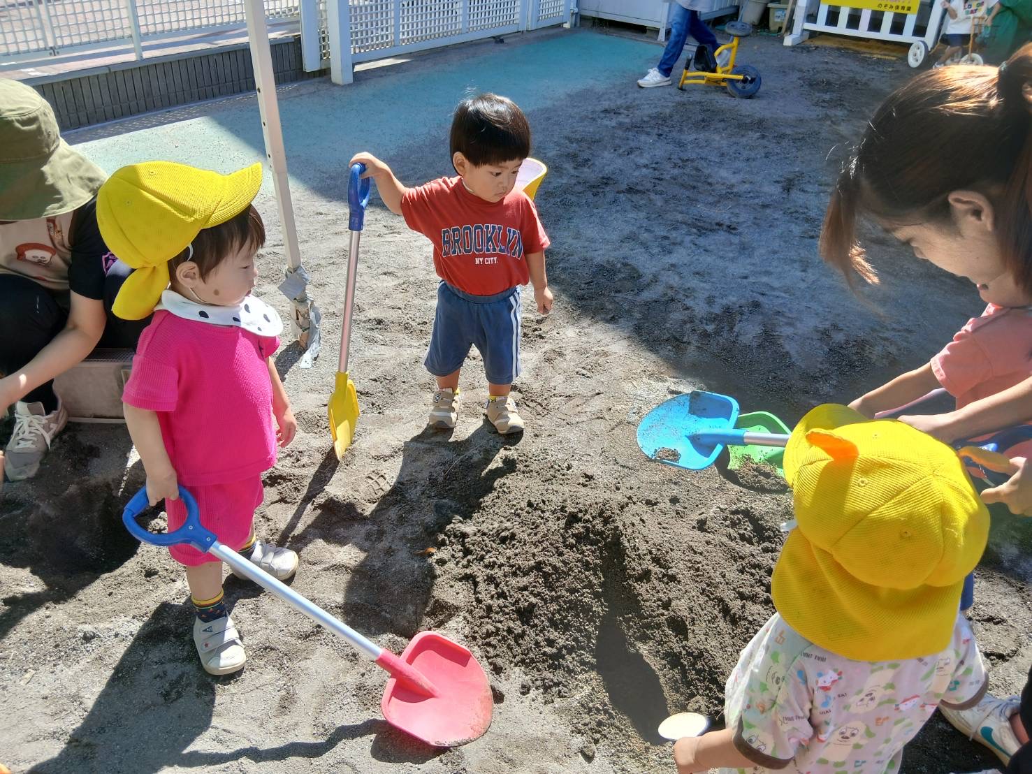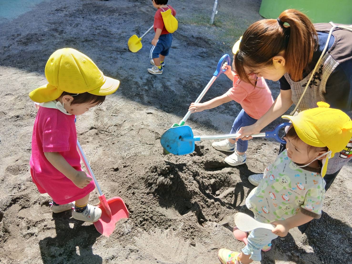 【 あひる 】 ペタペタ貼って・・・ 砂場で穴掘り 深く掘れるかな? すべり台、シュー 砂をすくってよいしょ いってきまーす!