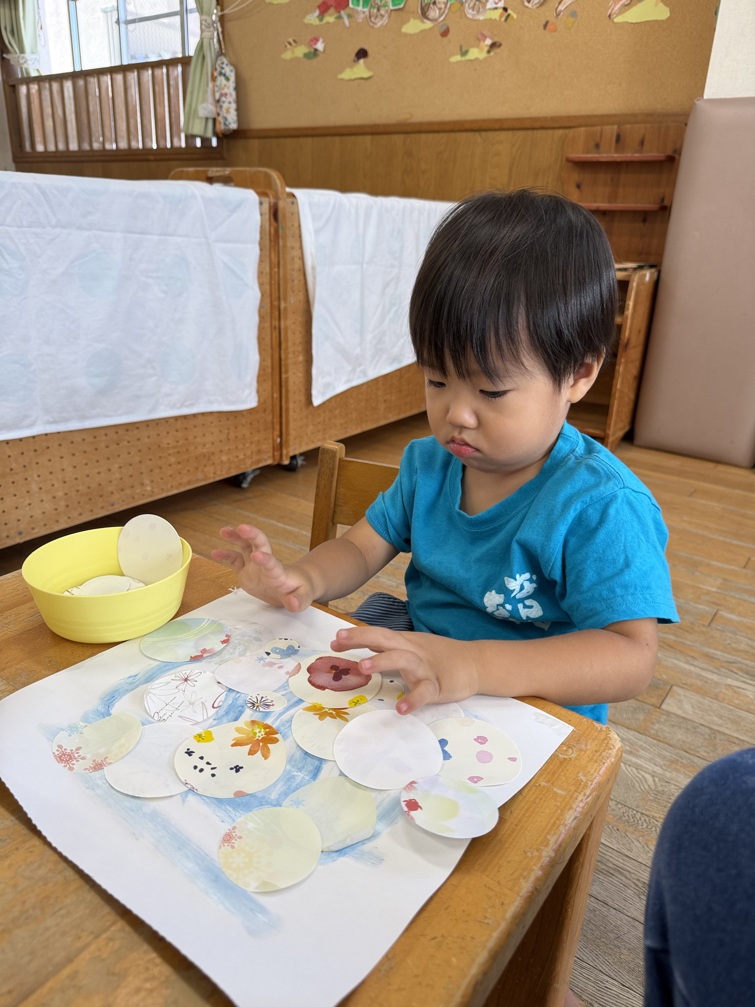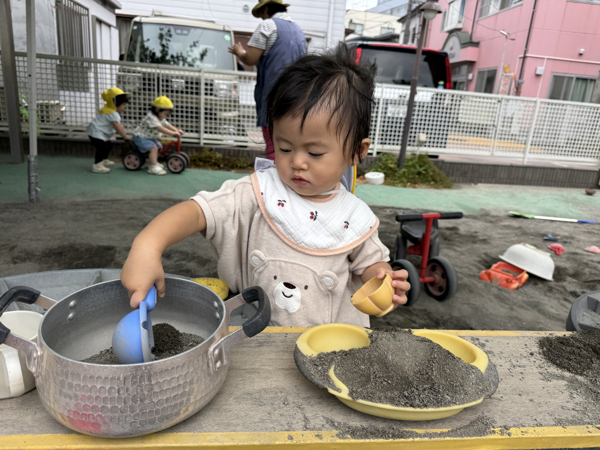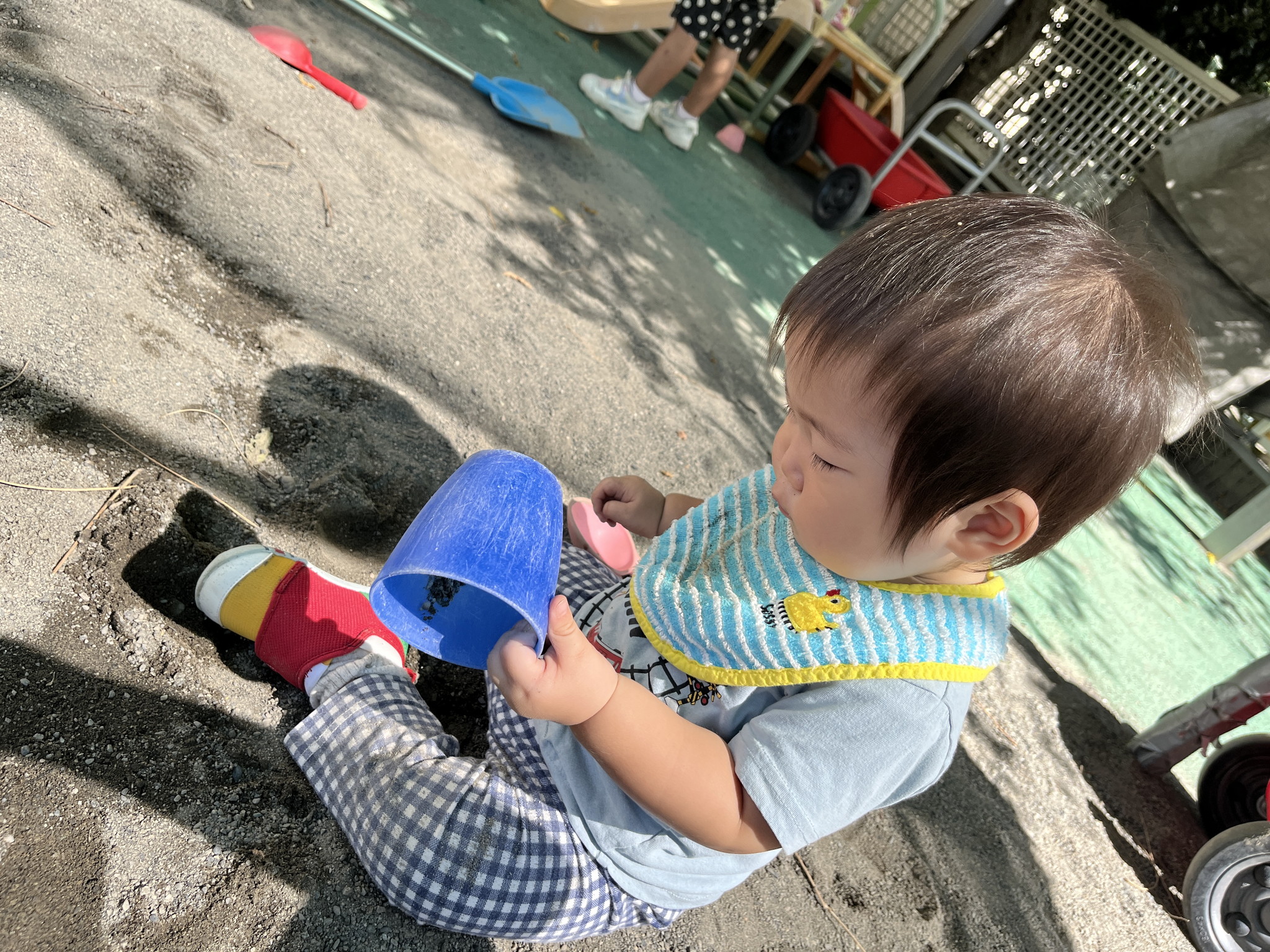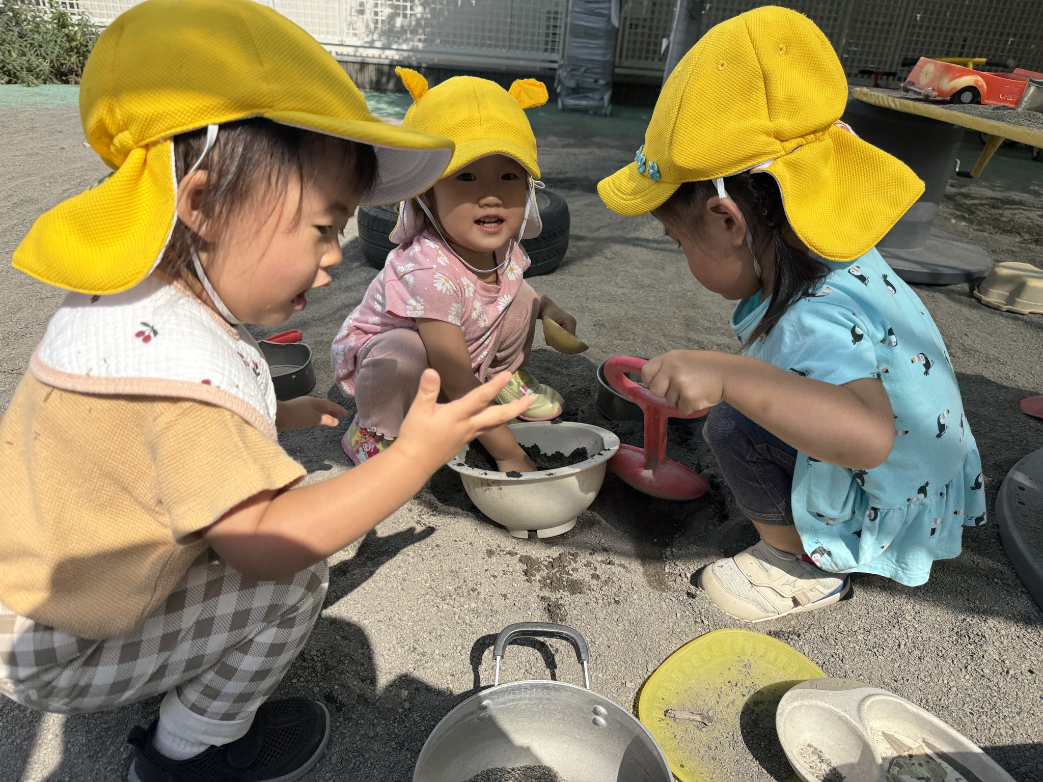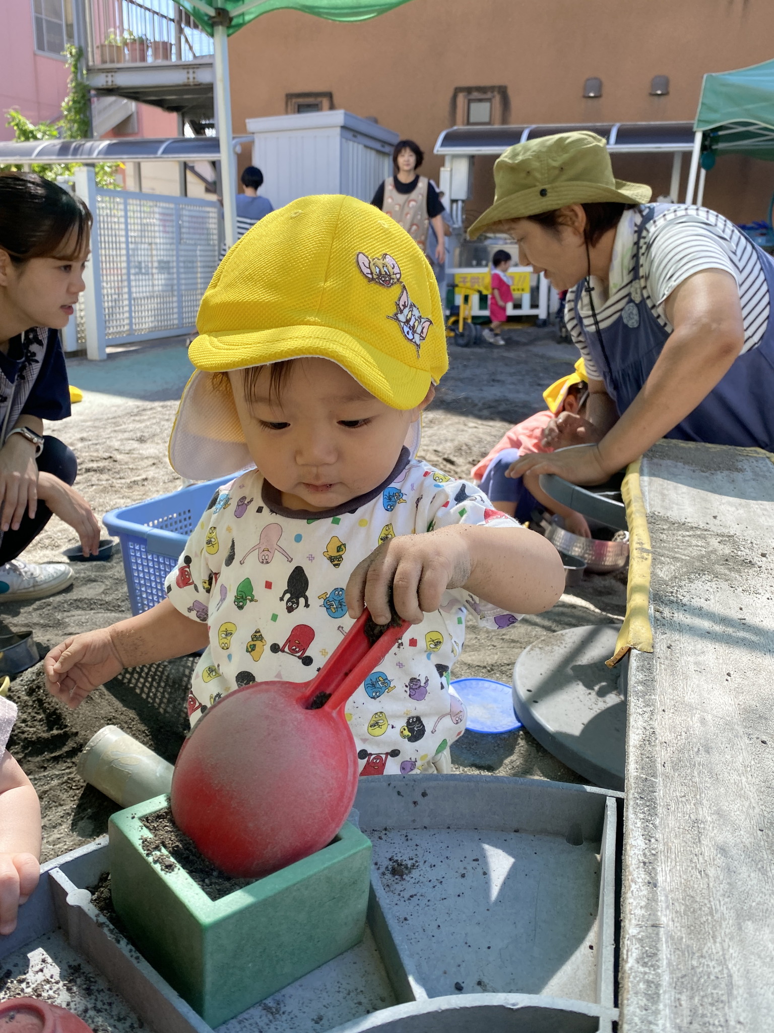 【 あひる 】 ペタペタ貼って・・・ 砂場で穴掘り 深く掘れるかな? すべり台、シュー 砂をすくってよいしょ いってきまーす!