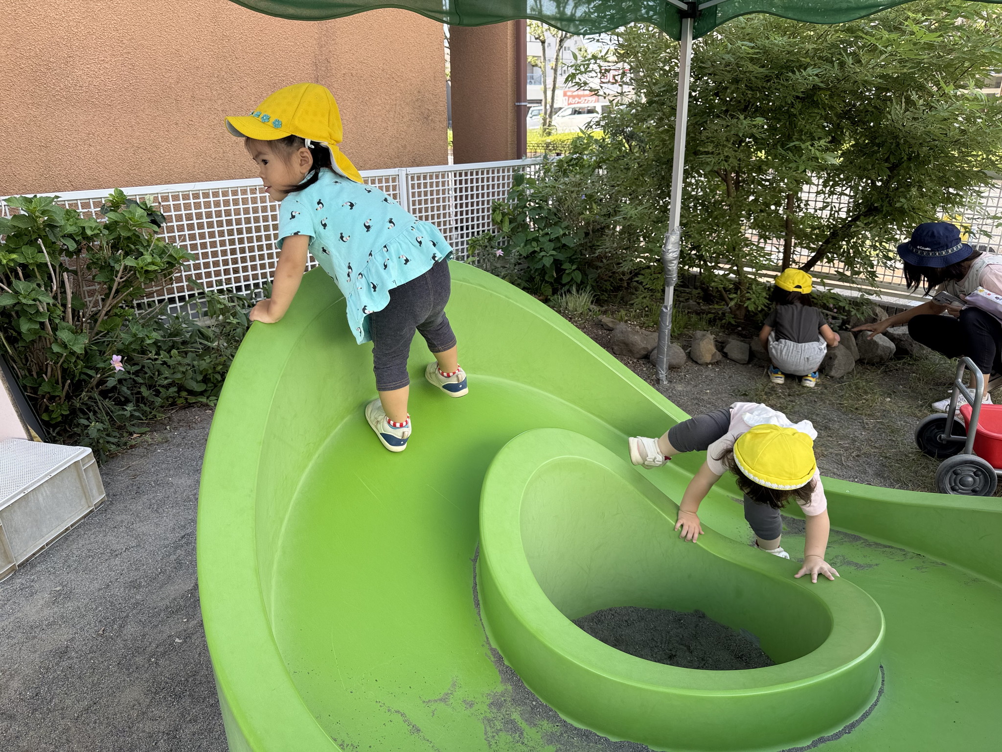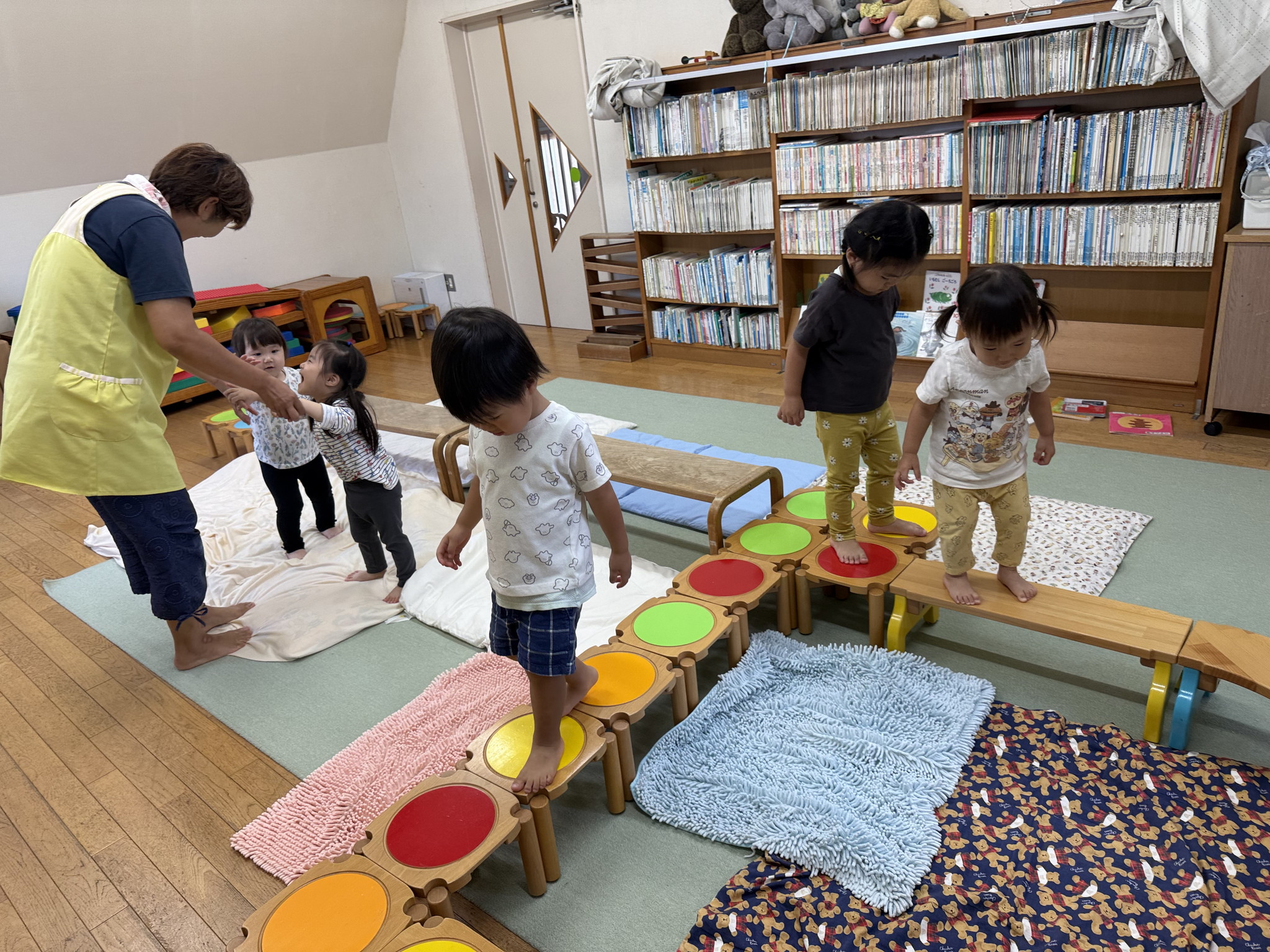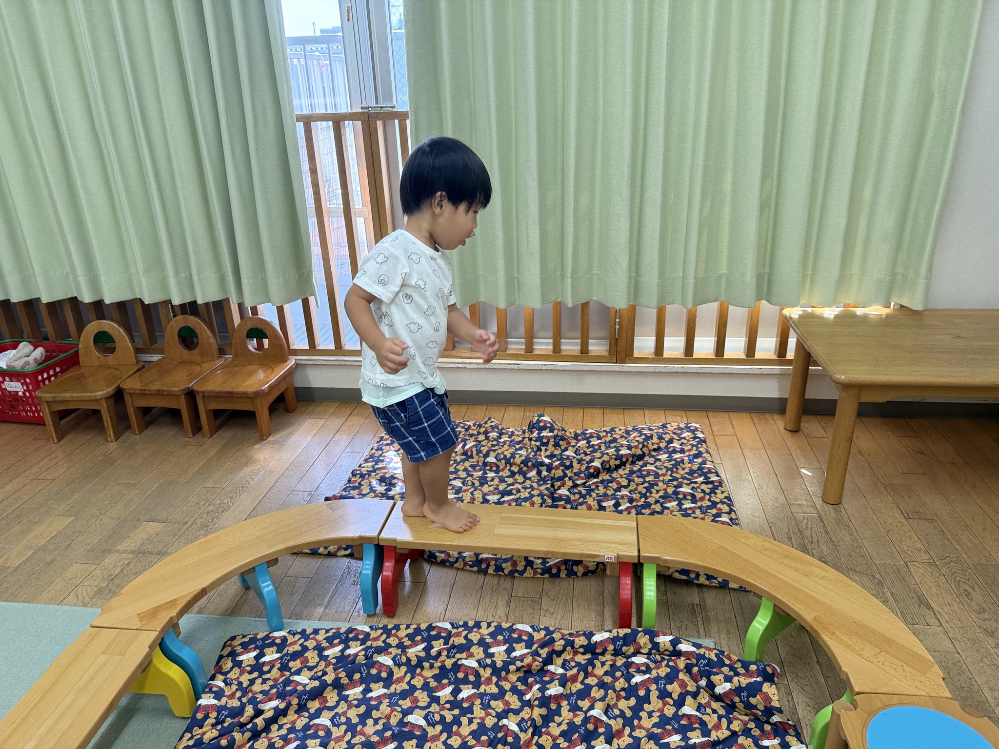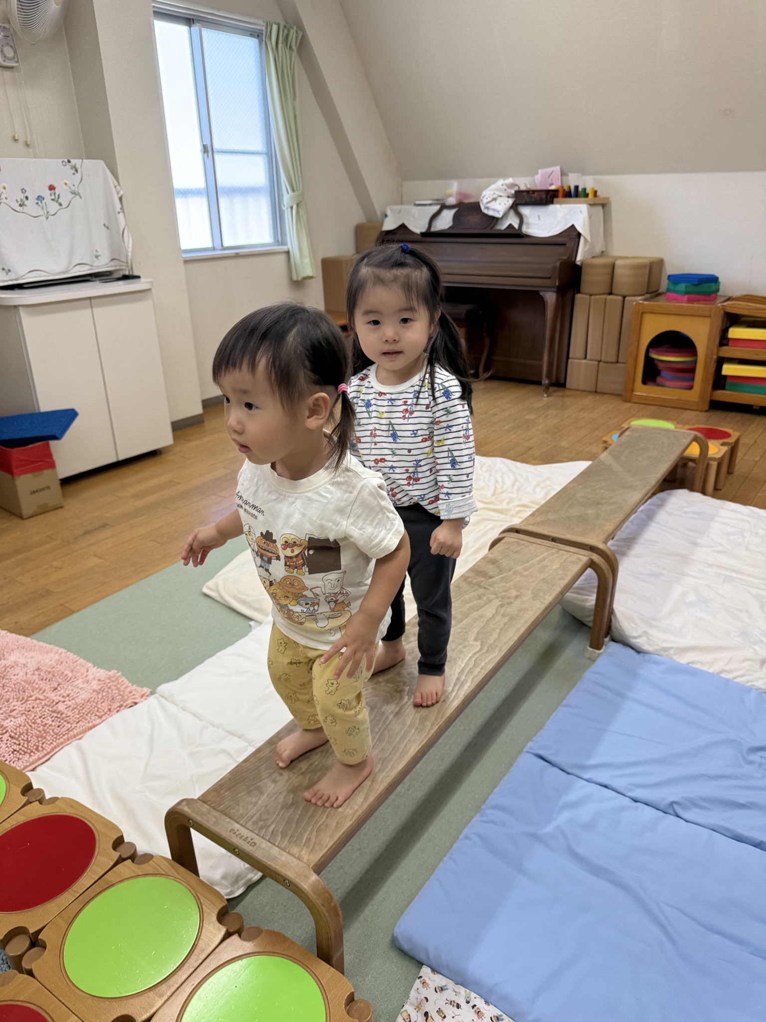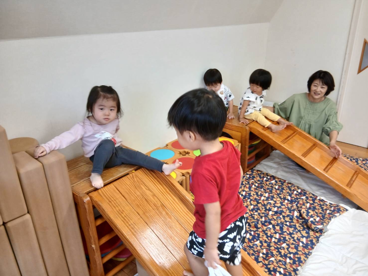 【 あひる 】 どこまで高くなるのかな? お部屋でもすべり台に挑戦 3人でごはんづくり! 私たちは緑のすべり台がお気に入り 一本橋も渡れるよ