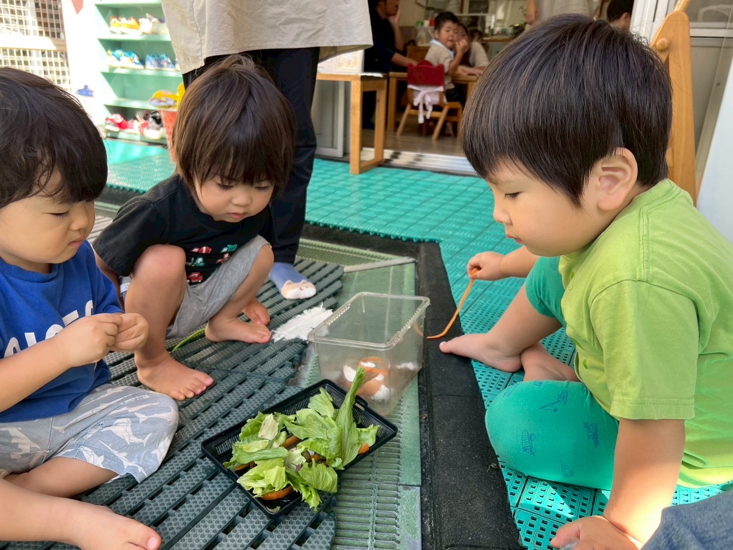 【 うさぎ 】 きょうはぼくのお誕生日会! みんなで3歳になったことをお祝いしたよ おめでと~! かたつむりさんにご飯をあげるよ ジャングルジムからおしりが落ちそう~