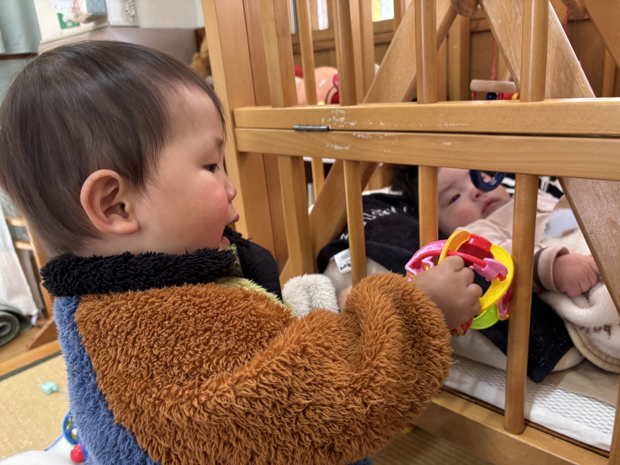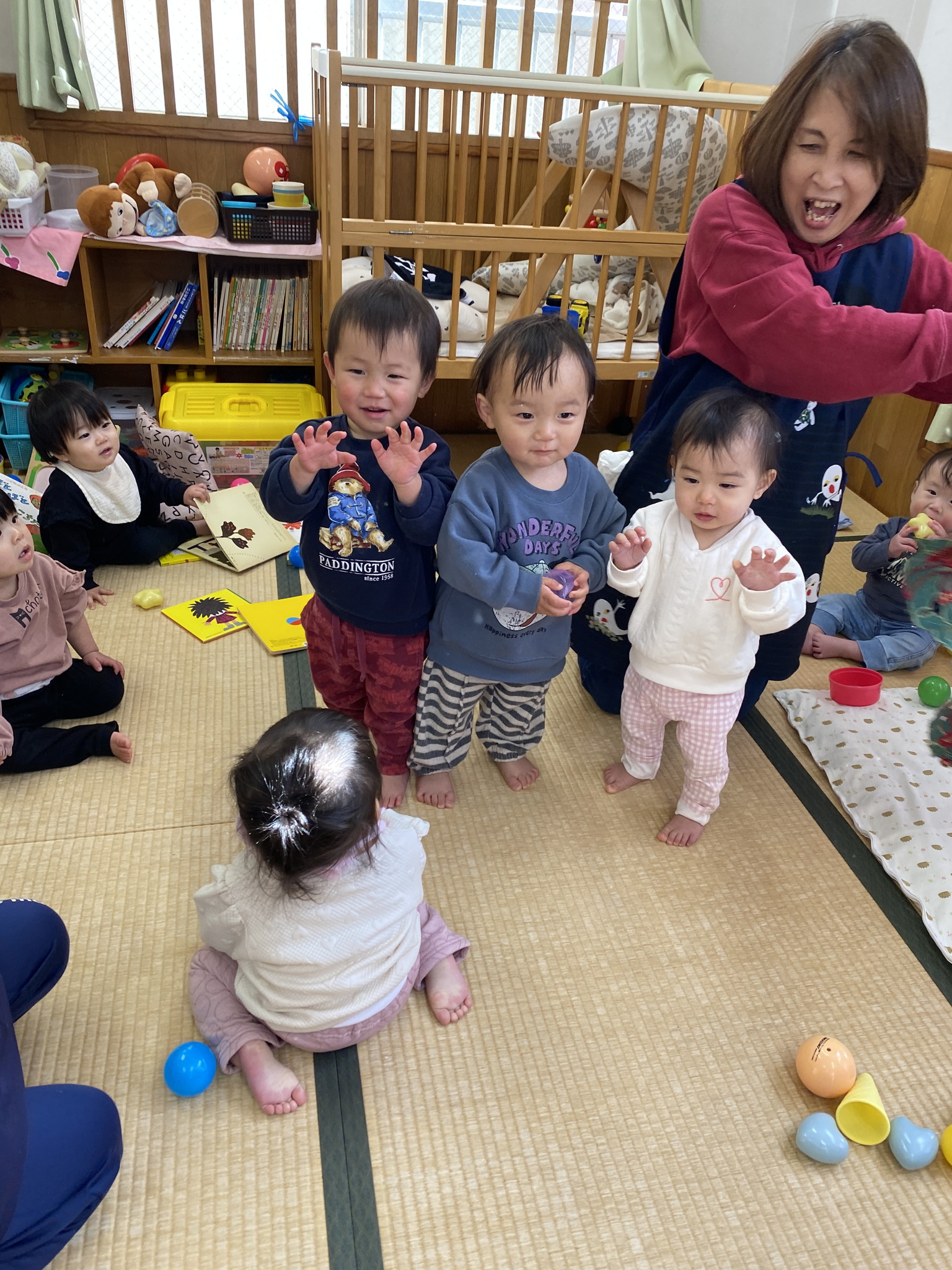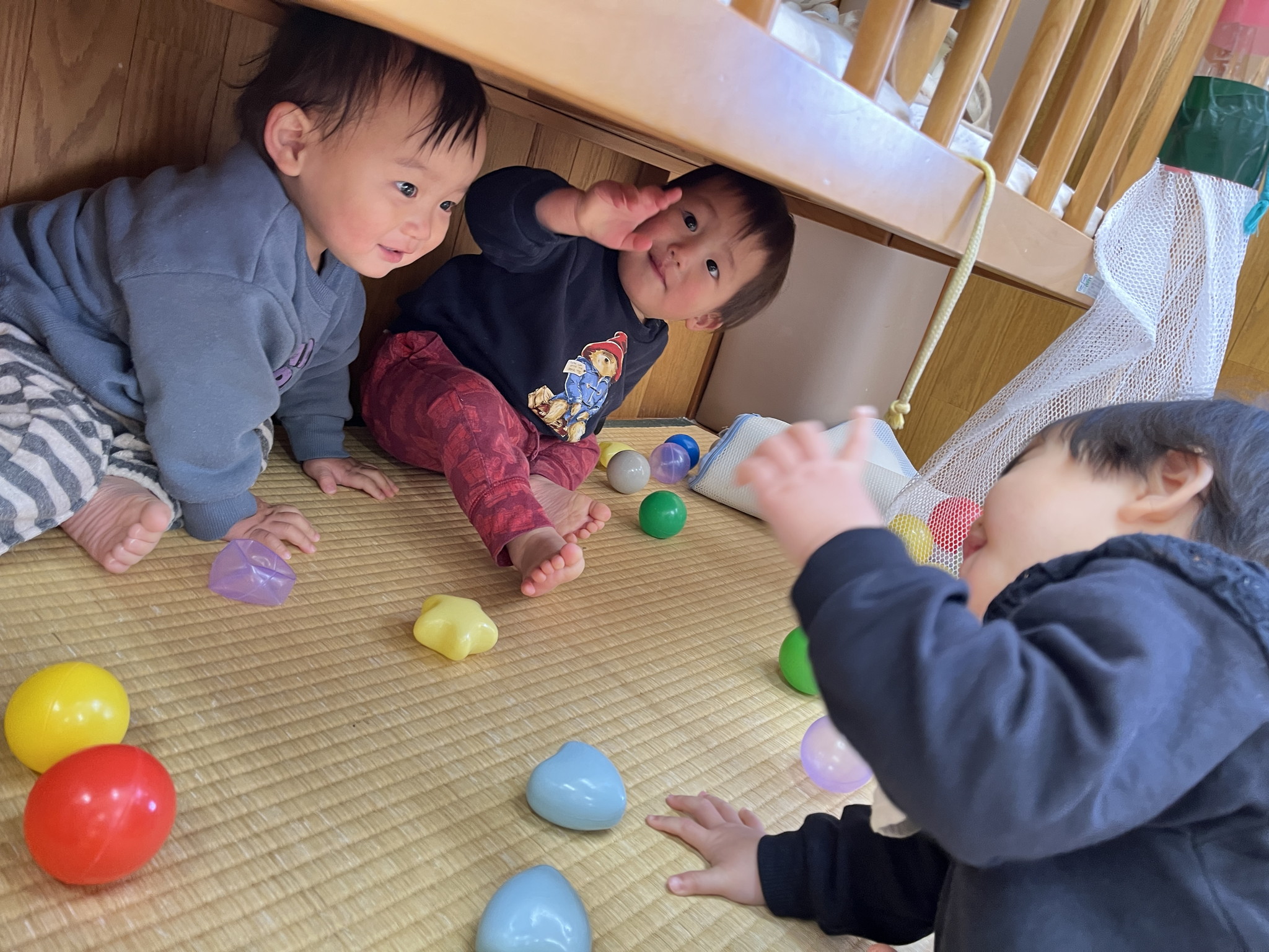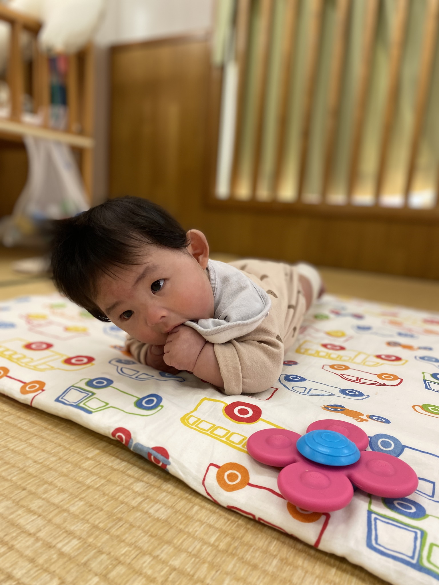 【 ひよこ 】 おもちゃどうぞ お顔を上げられるようになったよ! みーつけた^皿^そこに隠れてたのね! いないいない・・・ ばぁー!