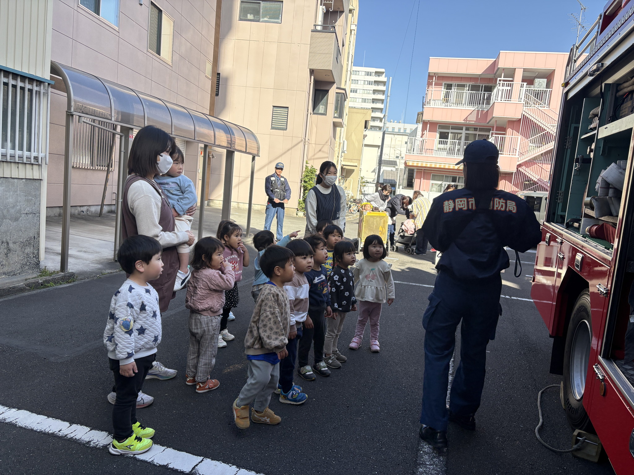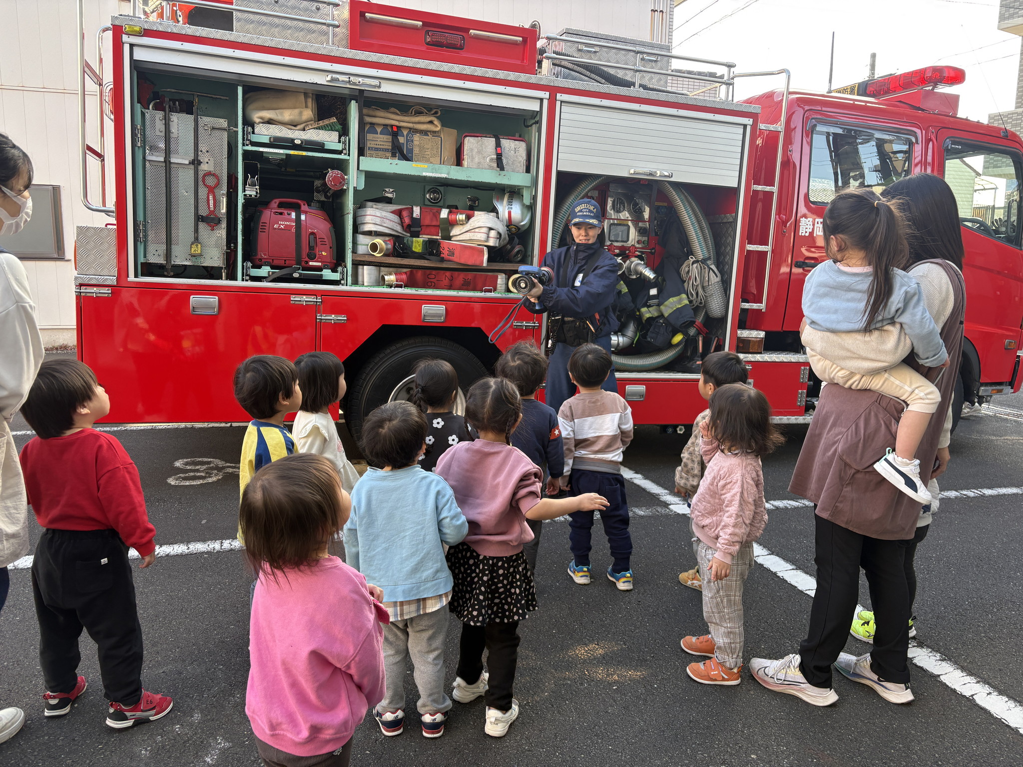 【 ひよこ 】 火災を想定して避難訓練をしました そのあとは消防車を見学させてもらったよ! 消防車かっこよかったね!