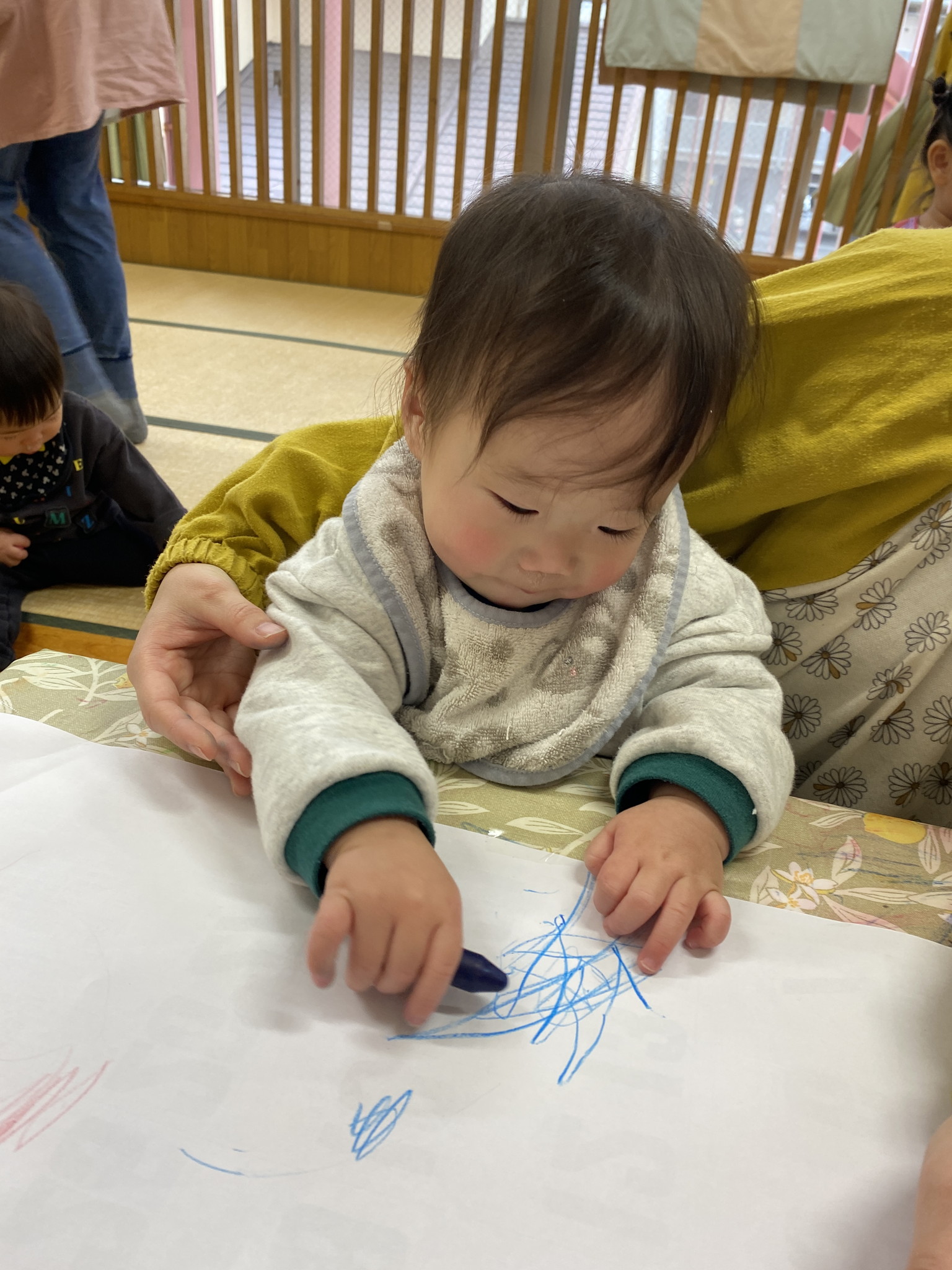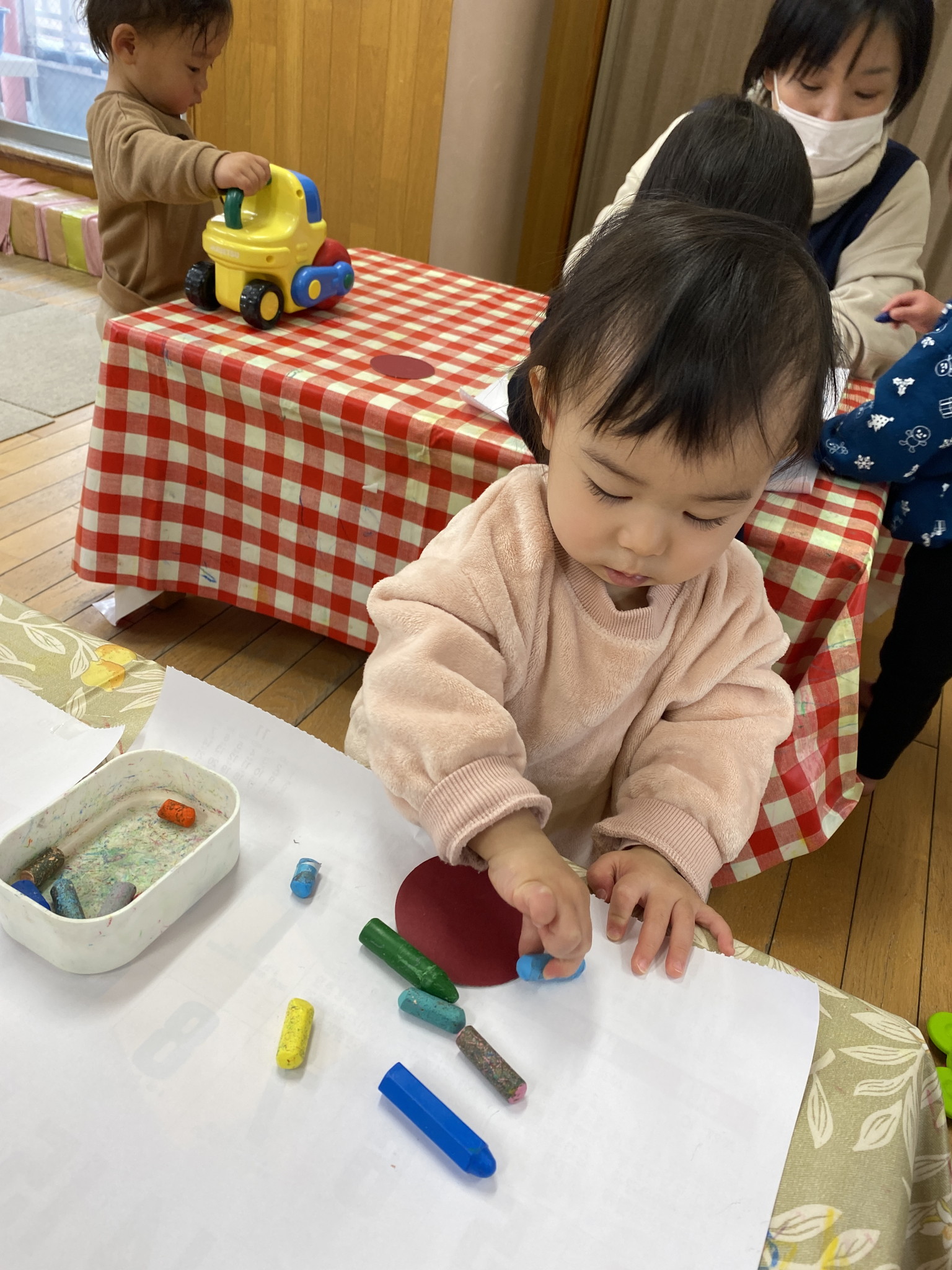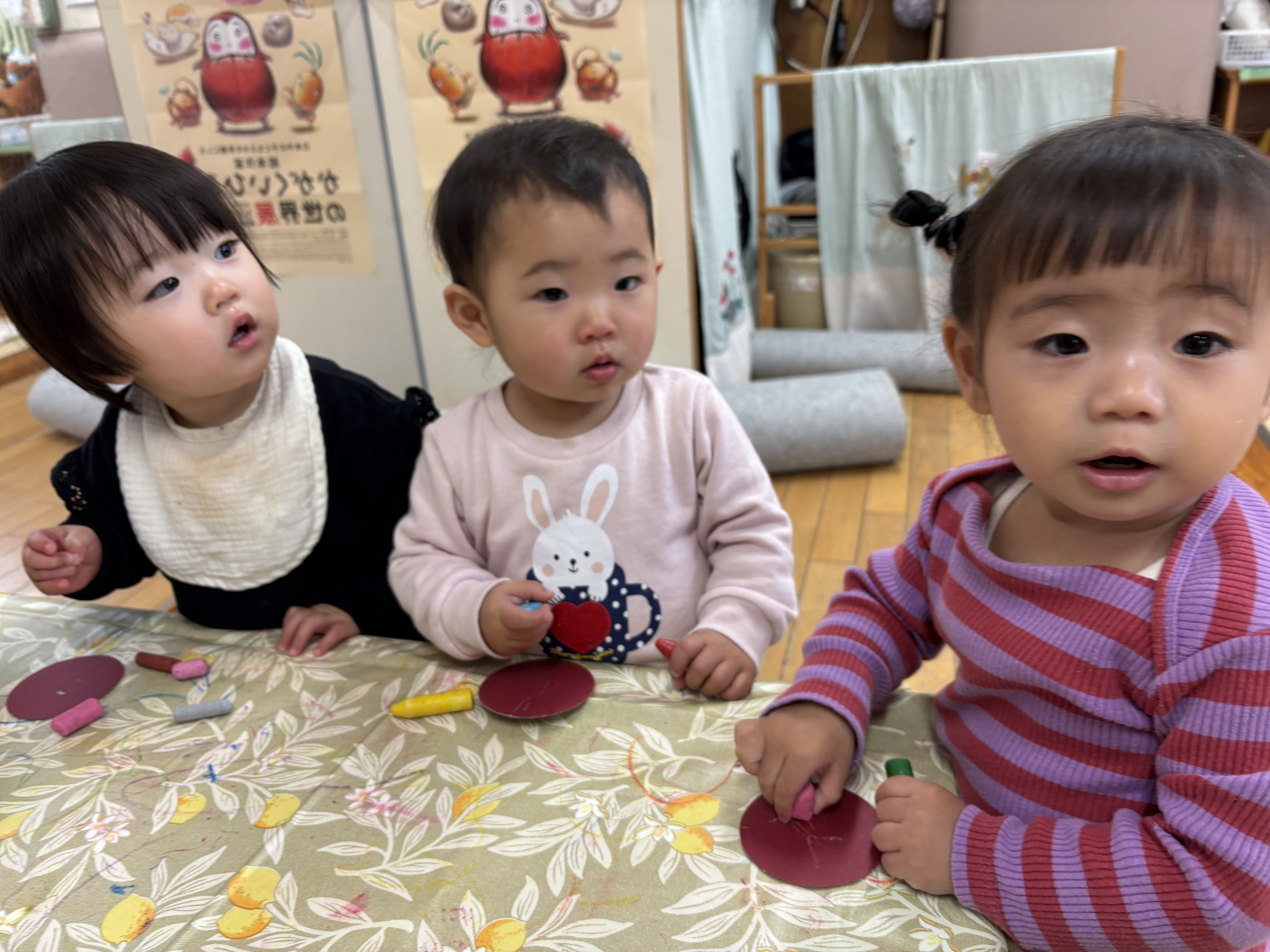 【 ひよこ 】 クレヨンでカキカキ~♪ クレヨンで上手に描けるようになってきたね おっとっとっと~ ごちそうパーティーはじまるよ! うさぎぐみのお兄さんお姉さんがあそんでくれてうれしかったね