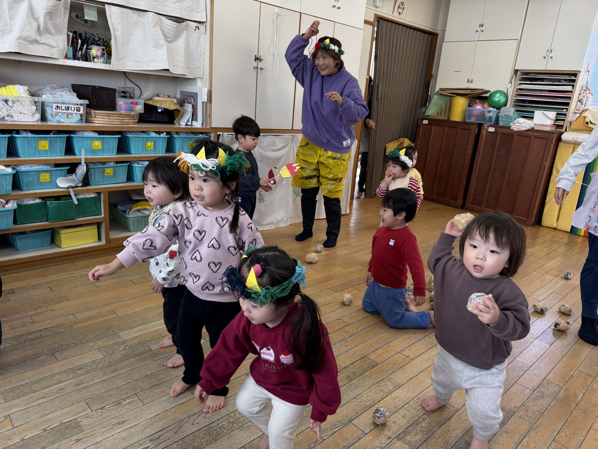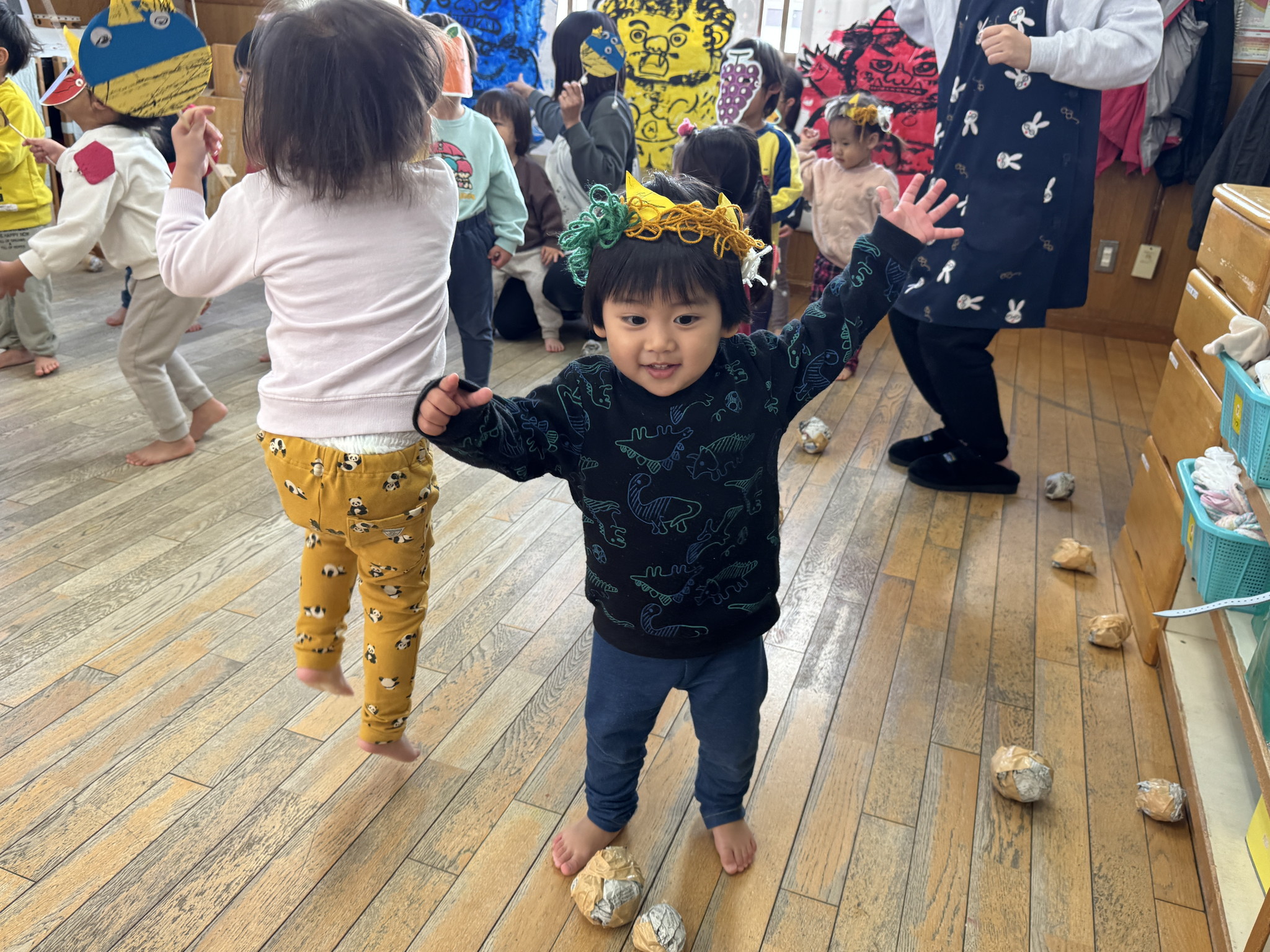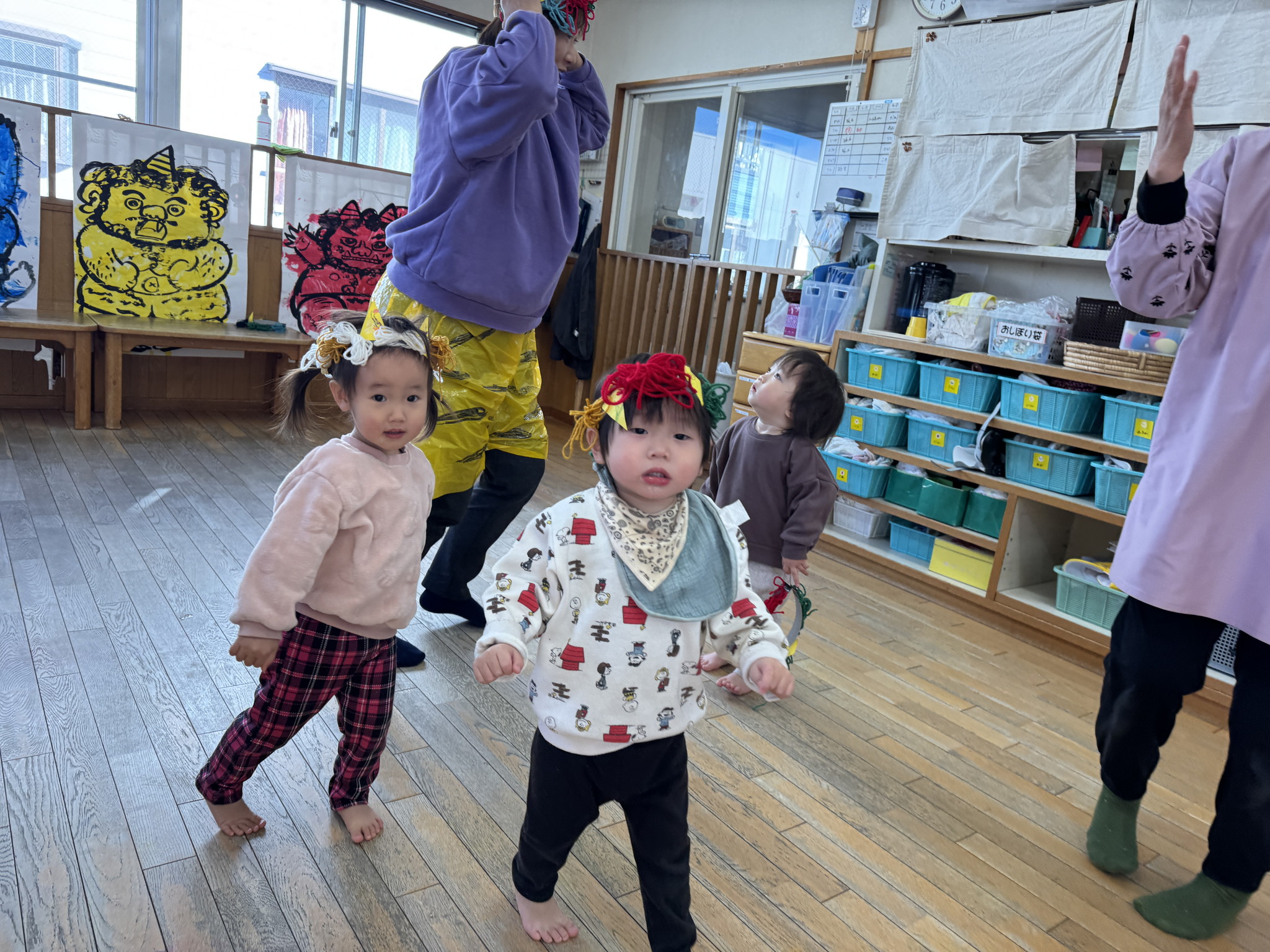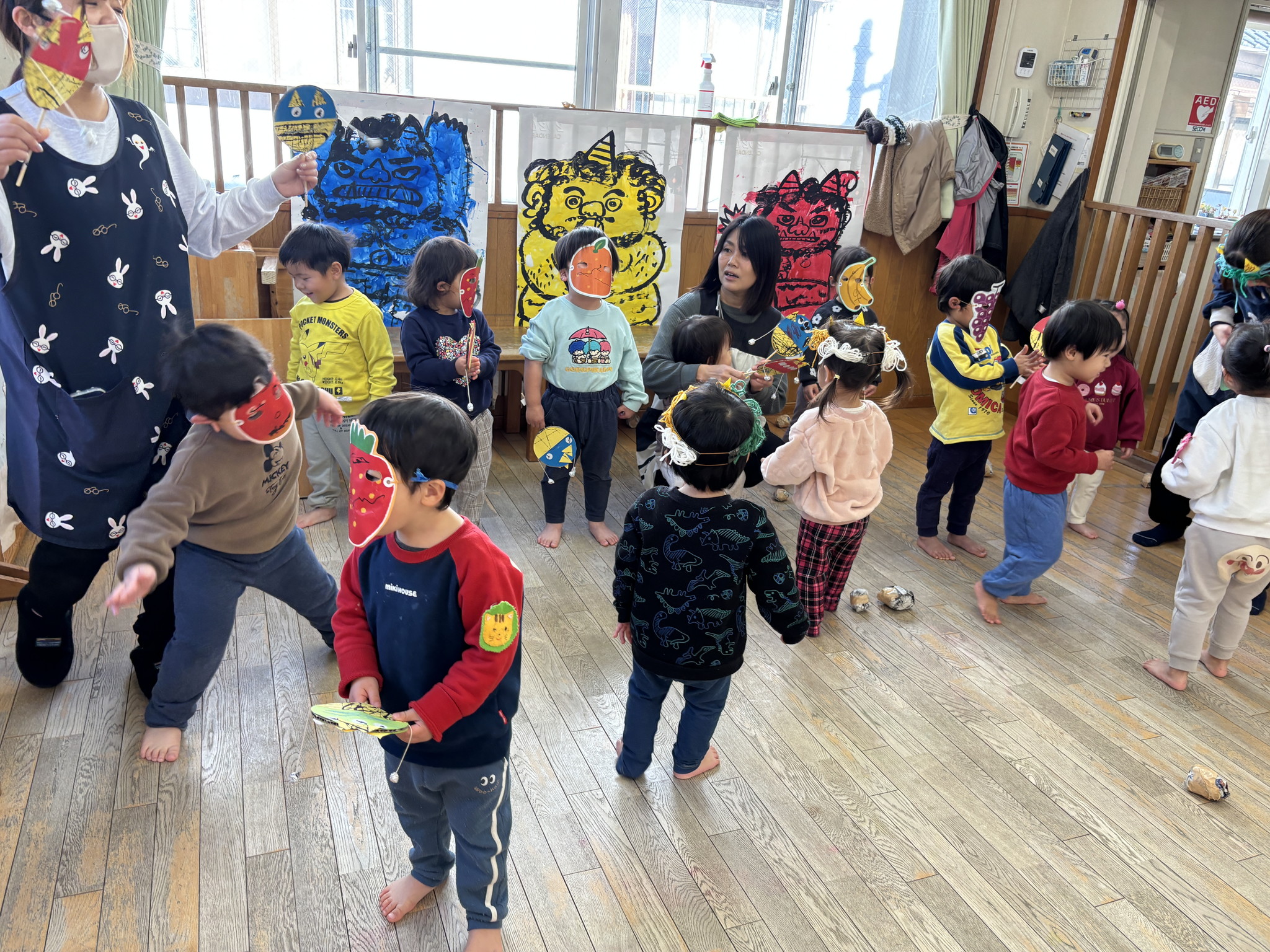 【 あひる 】 今日は節分!みんなで鬼たいじをしたよ おにはそと!ふくはうち! 最後は仲よく“おにのパンツ”を踊ったよ