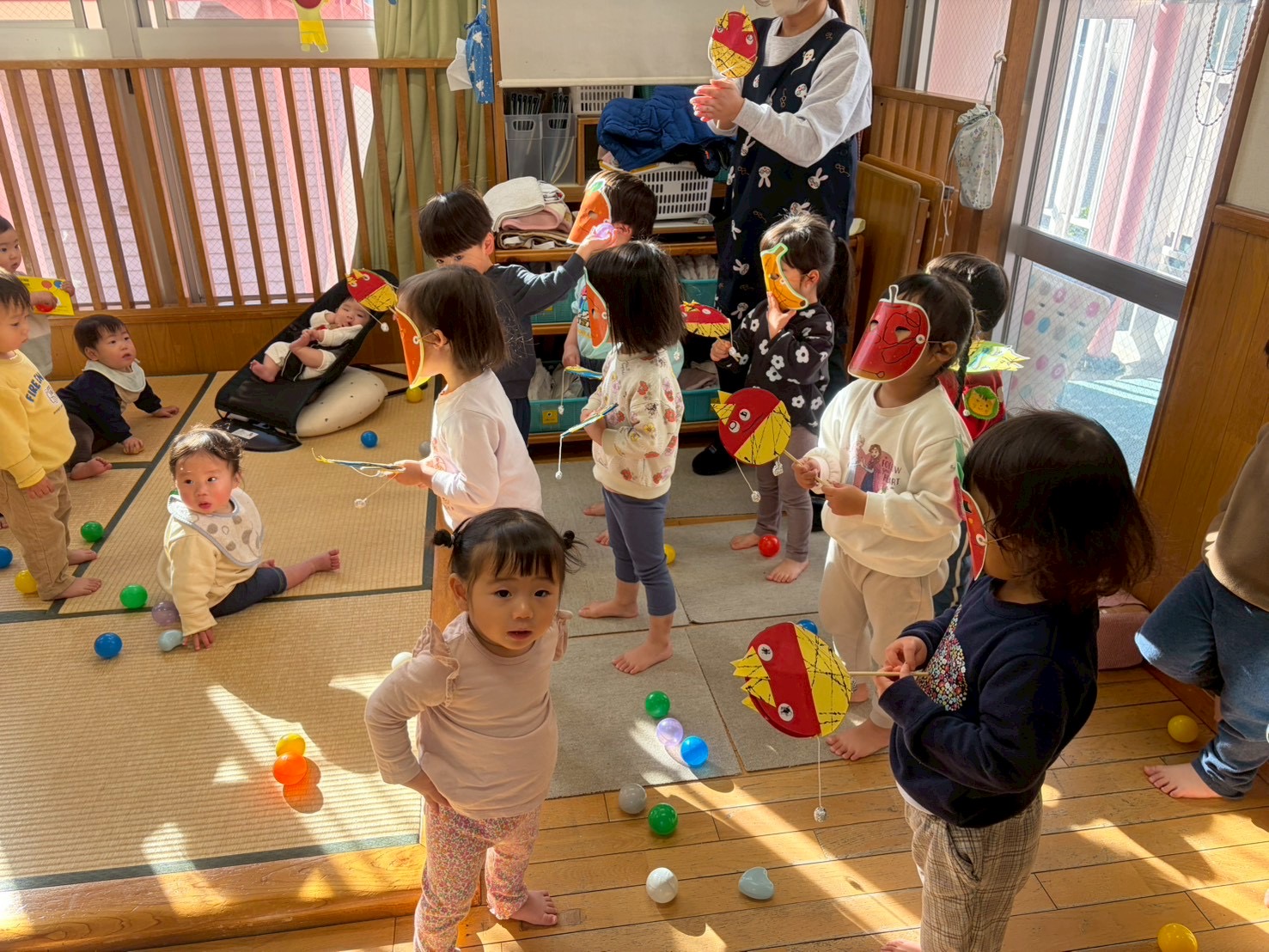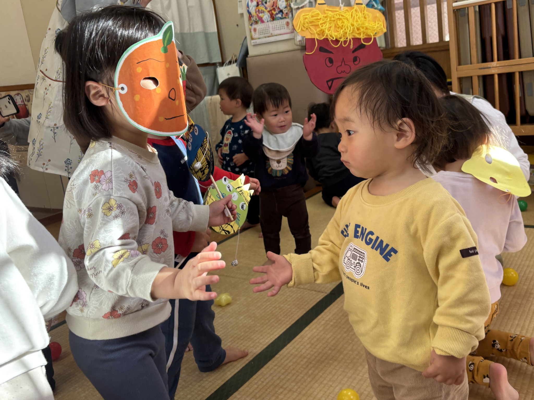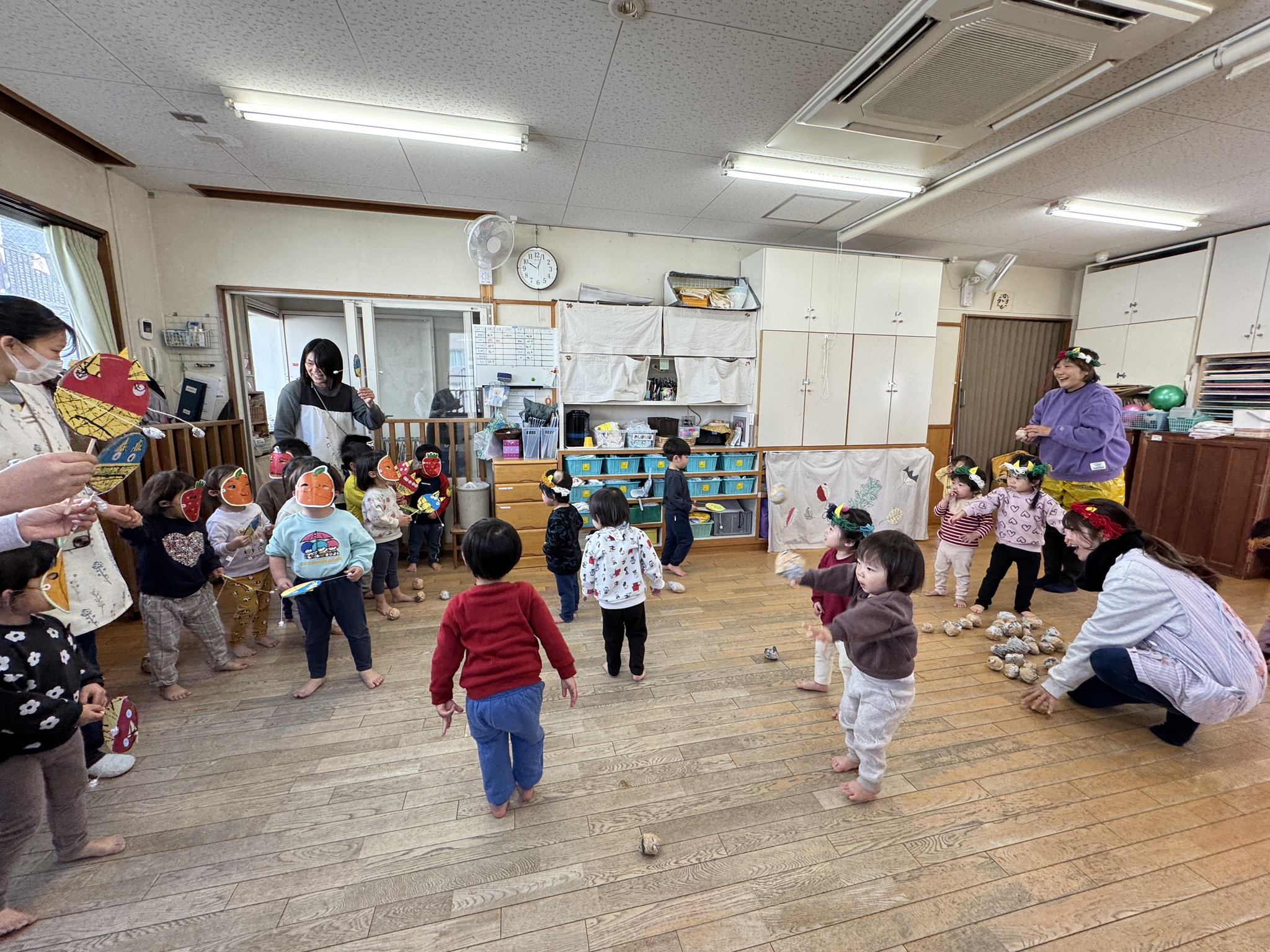 【 あひる 】 今日は節分!みんなで鬼たいじをしたよ おにはそと!ふくはうち! 最後は仲よく“おにのパンツ”を踊ったよ