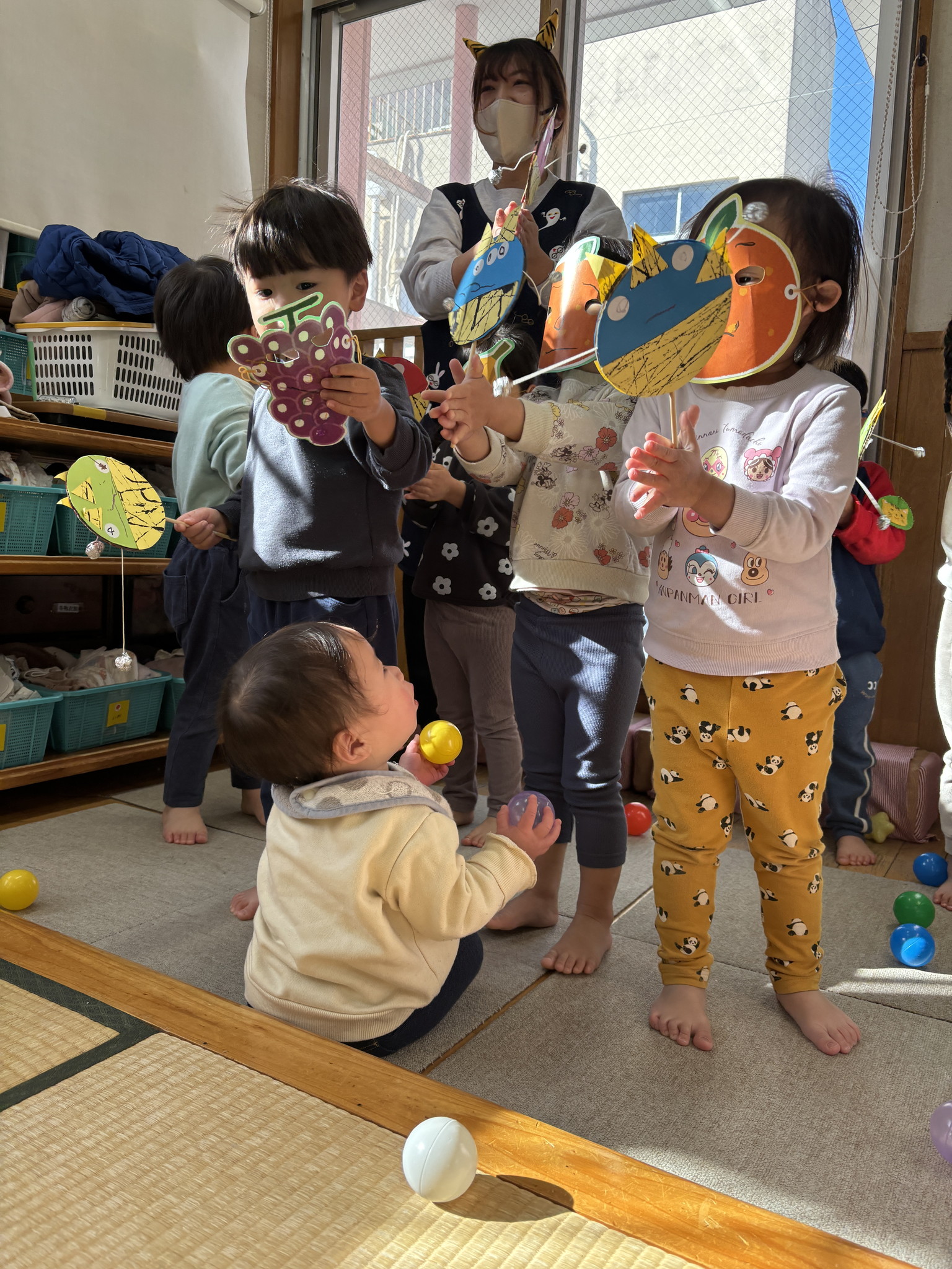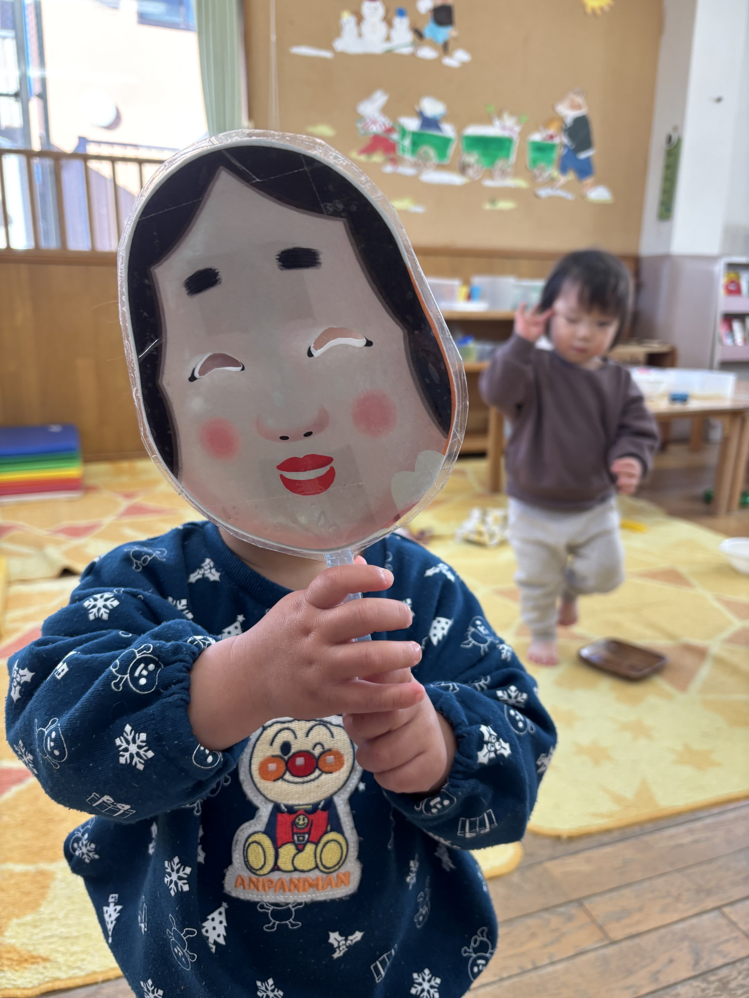 【 ひよこ 】 お福さんになったよ あれ・・・!? わ・・・!! うさぎぐみのフルーツおにさんがきた!! おにはー外!ふくは~内! 最後はおにさんとハイタッチ♪
