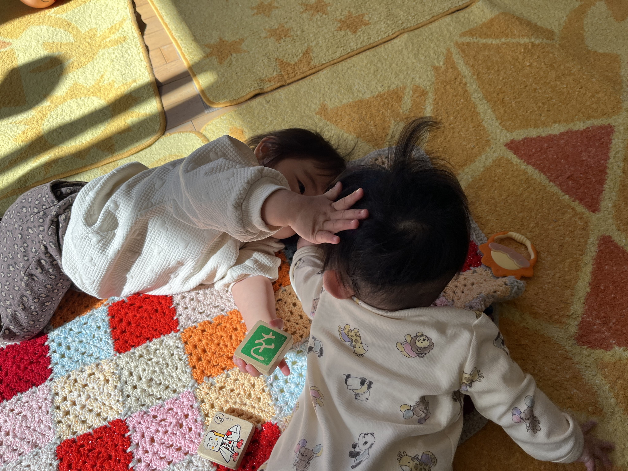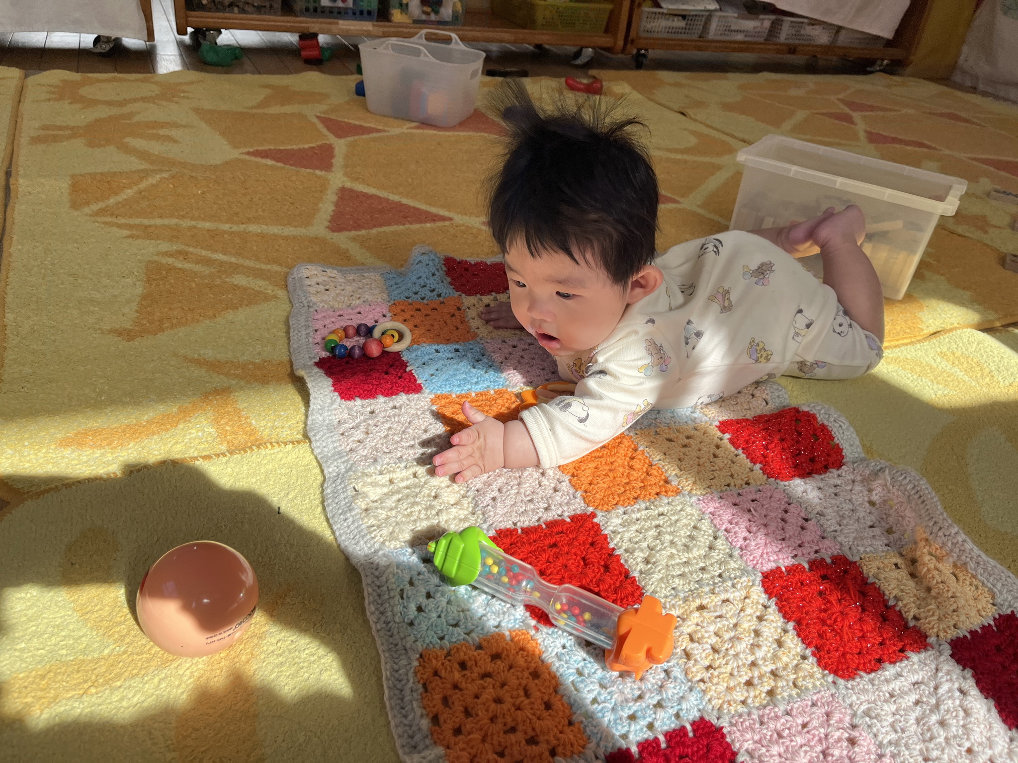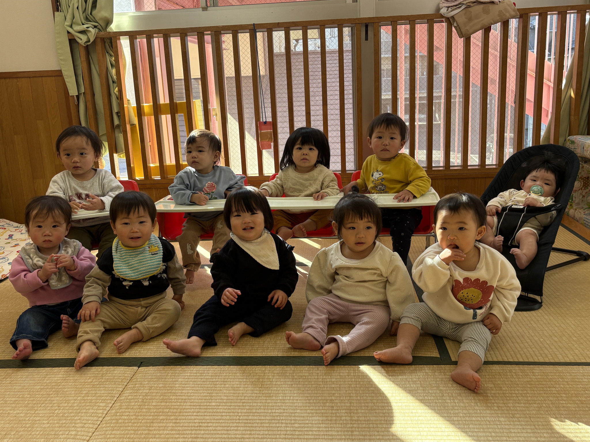 【 ひよこ 】 ひよこぐみ10名全員集合! べー^皿^ 落ちないようにそ~っと・・・ 届かない~>_< ならべてならべて いいこいいこ♪