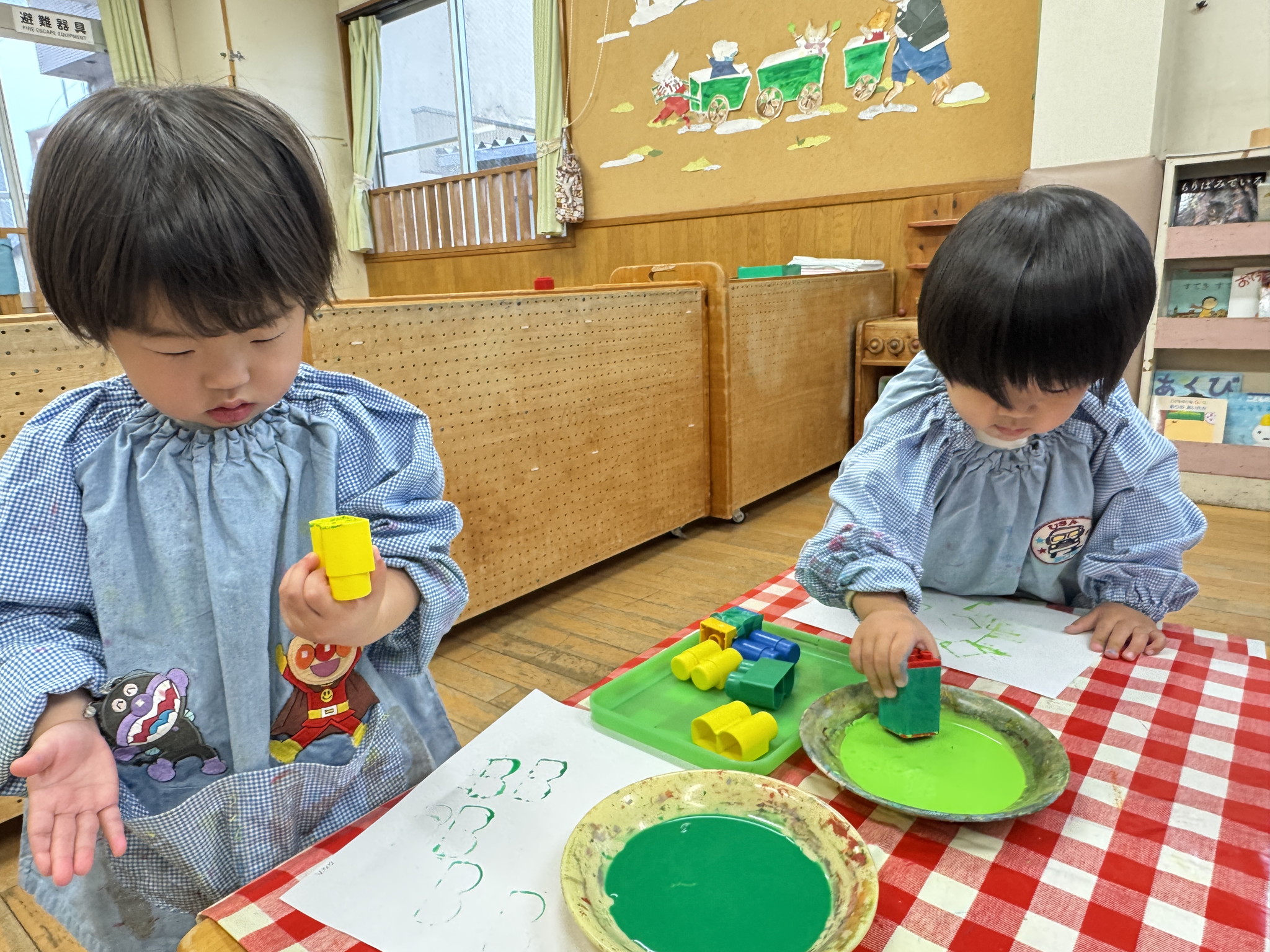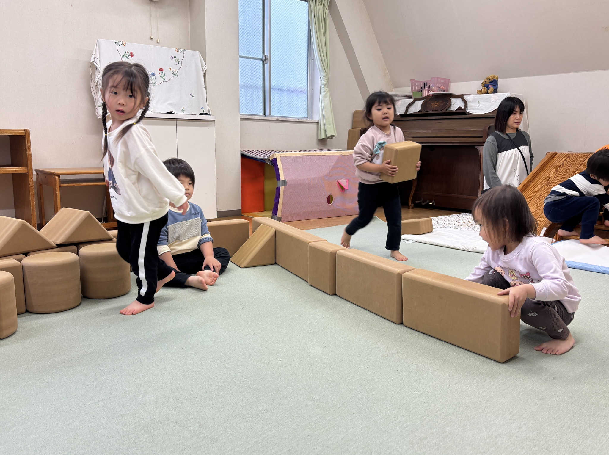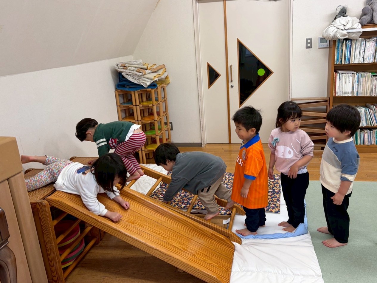 【 うさぎ 】 ボタンをはめて長~く魚をつなげるよ はさみでちょっきん はしごを登ってすべろう!一列に並んで順番だよ 大型積み木でお家作り 完成したら中に入って絵本タイム♪