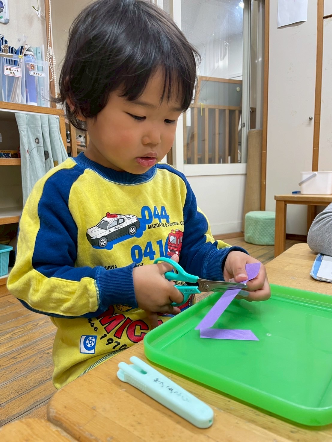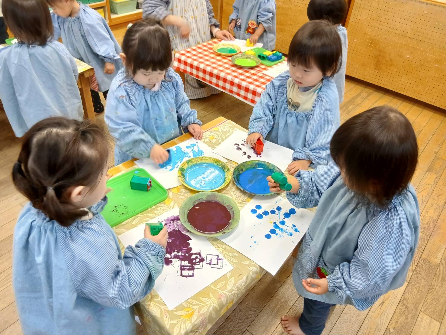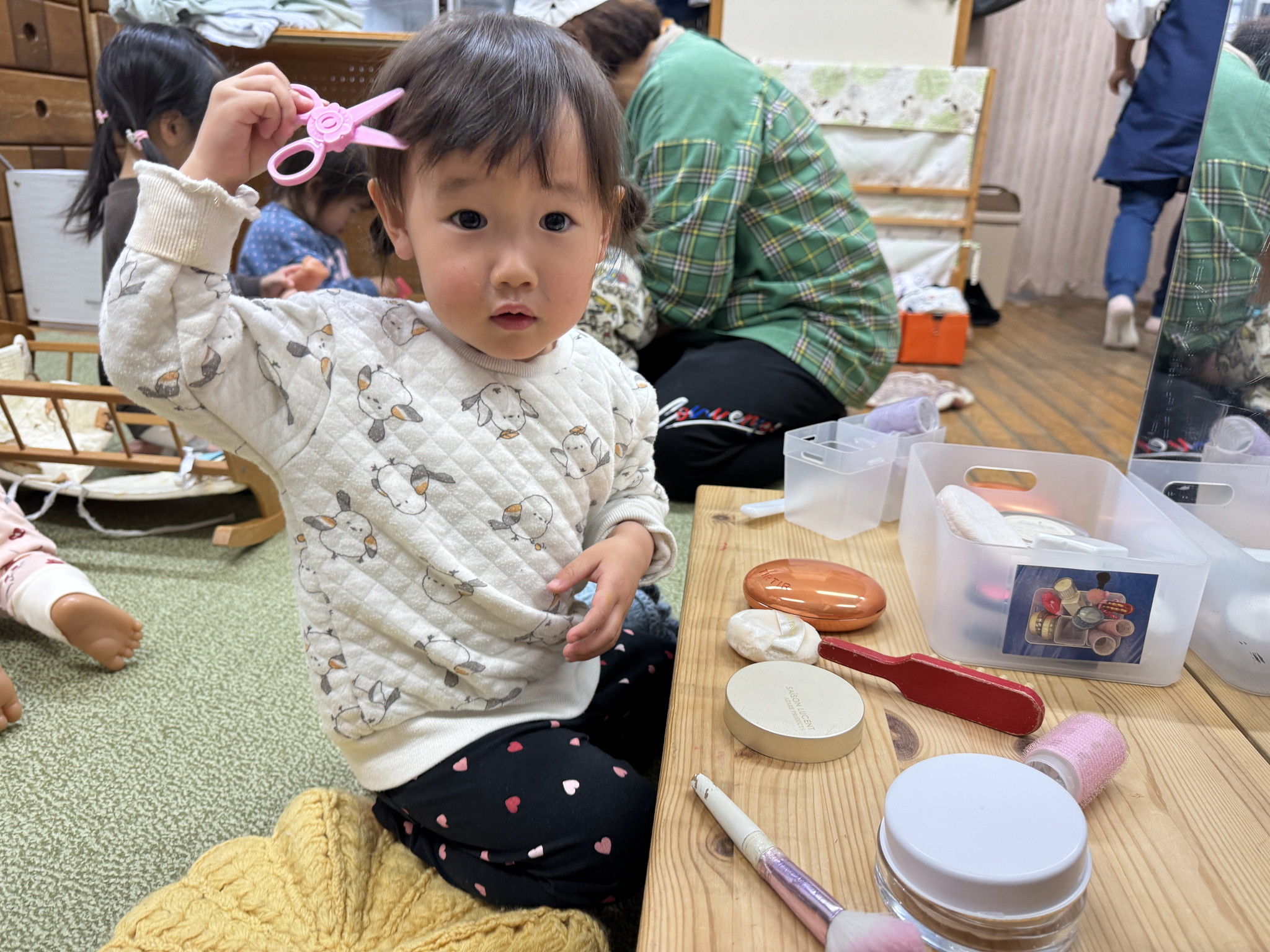 【 うさぎ 】 ボタンをはめて長~く魚をつなげるよ はさみでちょっきん はしごを登ってすべろう!一列に並んで順番だよ 大型積み木でお家作り 完成したら中に入って絵本タイム♪