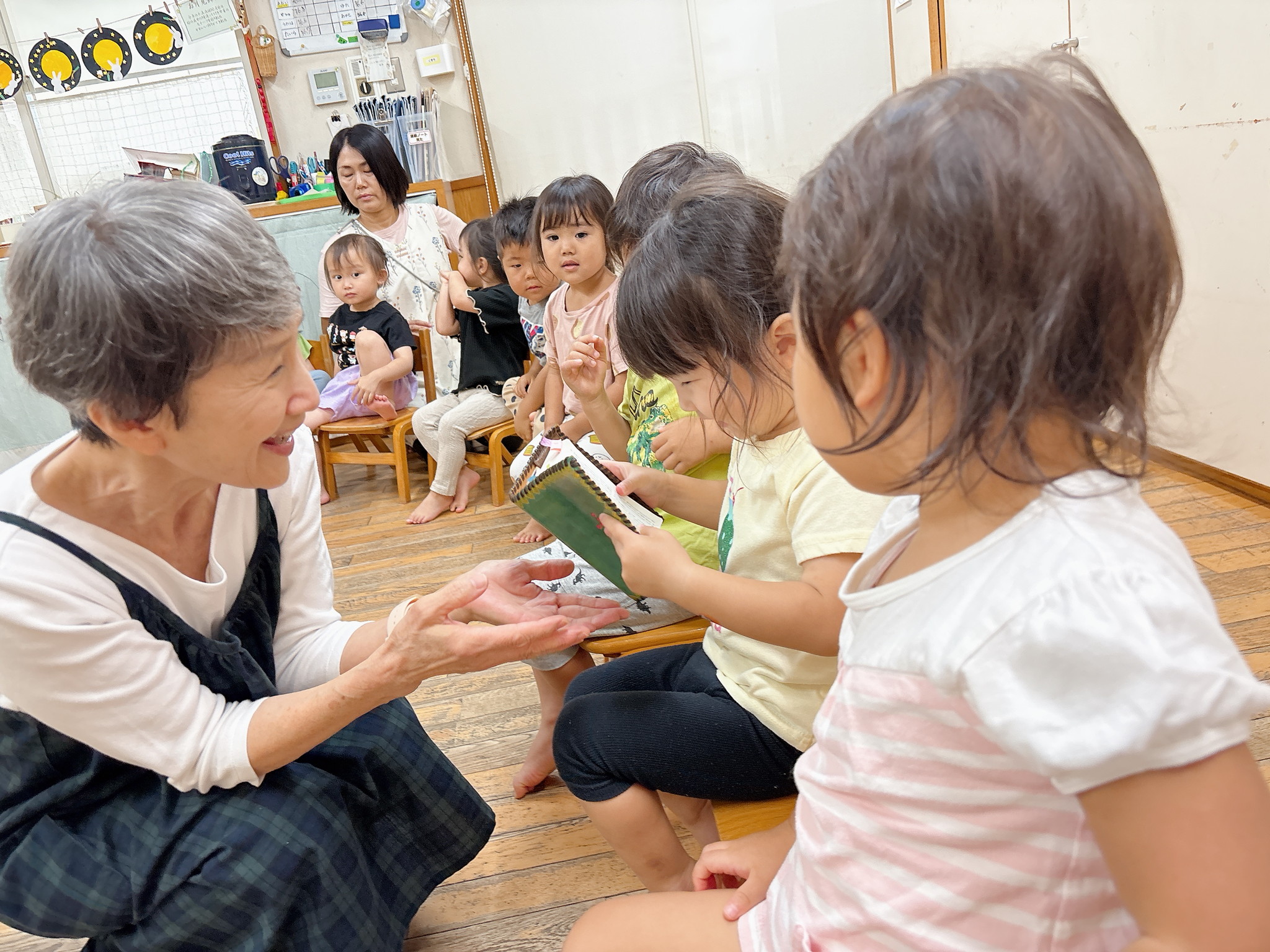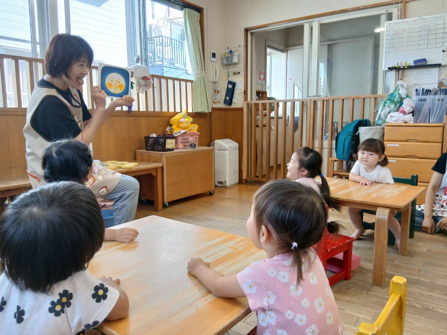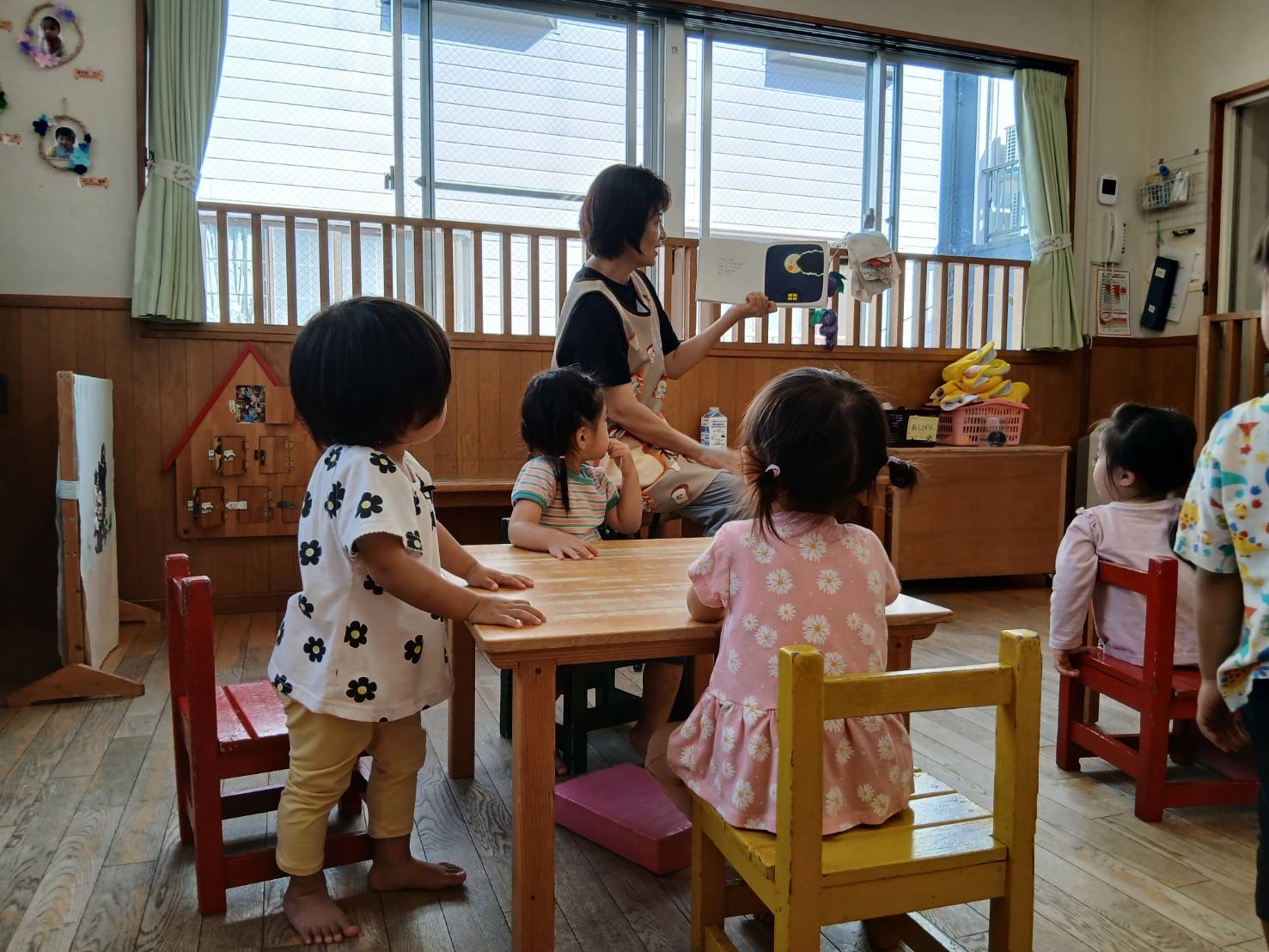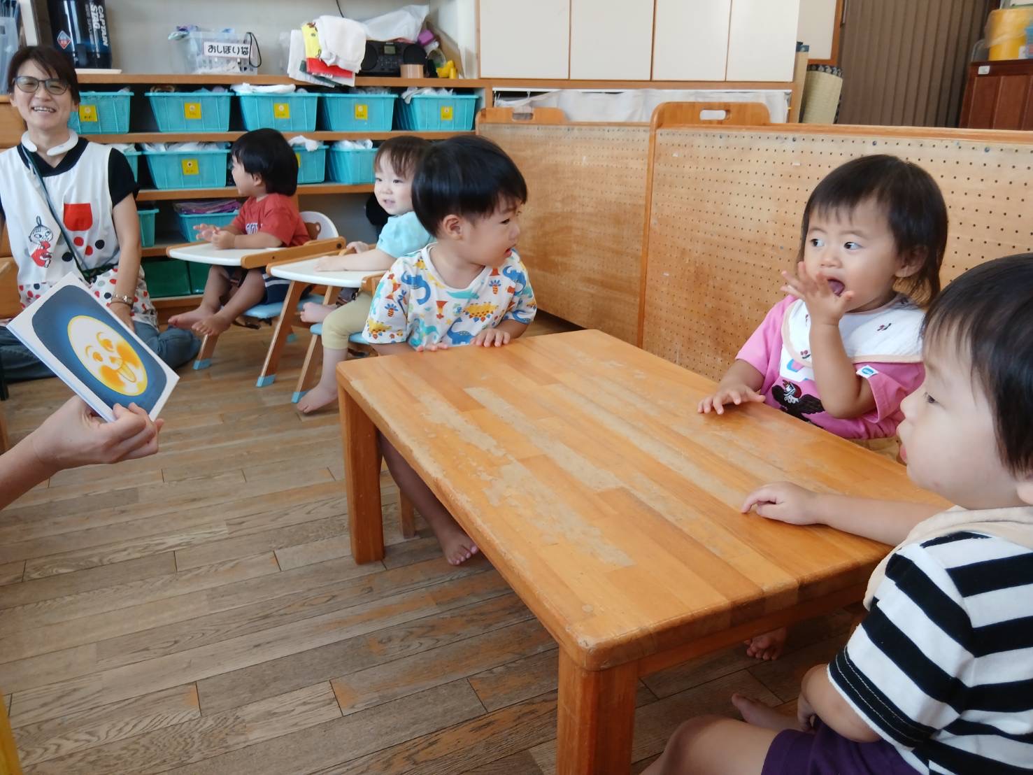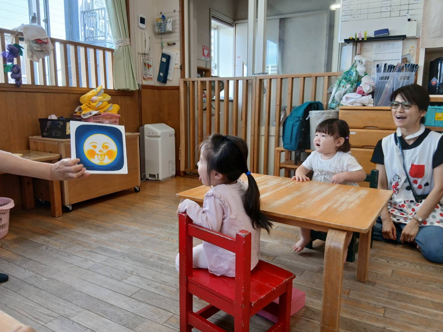【 あひる 】 今日は十五夜☆ “おつきさま こんばんは”の絵本をみたよ♪ おつきさまの顔を真似っこ^_^ あっかんべーが上手です