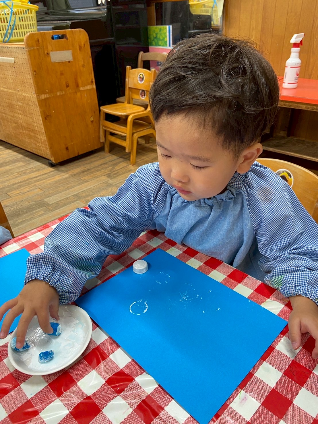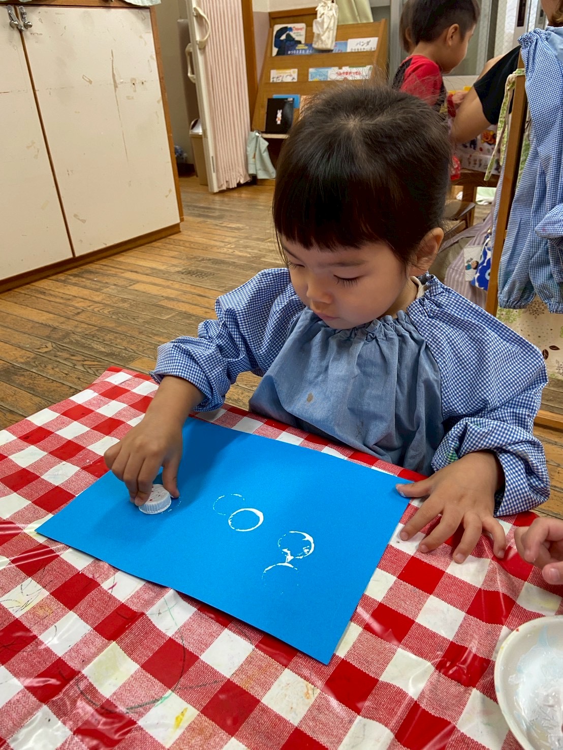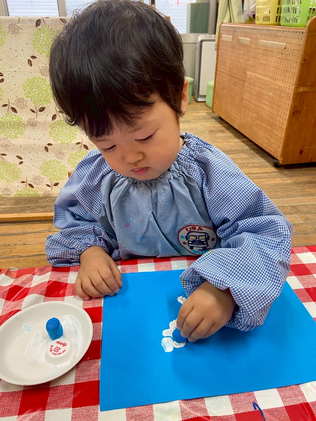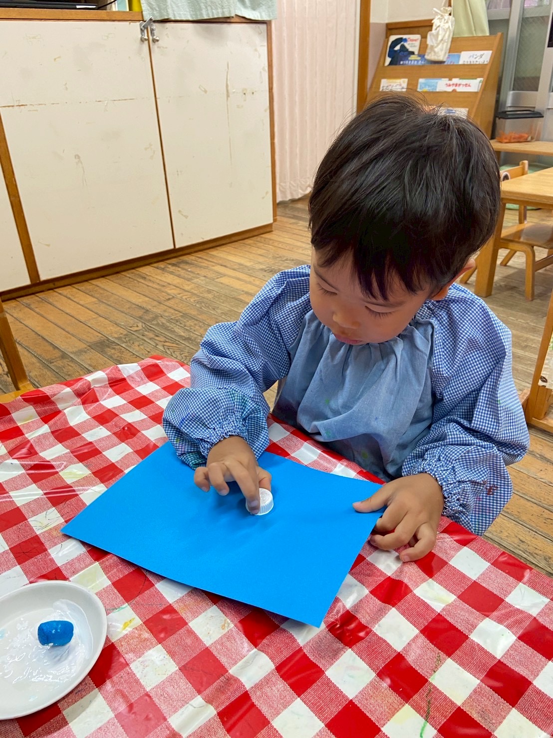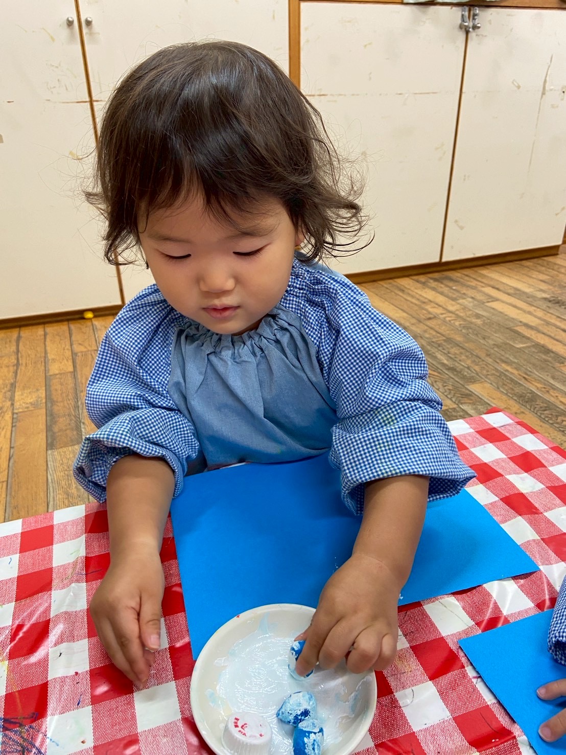 【 うさぎ 】 動物さんのおうち~ トランポリンでジャンプ! 絵の具を画用紙にペタペタ・・・どんな形が出てくるかな?
