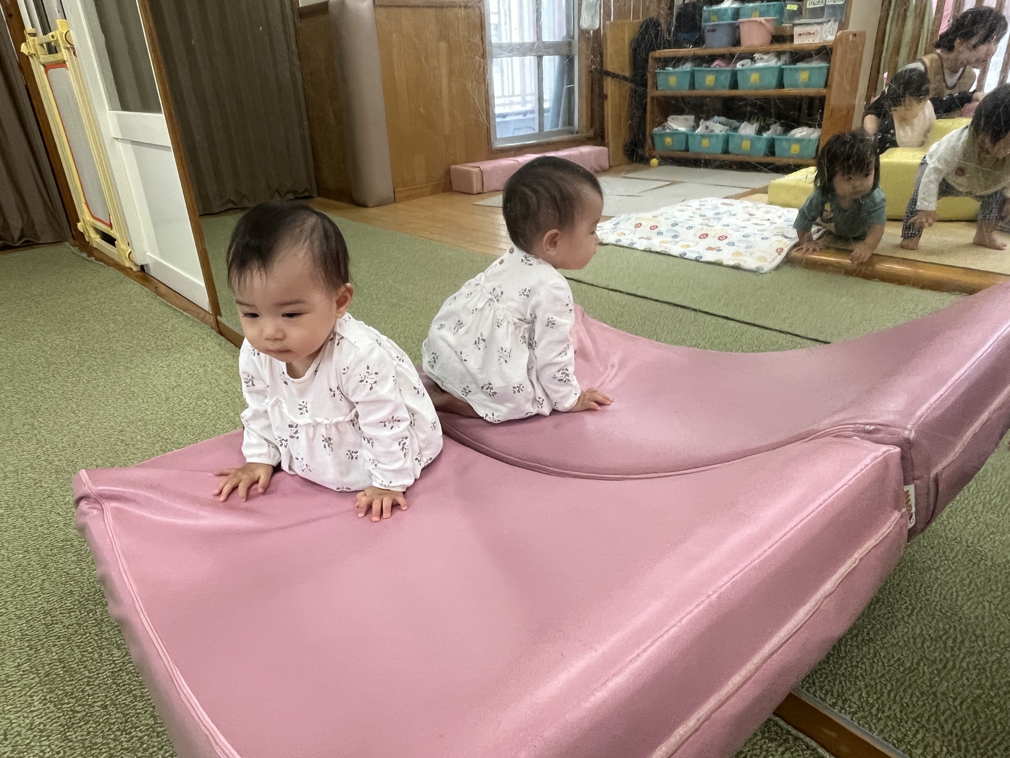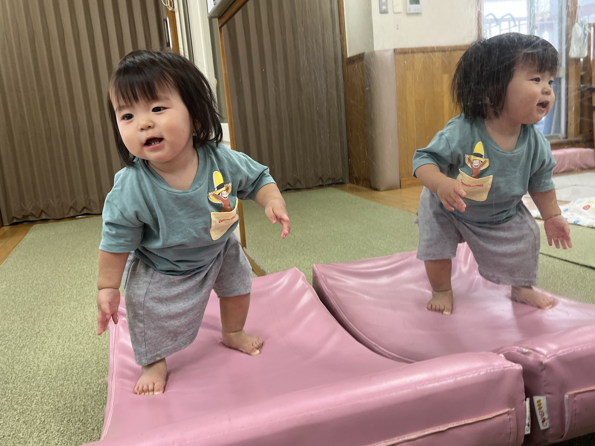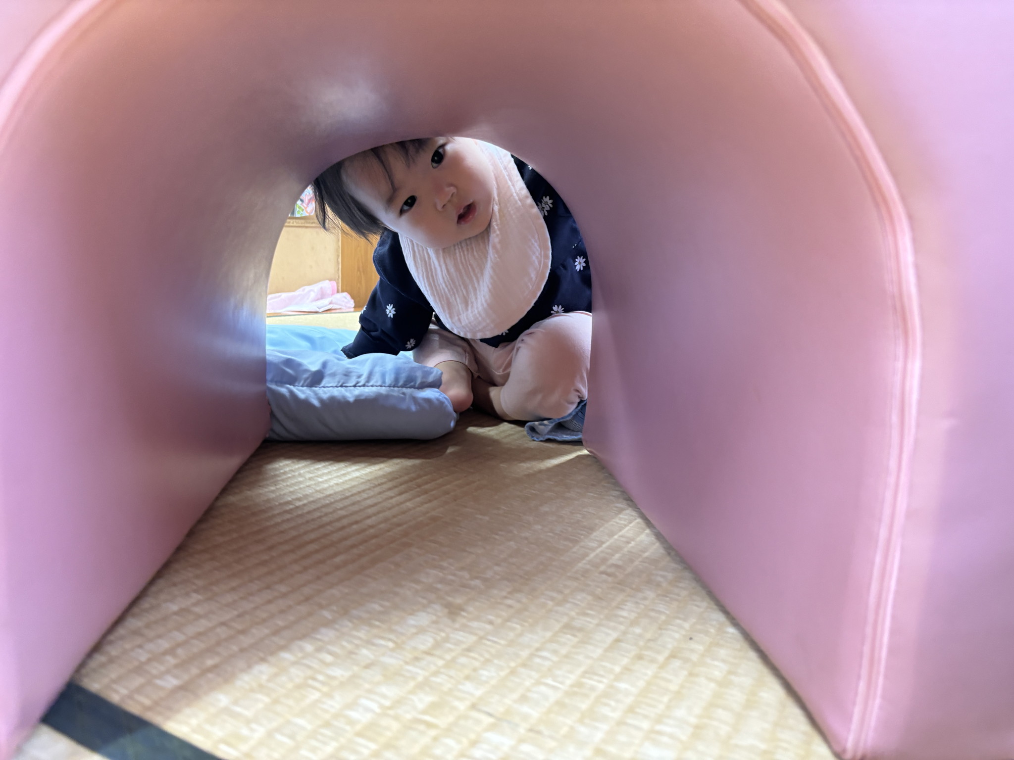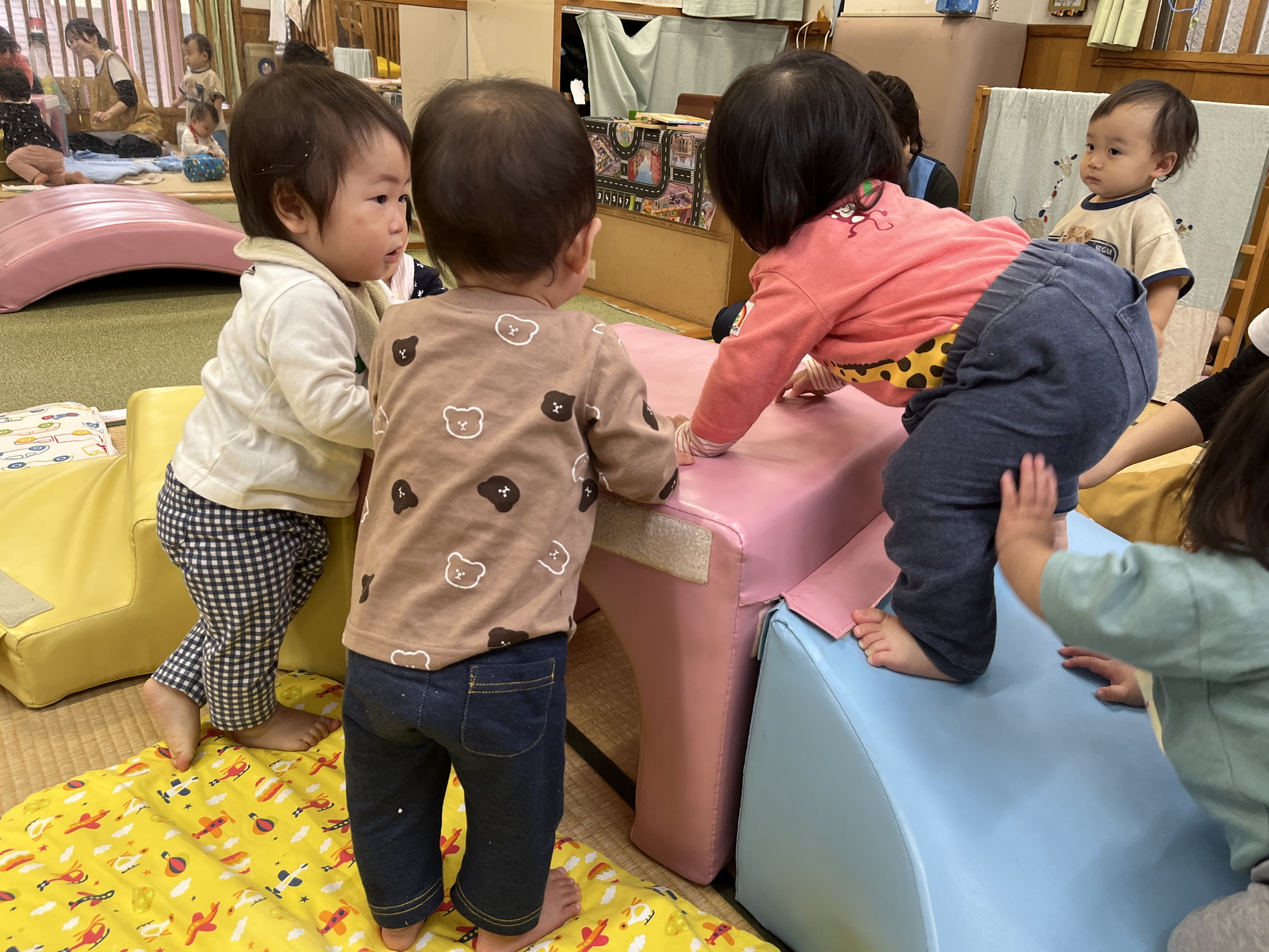 【 ひよこ 】 ハイハイランドであそびました! 高ーいところで立ちました☆ バランスバランス♪ つかまり立ちも上手になったね! いないいないばぁー^_^