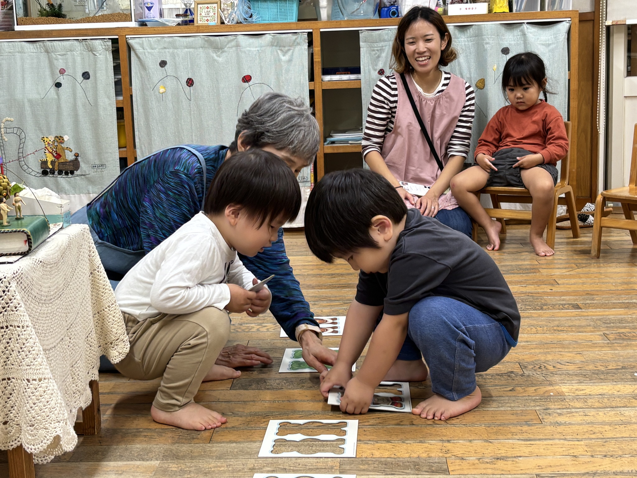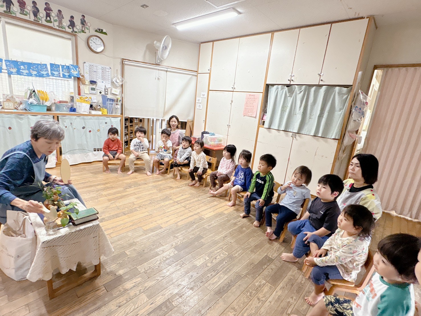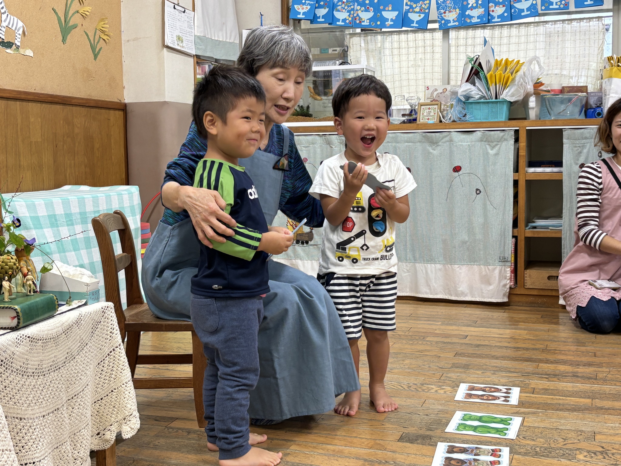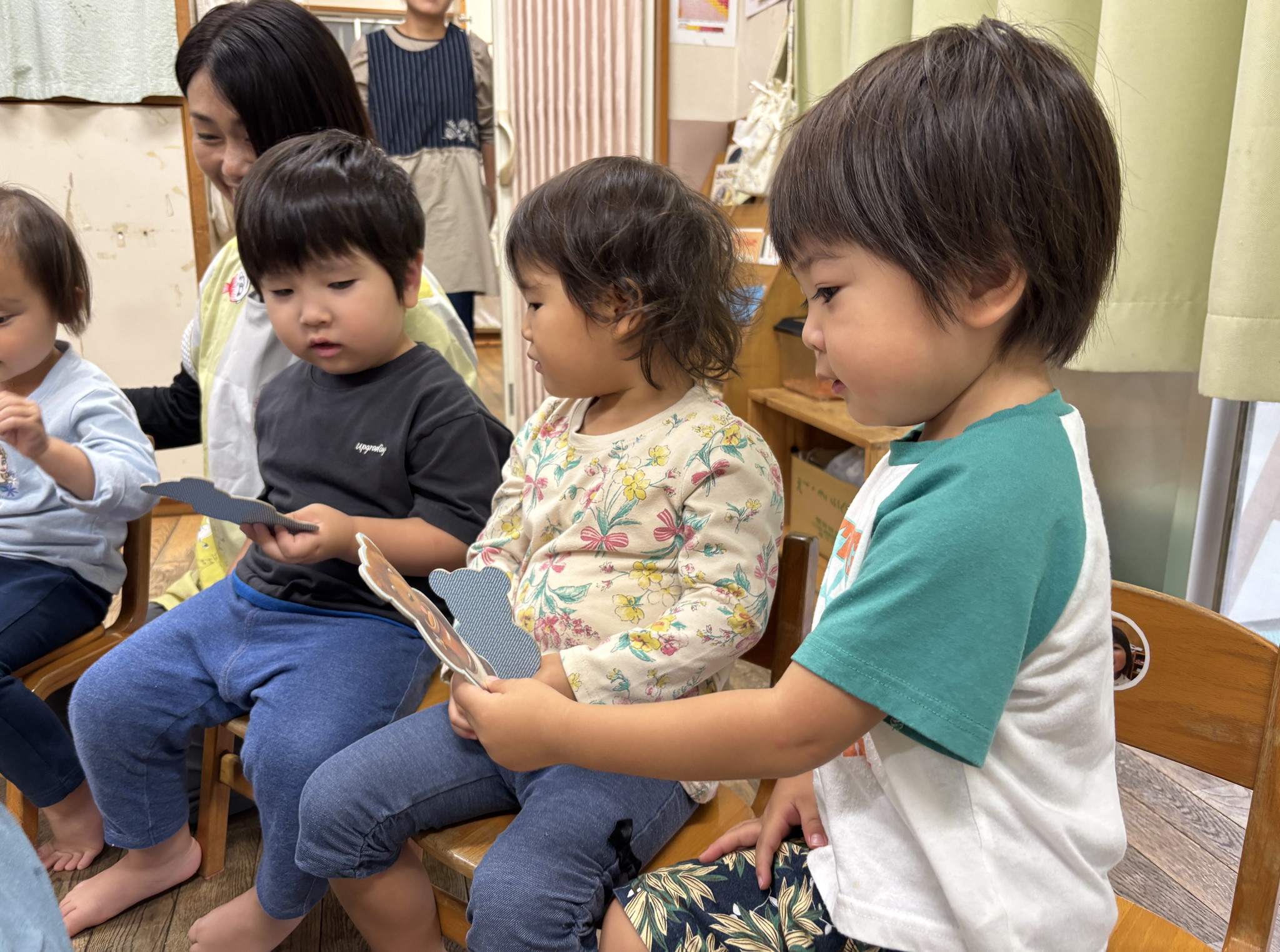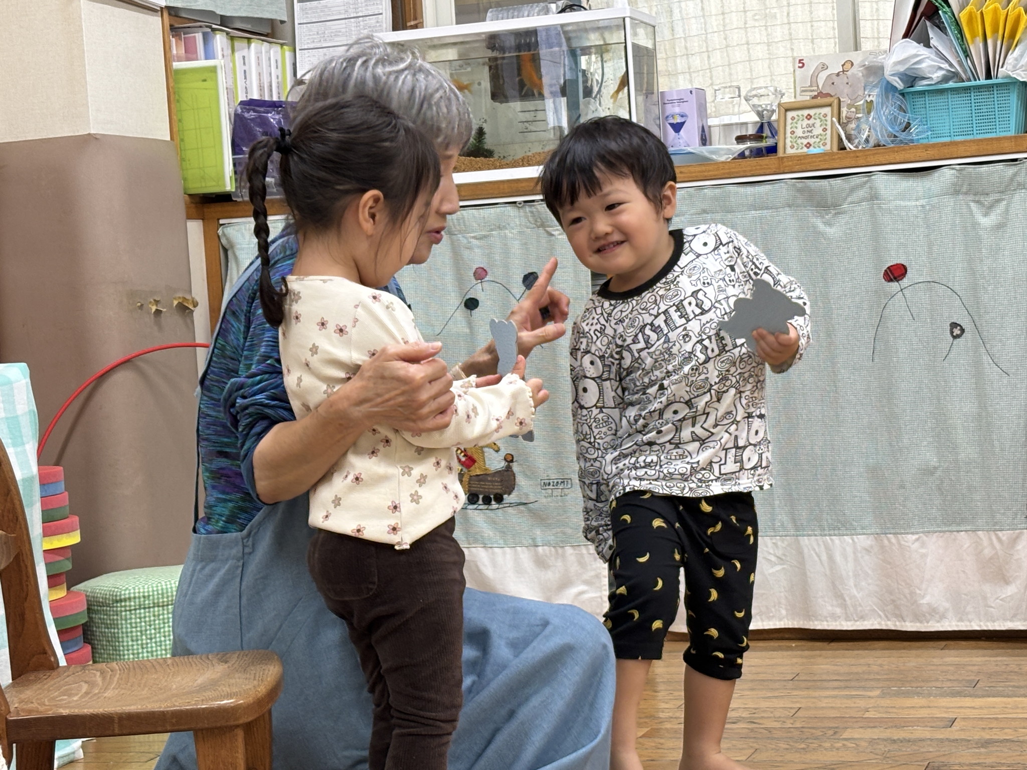【 うさぎ 】 2回目のお礼拝! アダムとイブのお話を聞きました 最後にミニゲーム くまさんを1枚えらんで・・・ 同じくまさんのカードの子のお名前言ってみよう! 最後は同じおうちにくまさんいれるよ