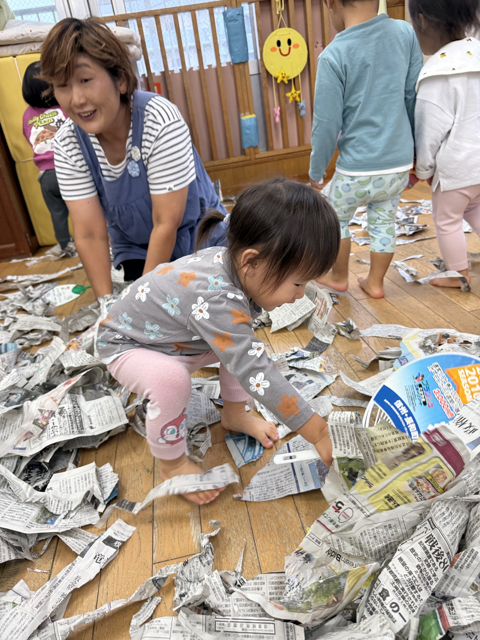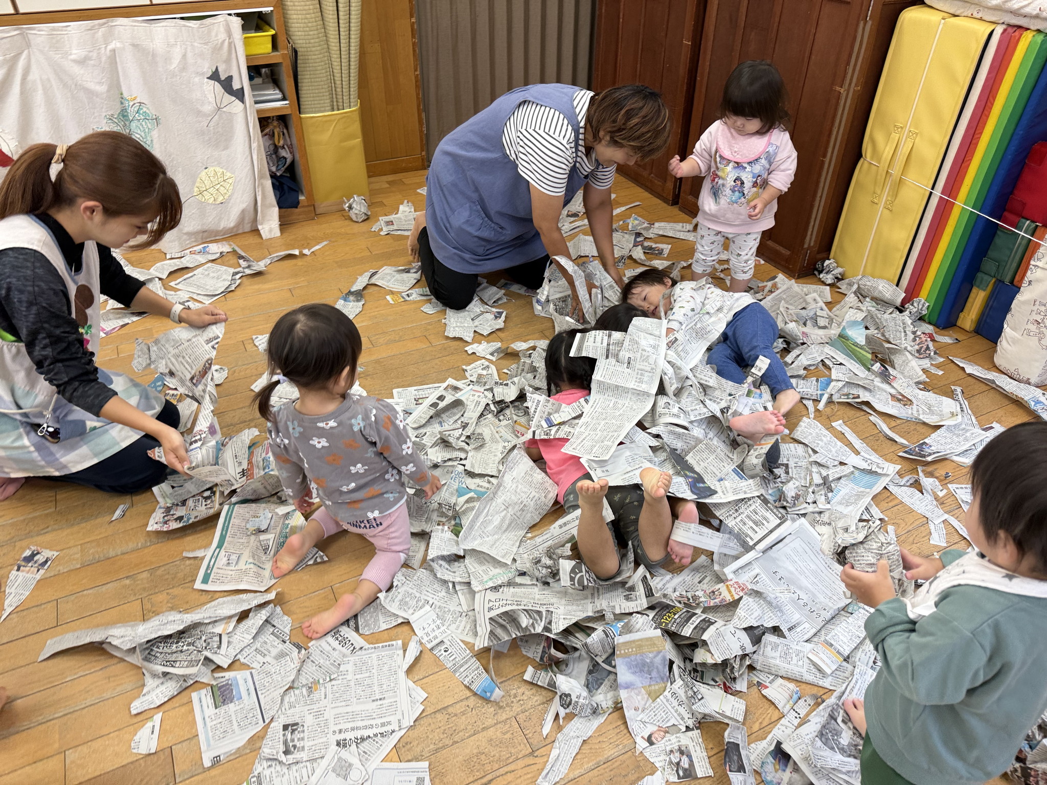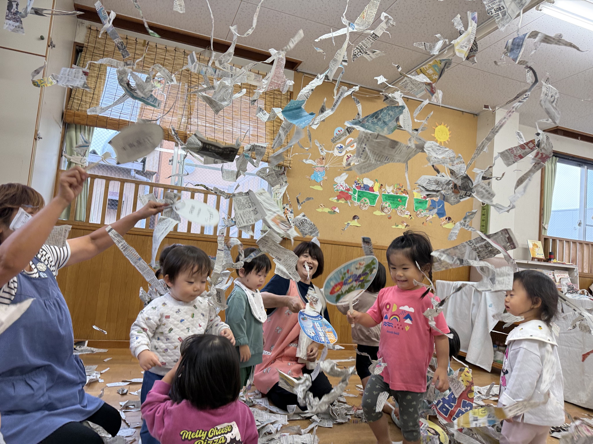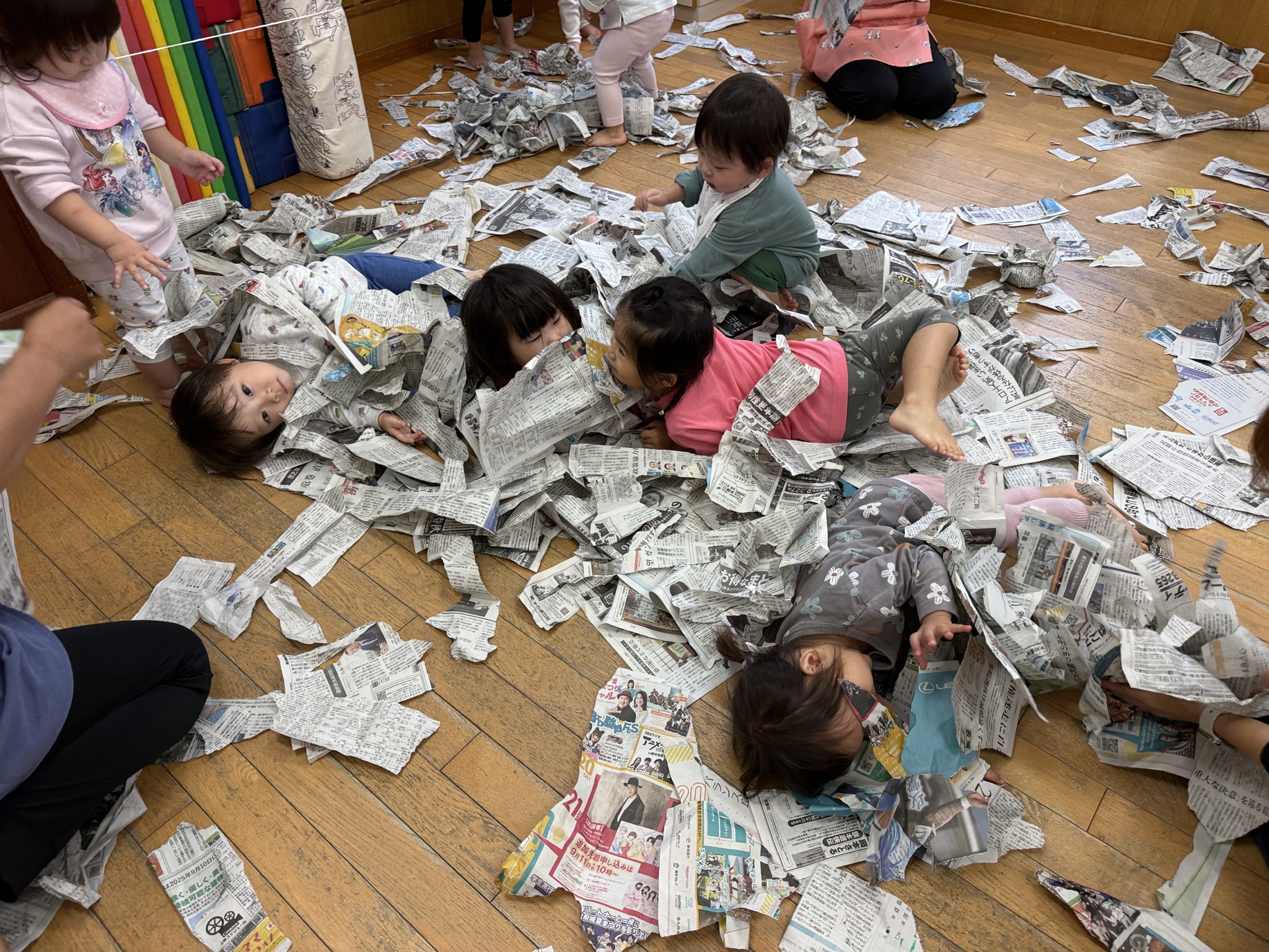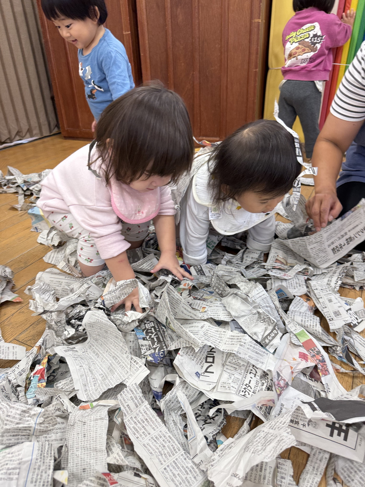 【 あひる 】 新聞紙あそびをしたよ たくさんちぎったよ! 新聞の上にタイブ わぁーたくさん降ってきたー たのしくあそびました