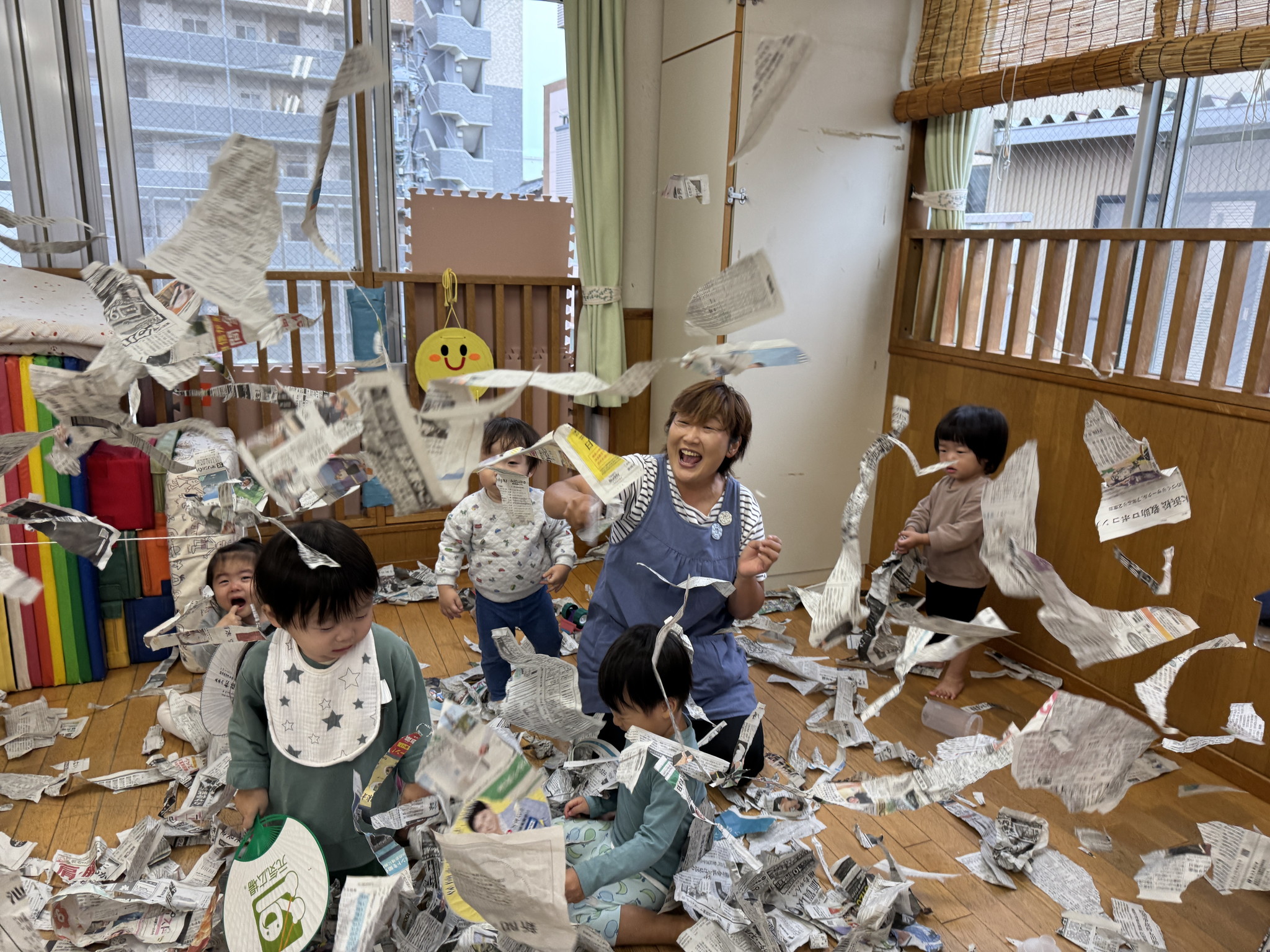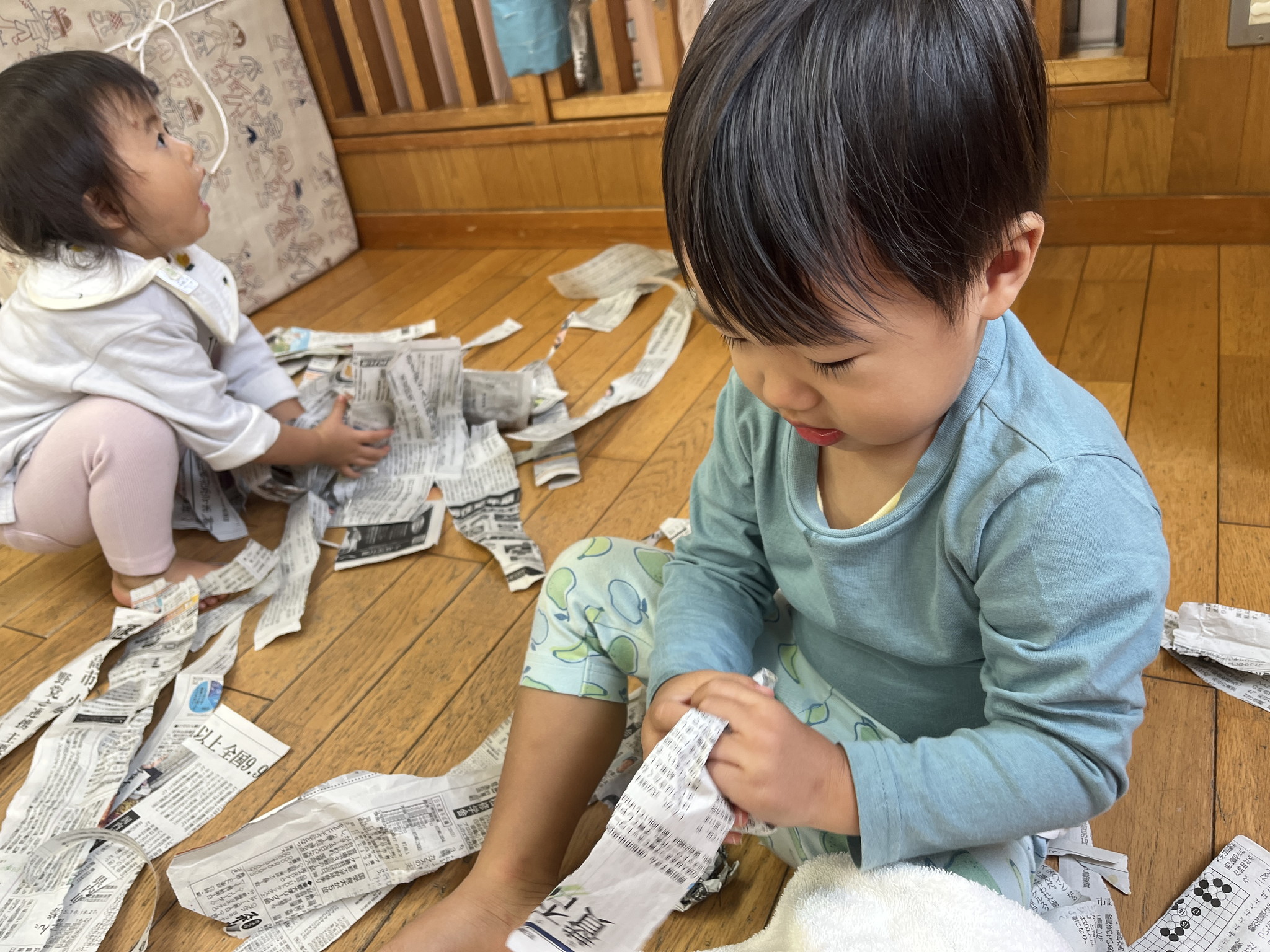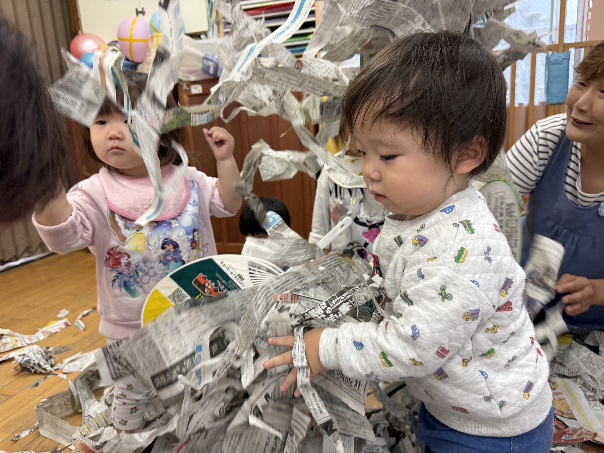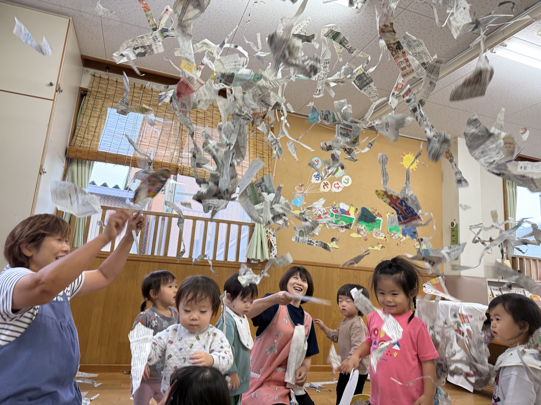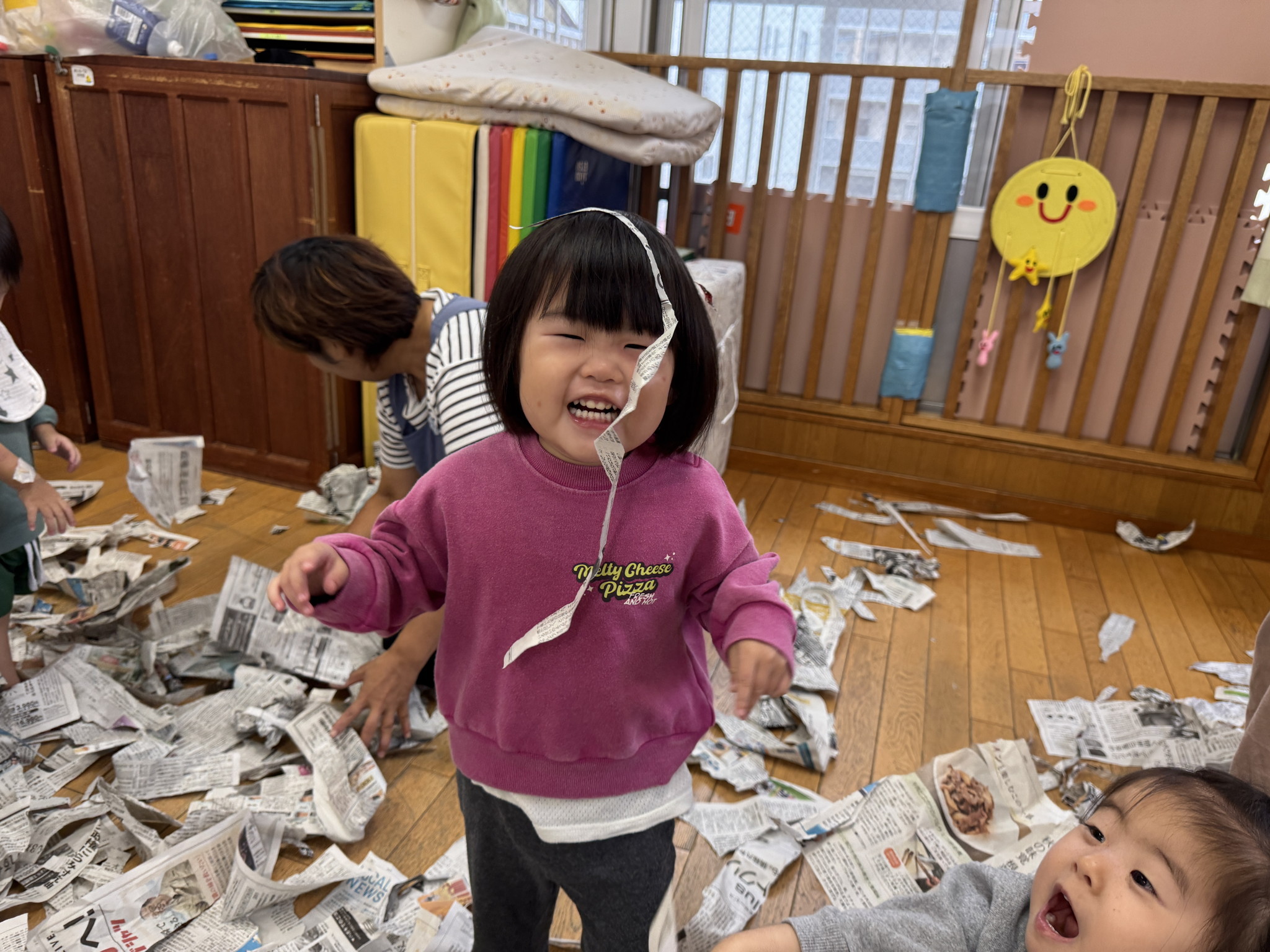 【 あひる 】 新聞紙あそびをしたよ たくさんちぎったよ! 新聞の上にタイブ わぁーたくさん降ってきたー たのしくあそびました