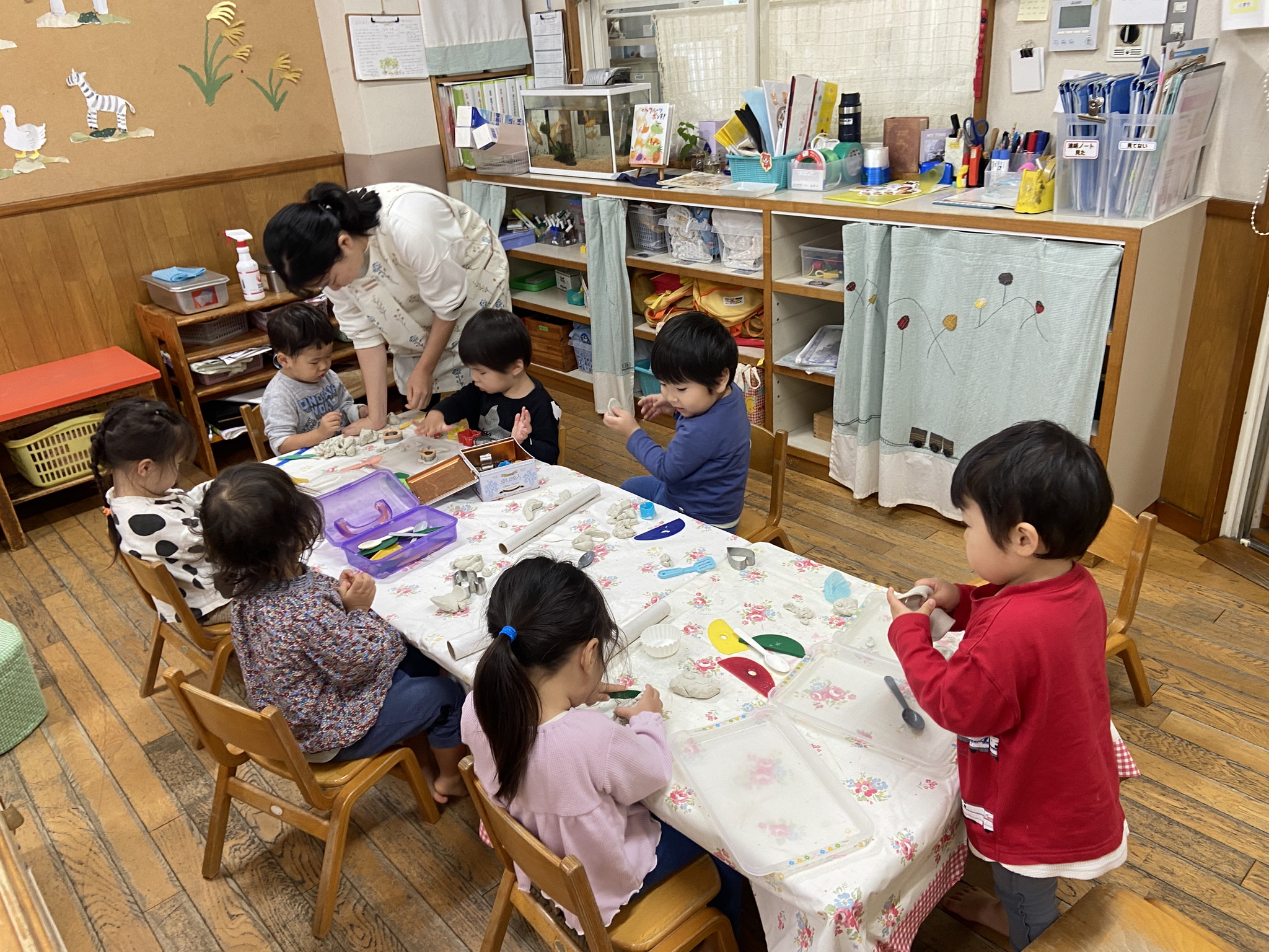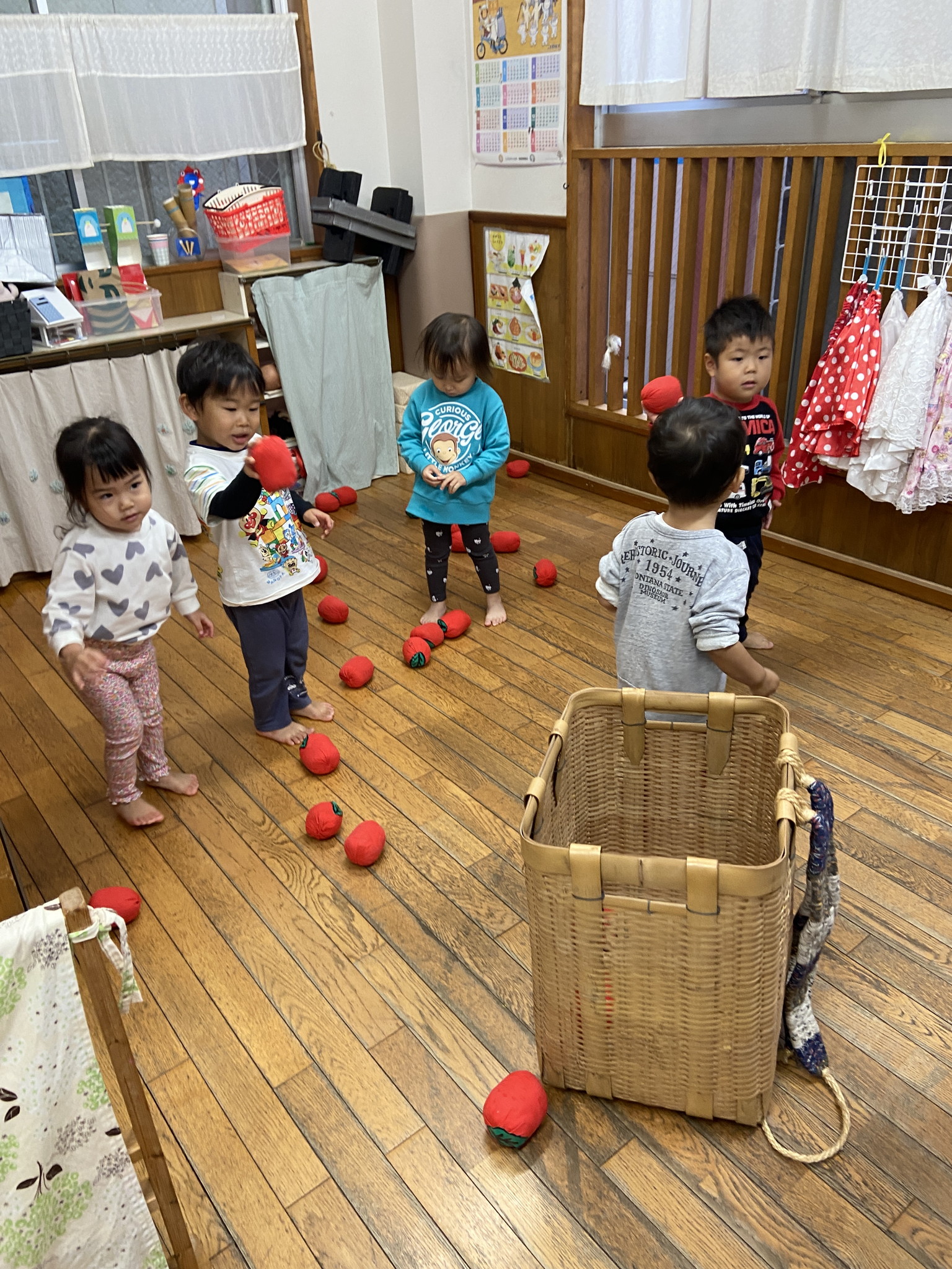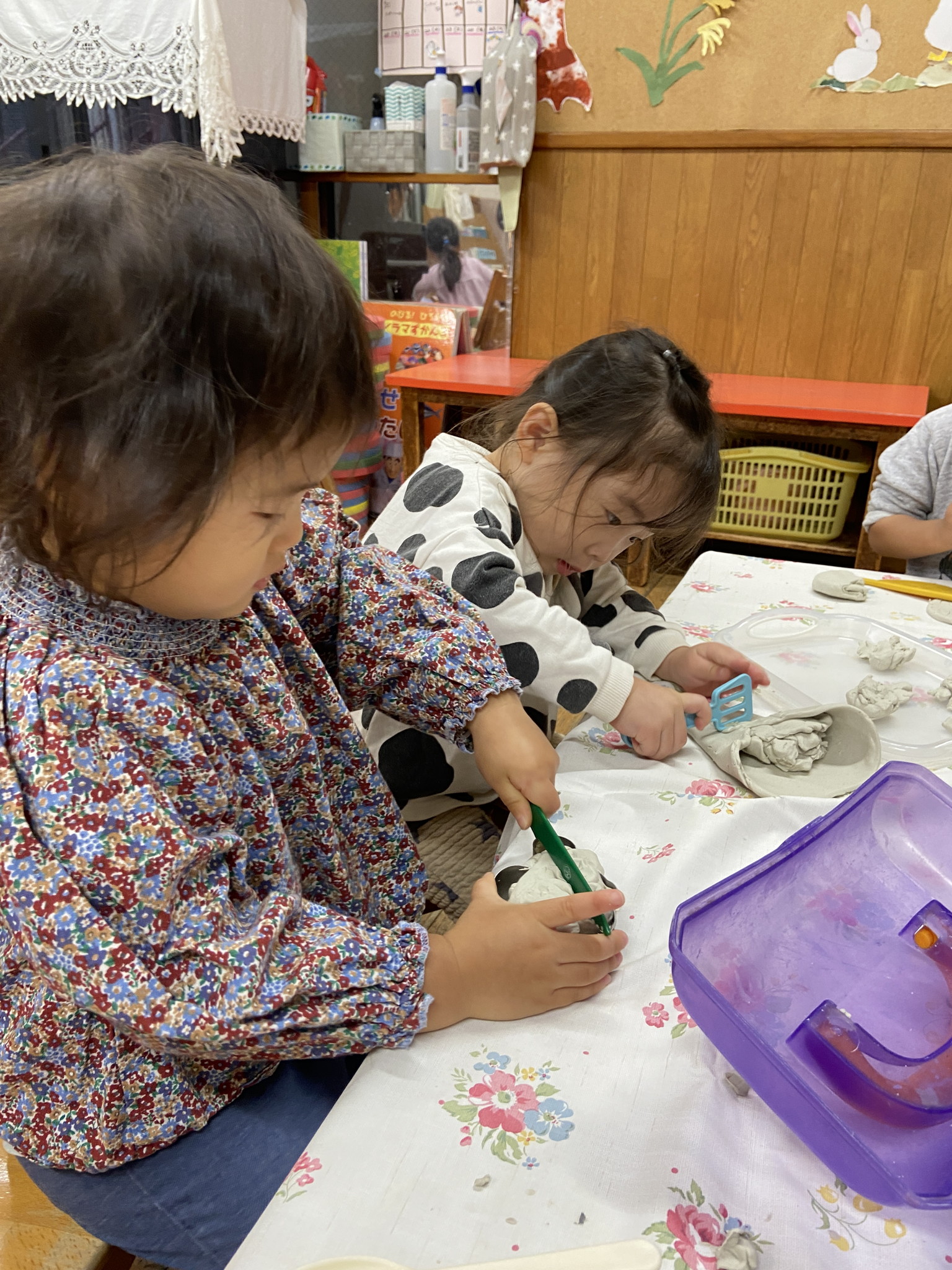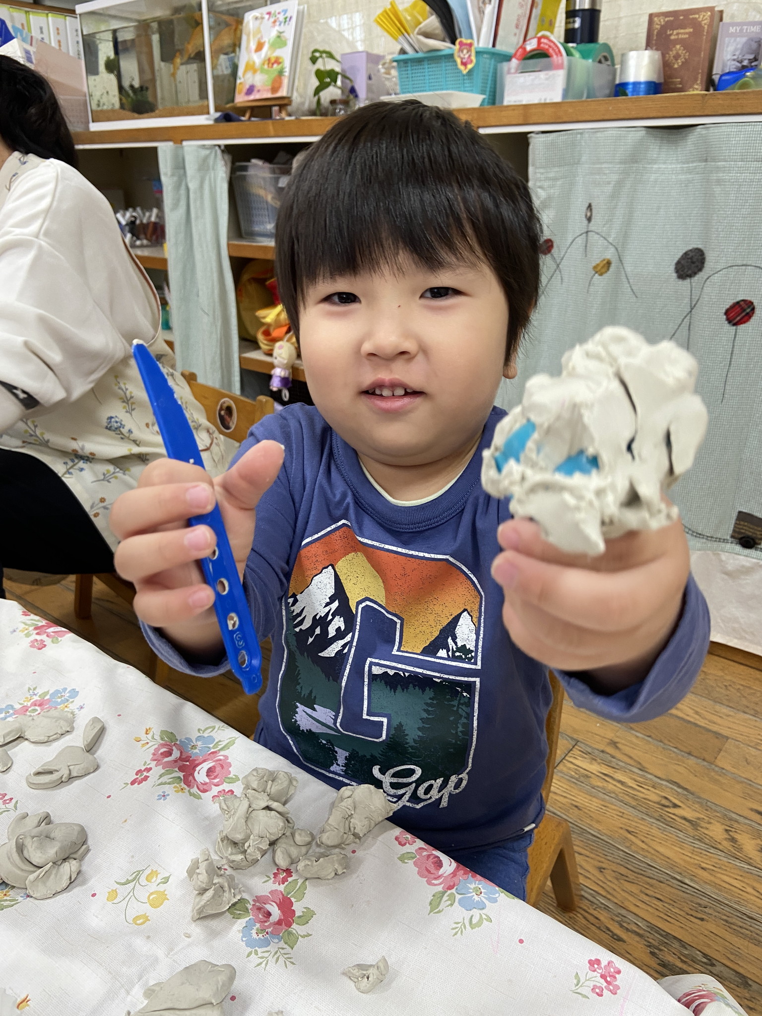 【 うさぎ 】 粘土遊びをしたよ 真剣なおかお・・・ かんせ~い! りんご拾いスタート 全部拾えたよ! ようじろう先生おたんじょうびおめでとう! ちあき先生に栄養のお話をしてもらったよ