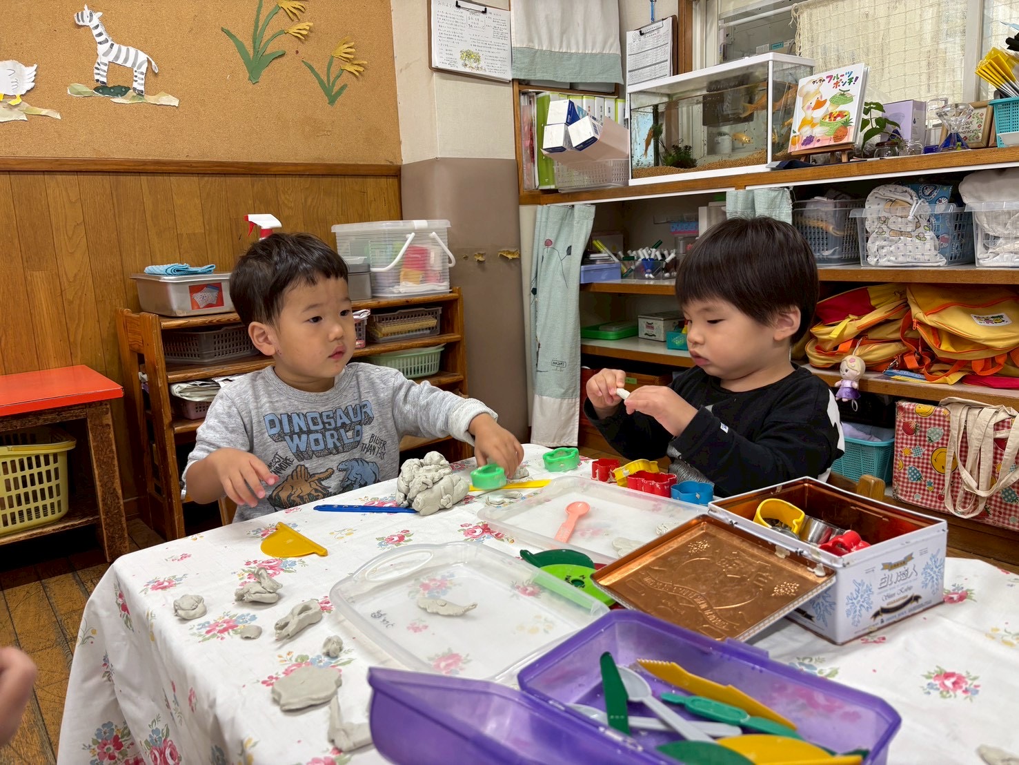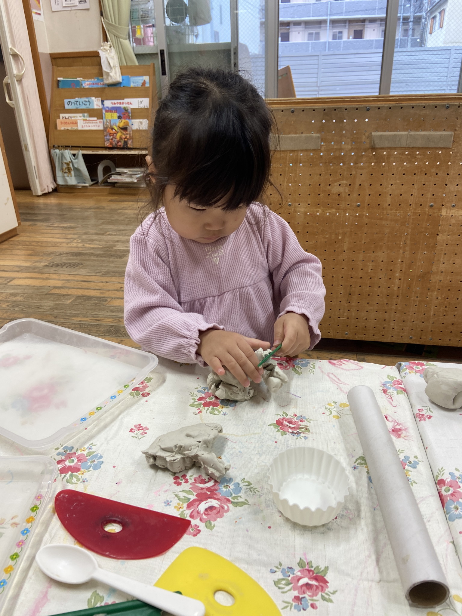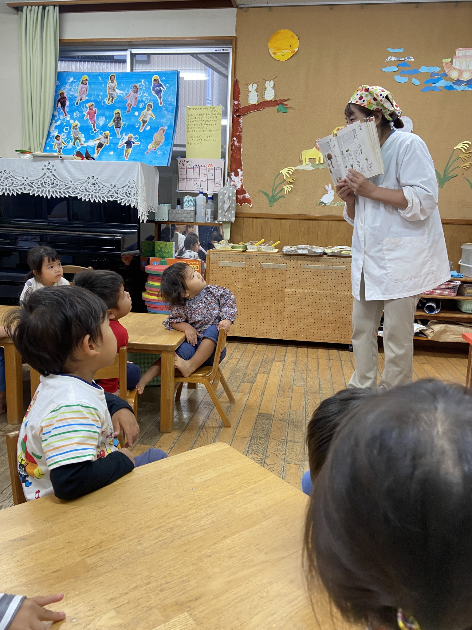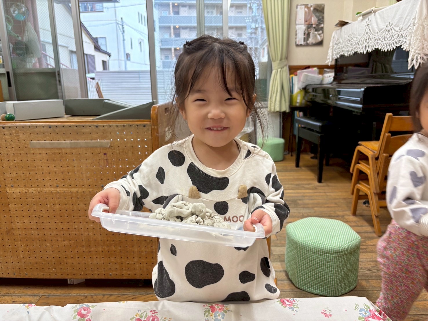 【 うさぎ 】 粘土遊びをしたよ 真剣なおかお・・・ かんせ~い! りんご拾いスタート 全部拾えたよ! ようじろう先生おたんじょうびおめでとう! ちあき先生に栄養のお話をしてもらったよ