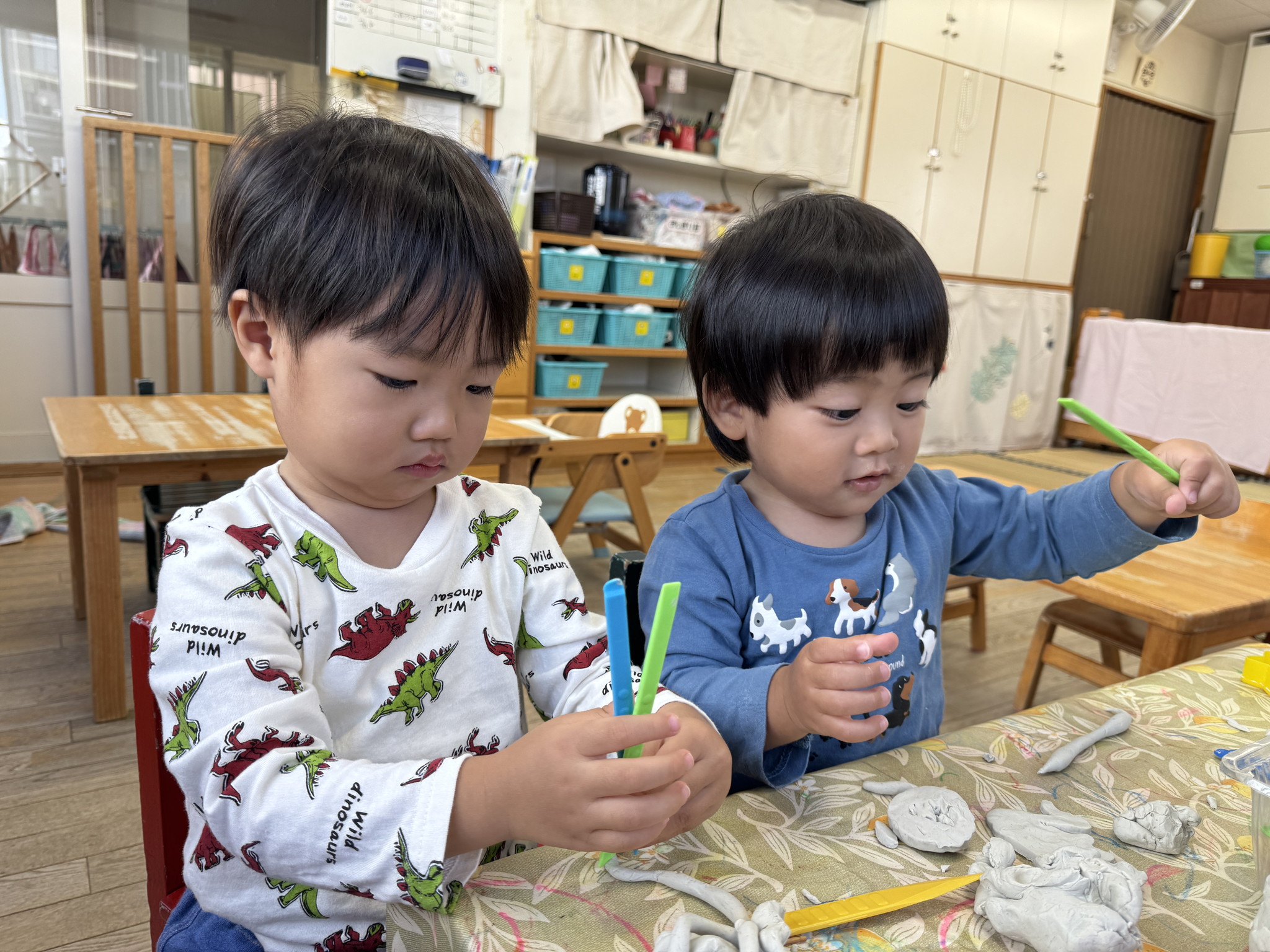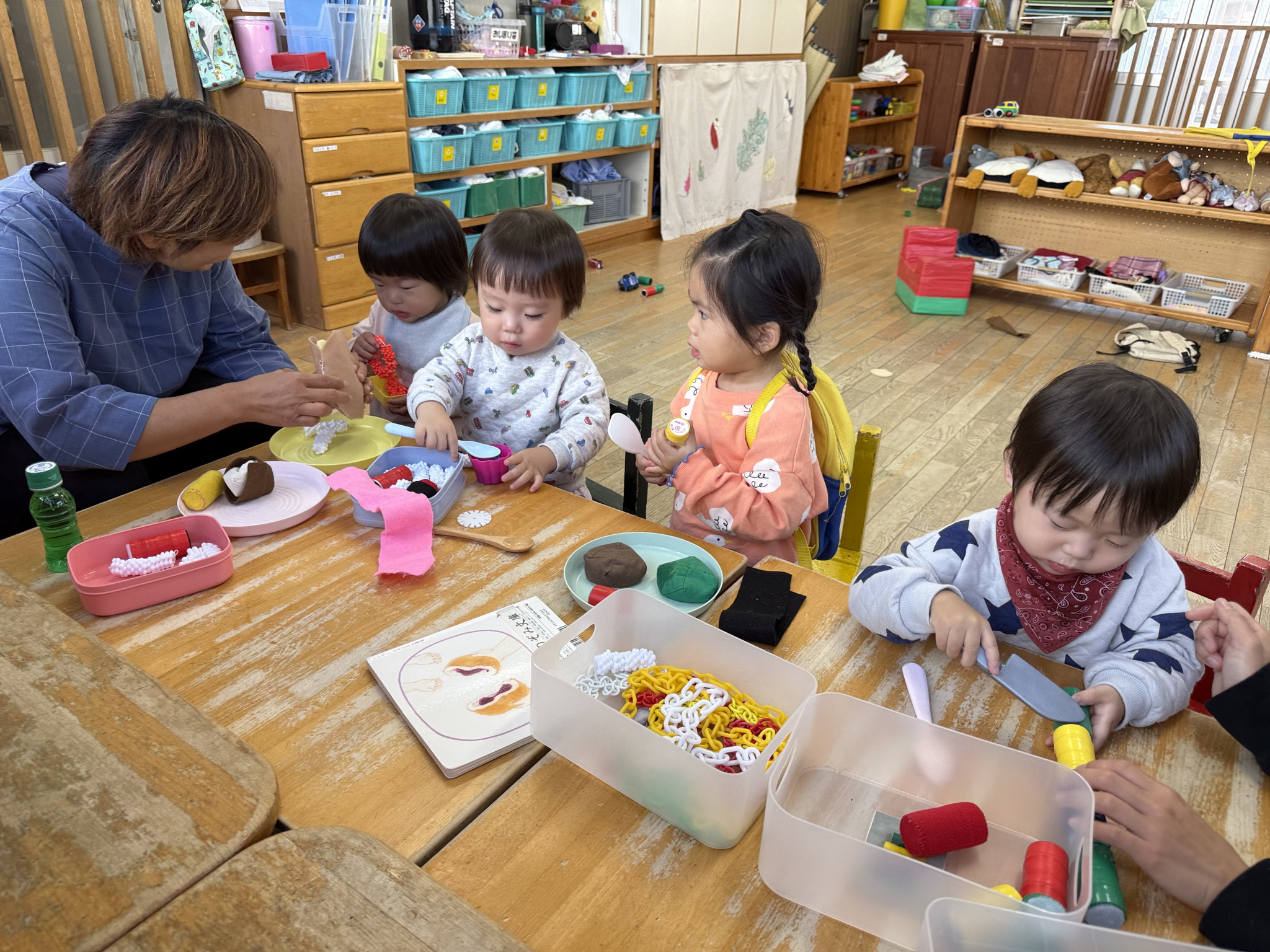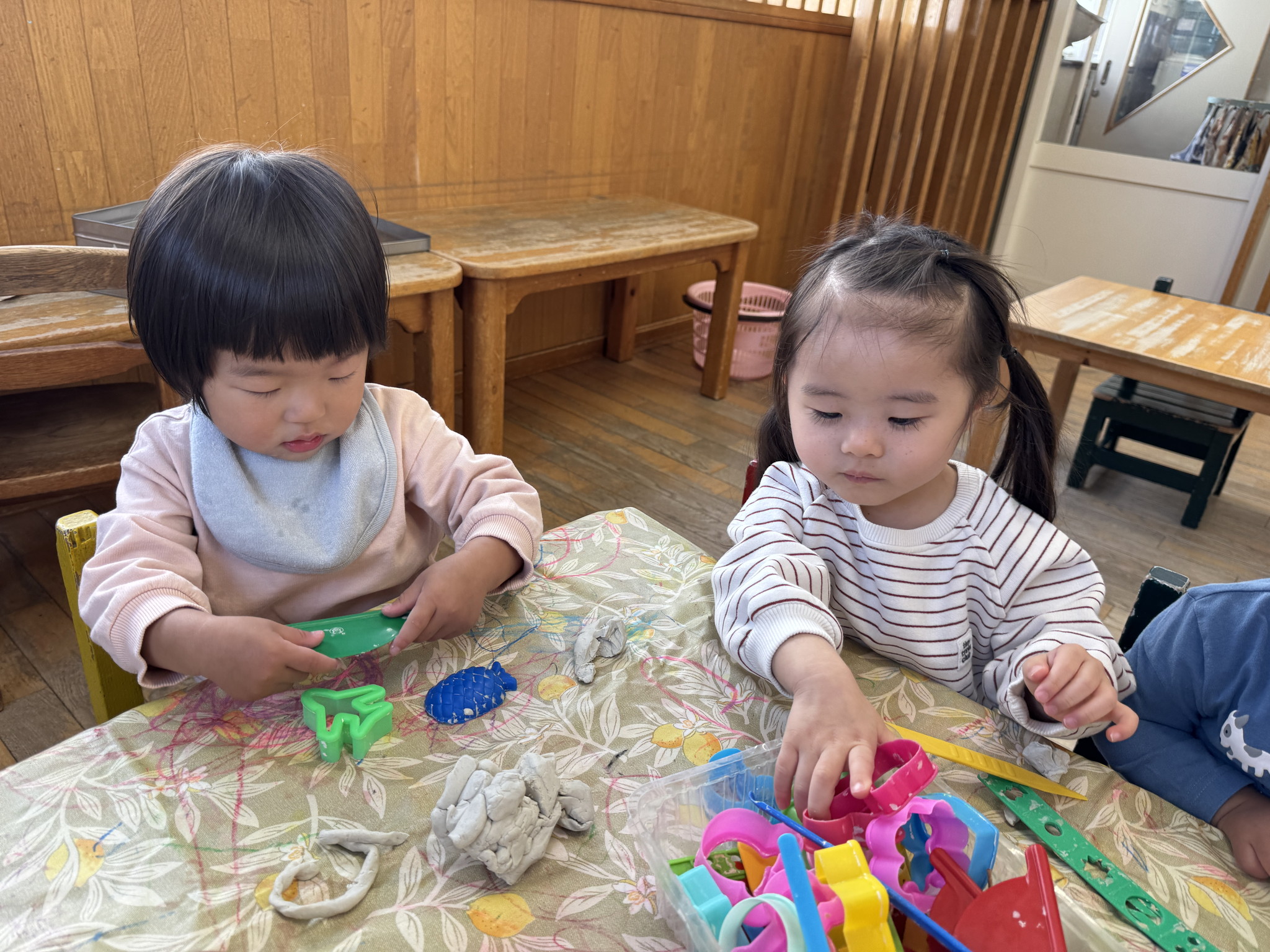 【 あひる 】 あひる食堂です! どの型使おうかな? ねんど遊び楽しいね キレイなお花を見つけたよ 先生も食べる? なにができあがるんだろう!