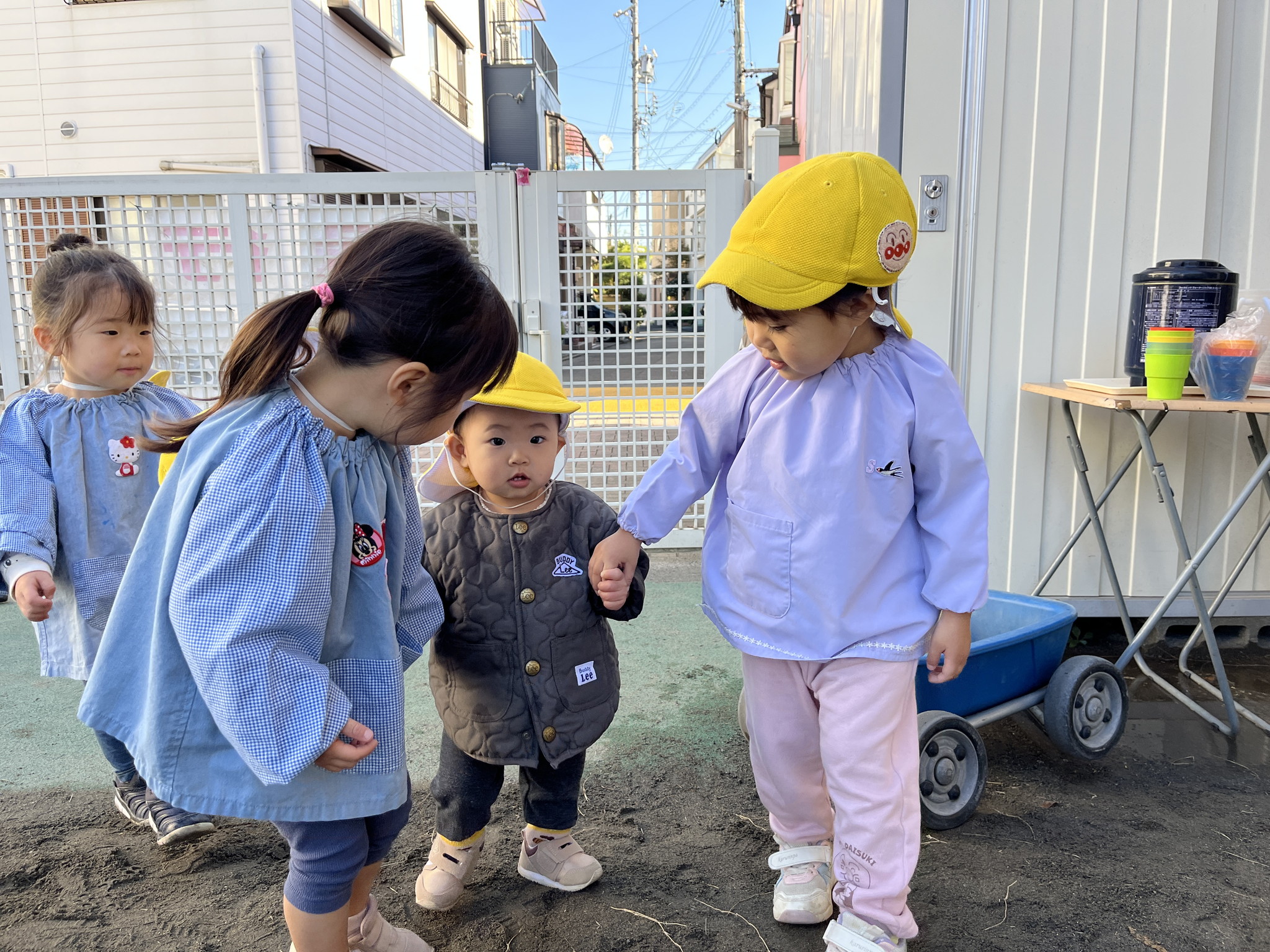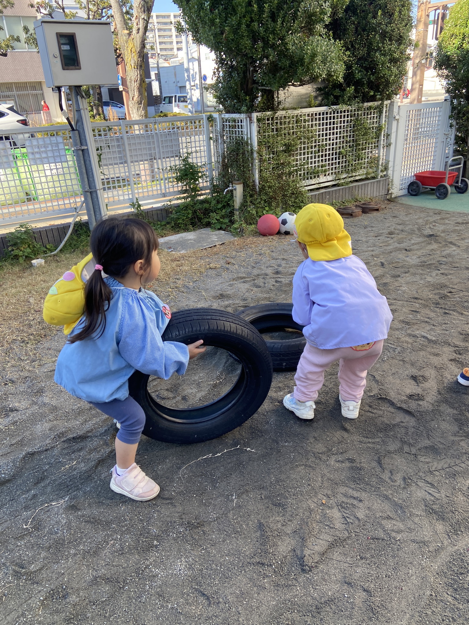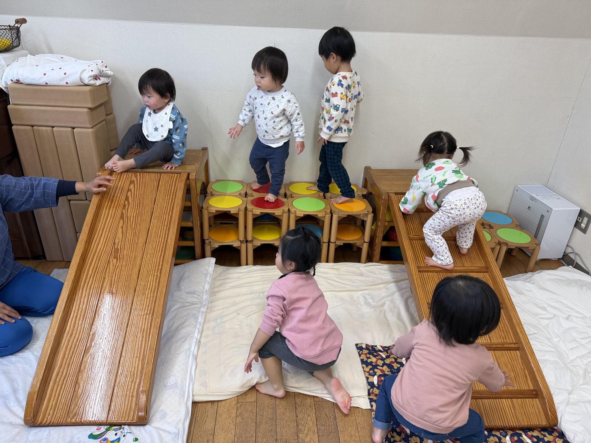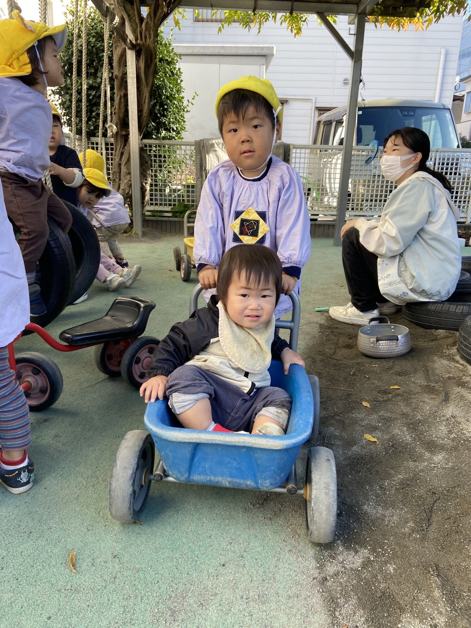 【 ひよこ 】 お友だち大集合^皿^ クリスマスツリーみ~つけた 赤い葉っぱ、きれいだね おさかなさんいた! 押して押して~ お姉さんたちが優しくエスコート♡