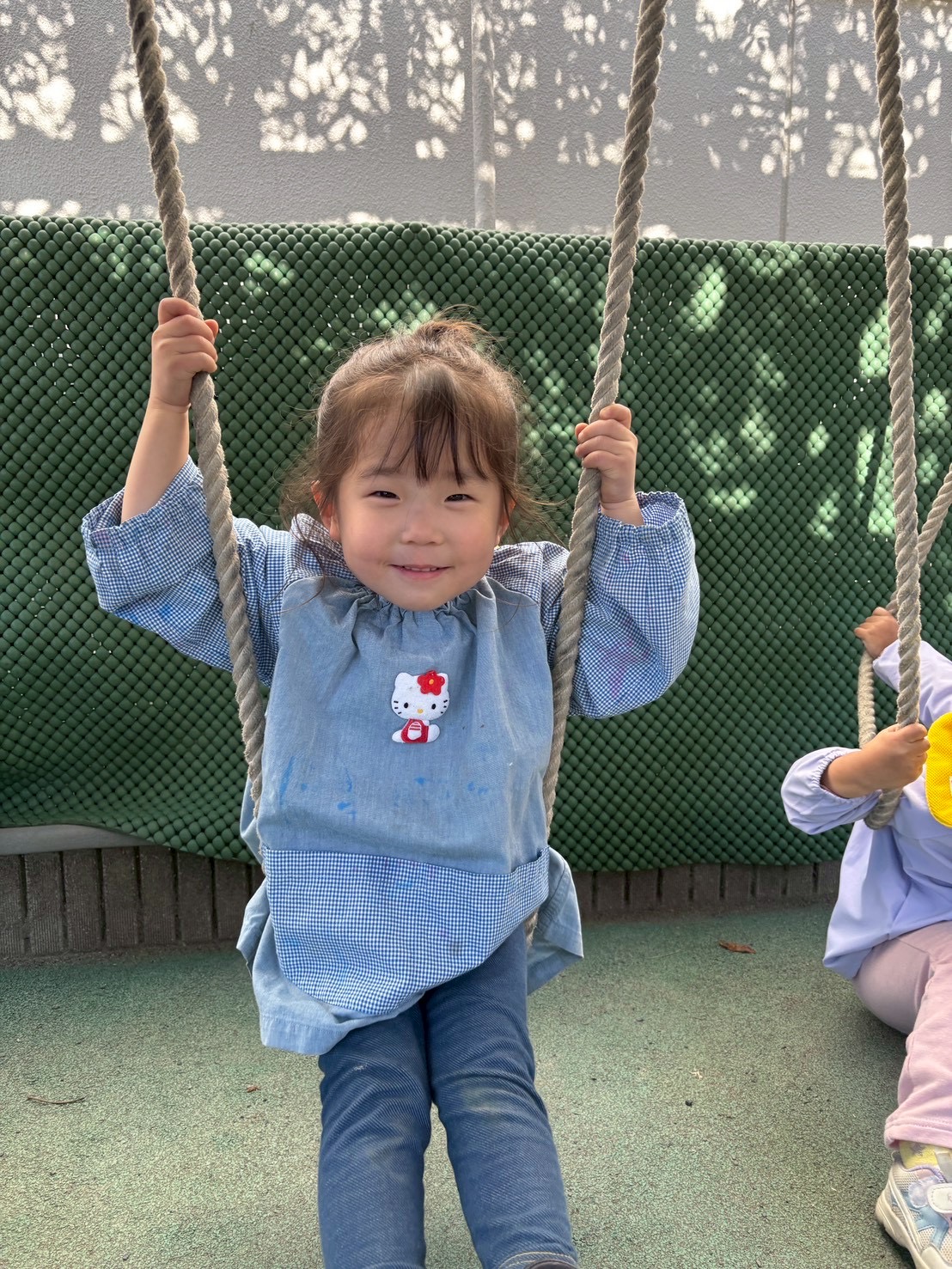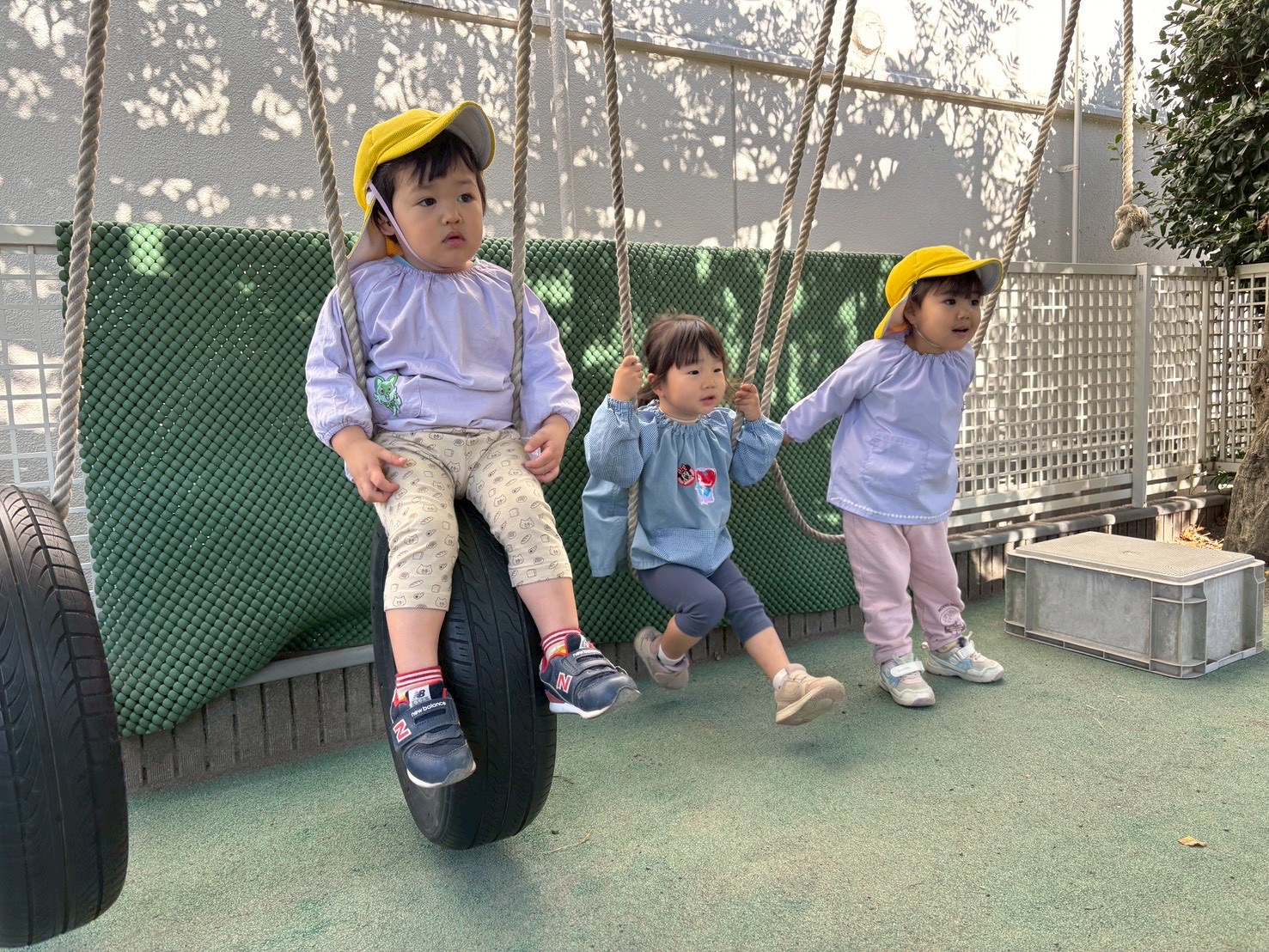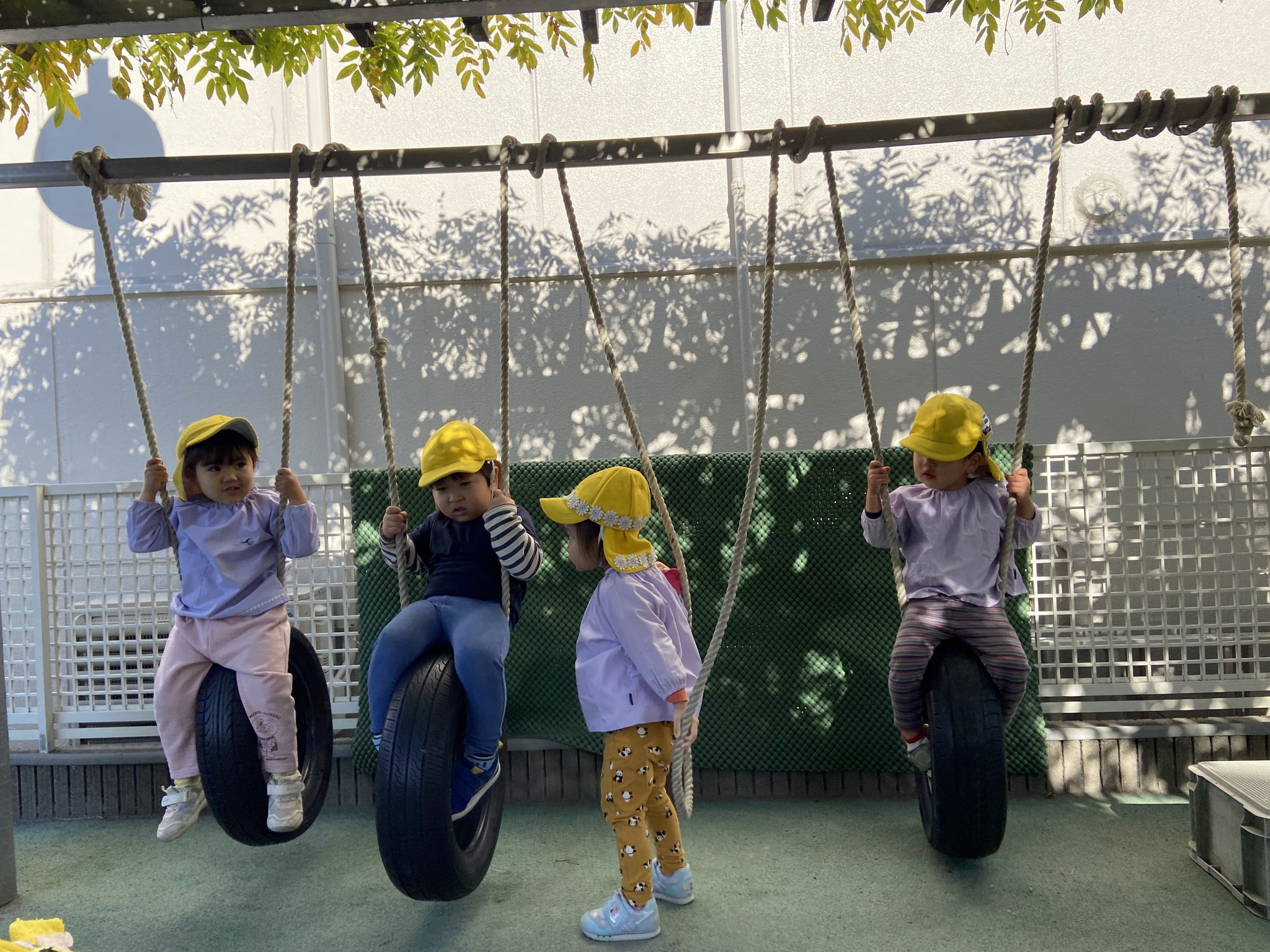 【 うさぎ 】 タイヤを運んでブランコ作りのお手伝い まだかなー ブランコ完成! ブランコ大好き! ひよこぐみさんとも仲良くあそんだよ