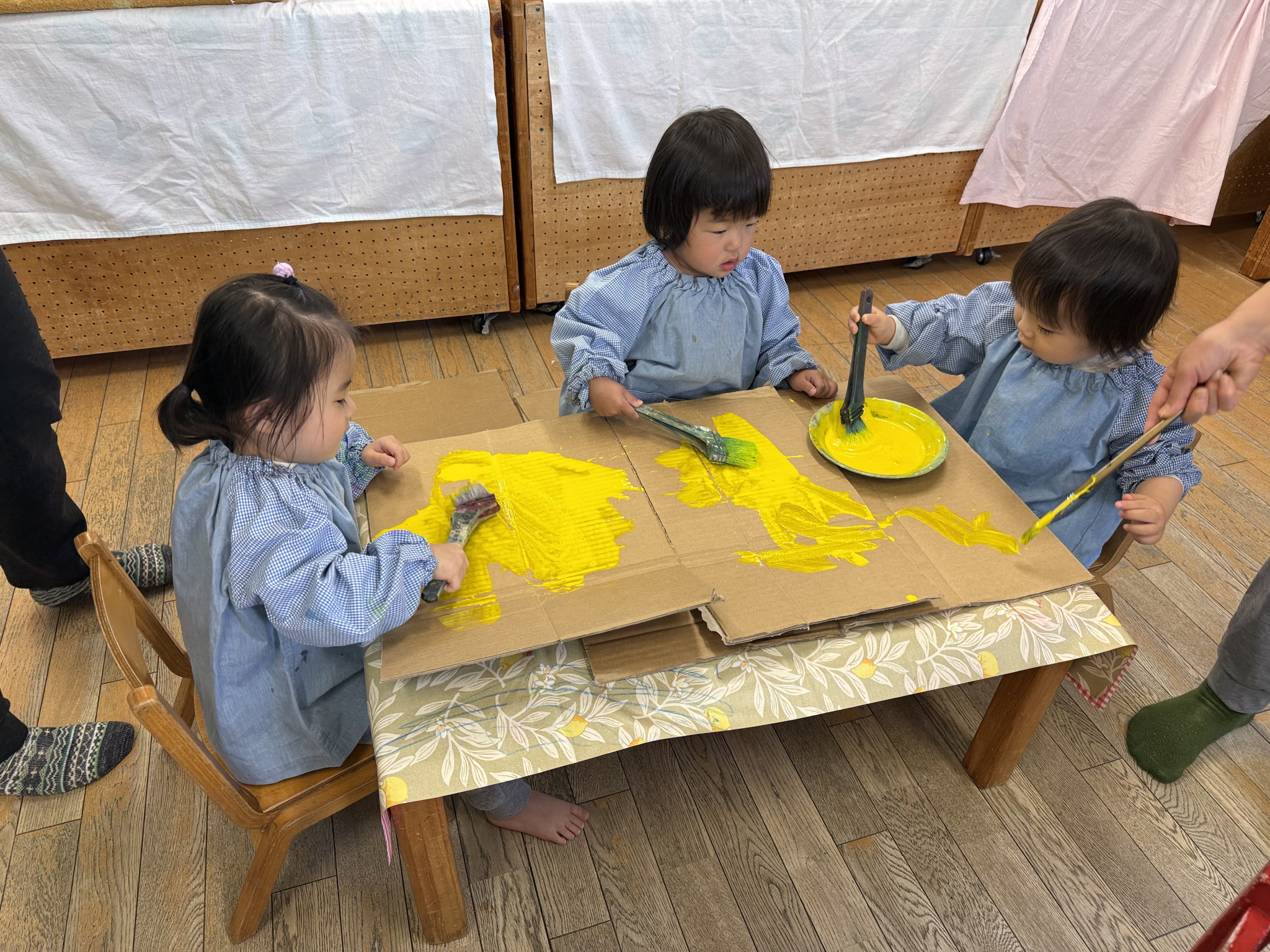 【 あひる 】 えのぐをぬりぬり・・・ 何になるかな 細かく上手にぬれたよ 完成したらかざります!おたのしみに☆