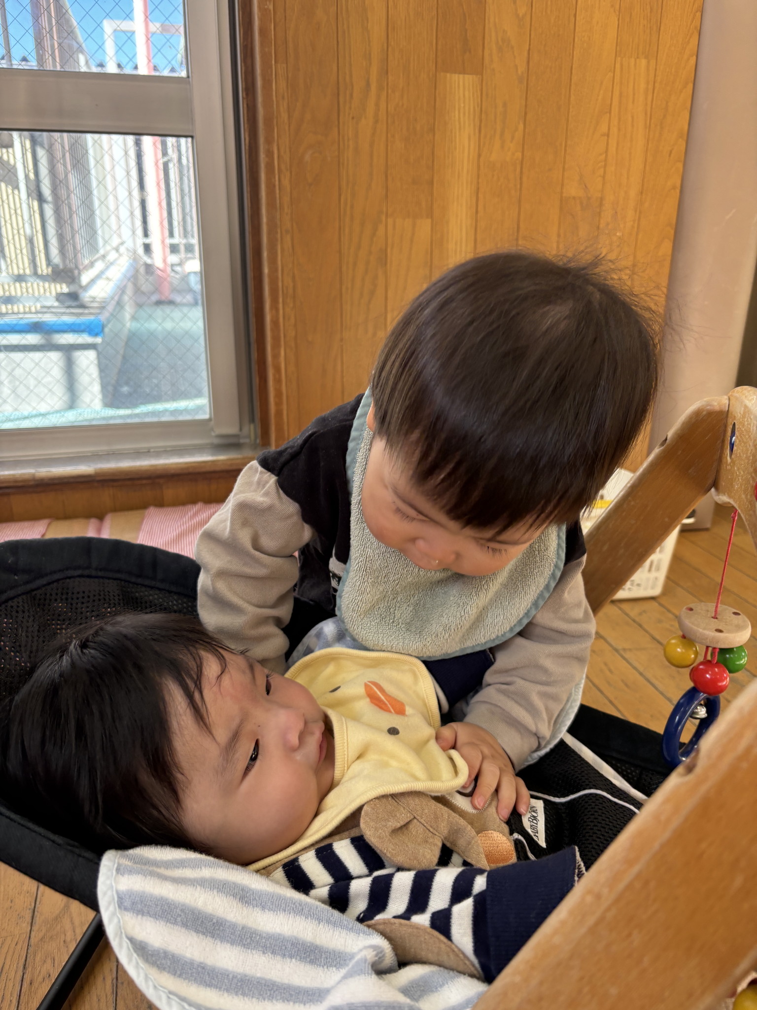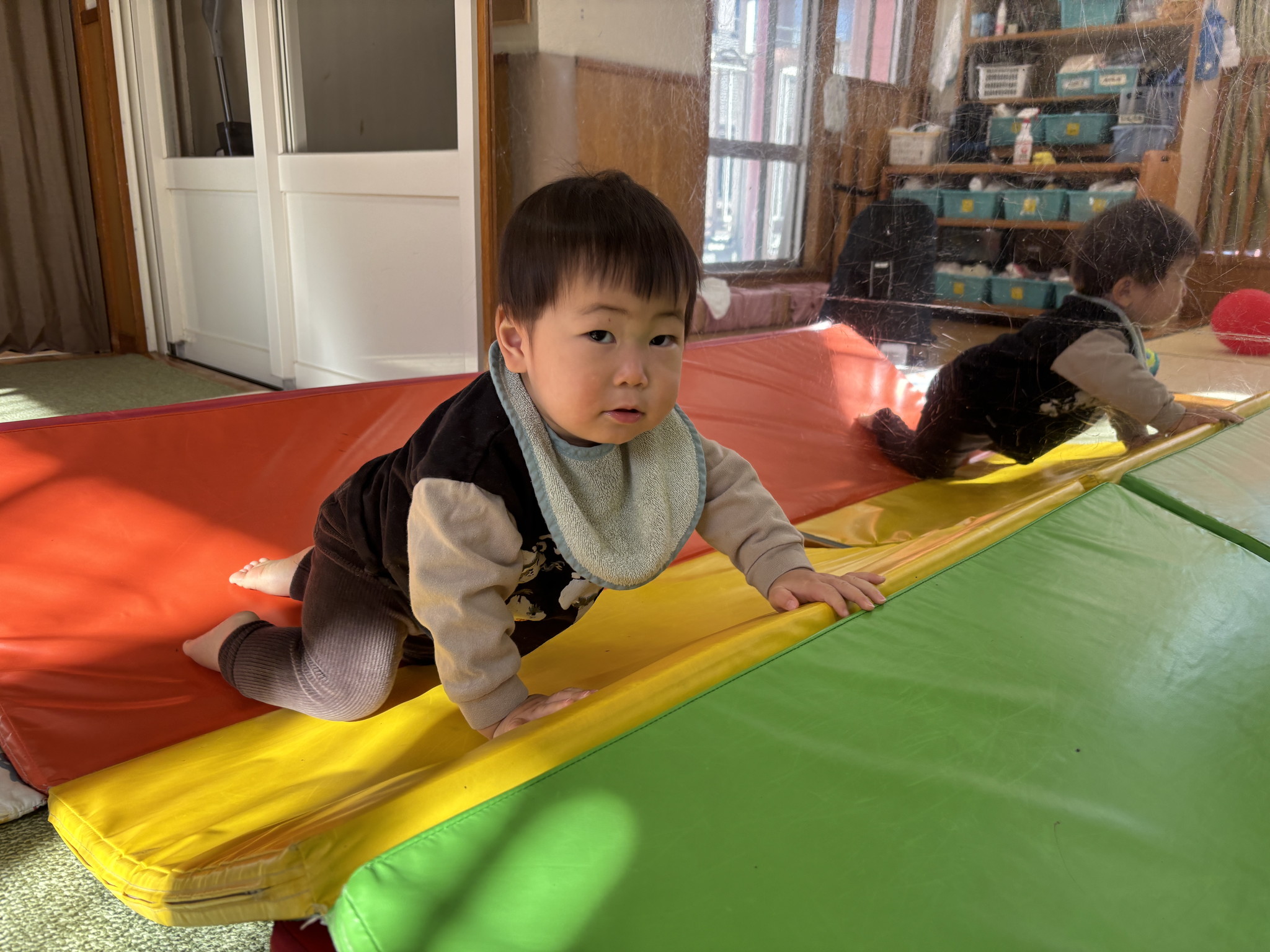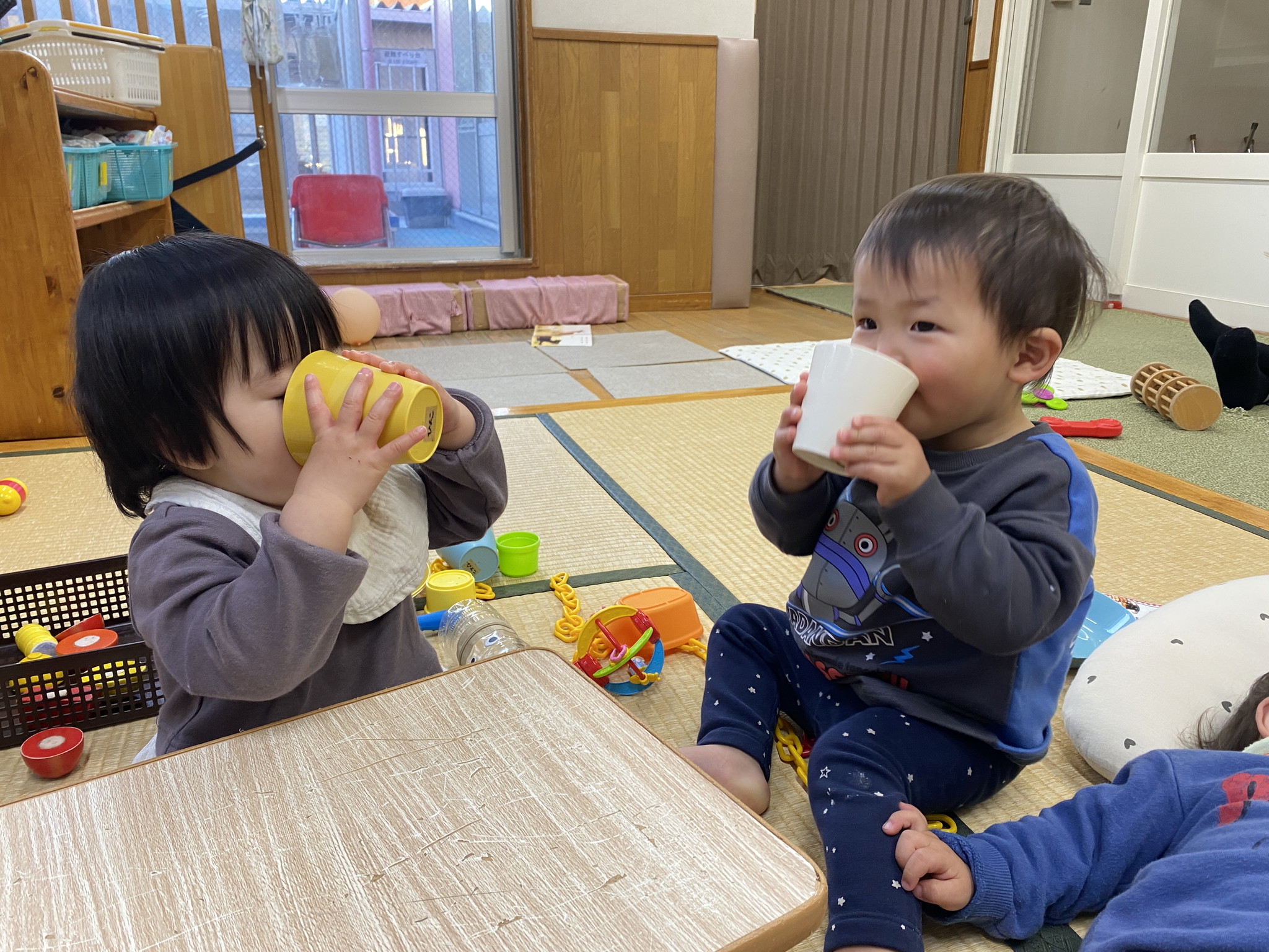 【 ひよこ 】 園長先生がお名前を呼びに来てくれました! 「はーい!」 かんぱーい!ゴクゴク 目線の先は… 鳥さん!すいすい泳いでいるね いいこいいこ はぐ~♡ ハイハイでのぼるよ