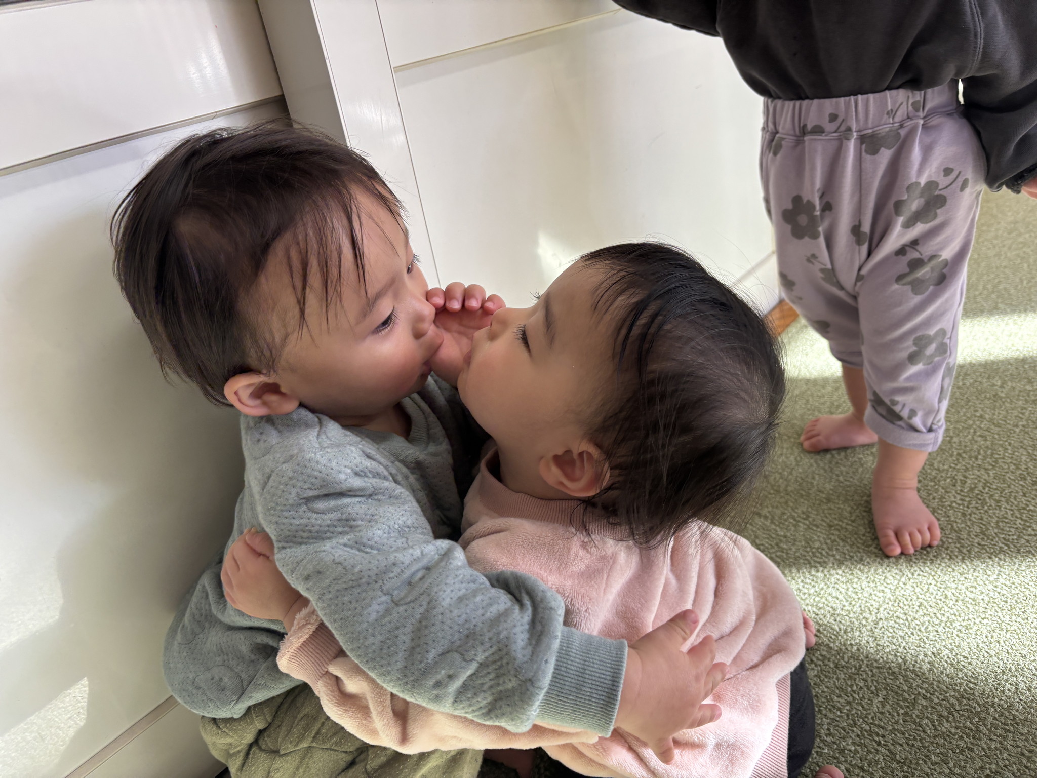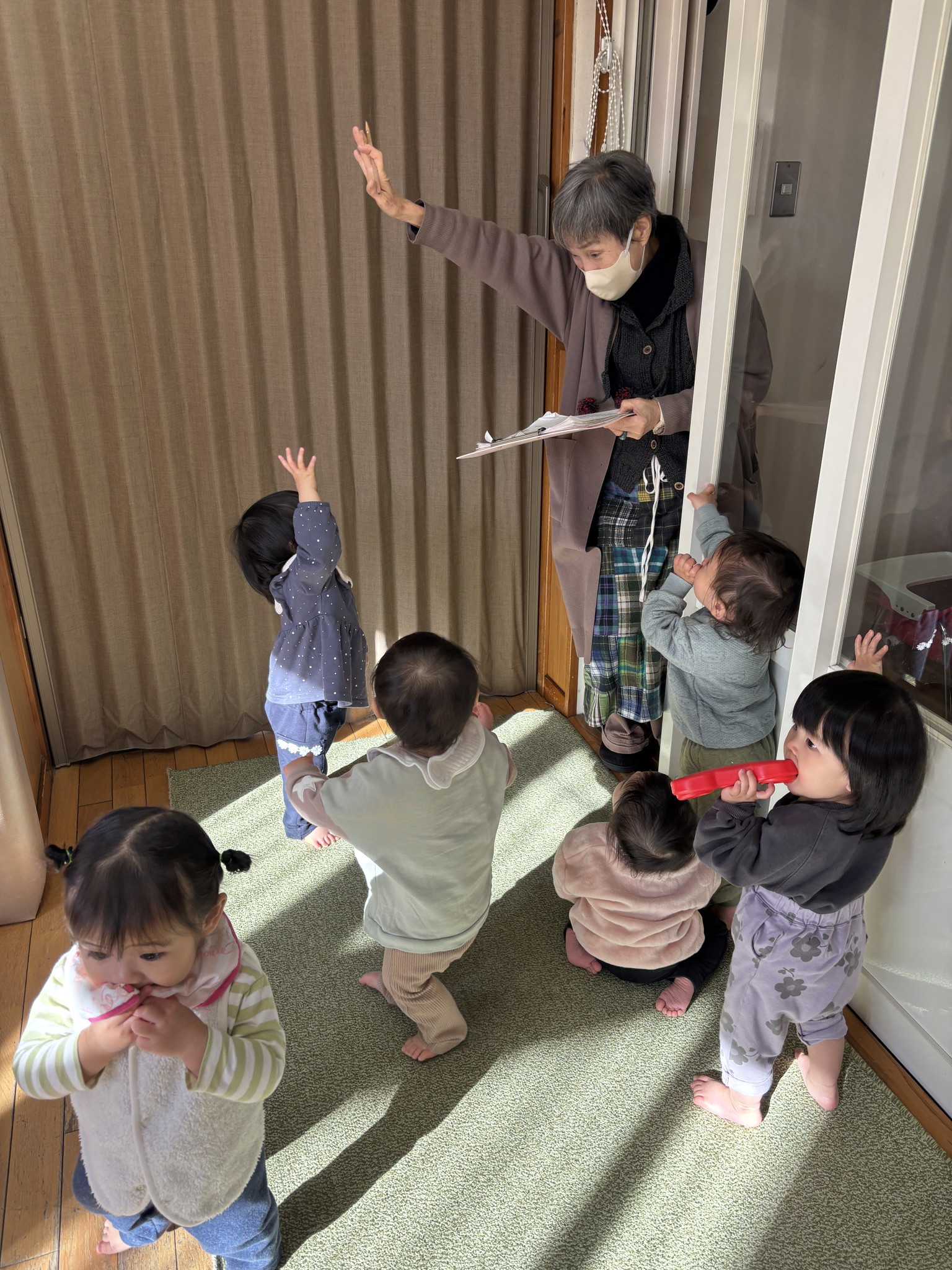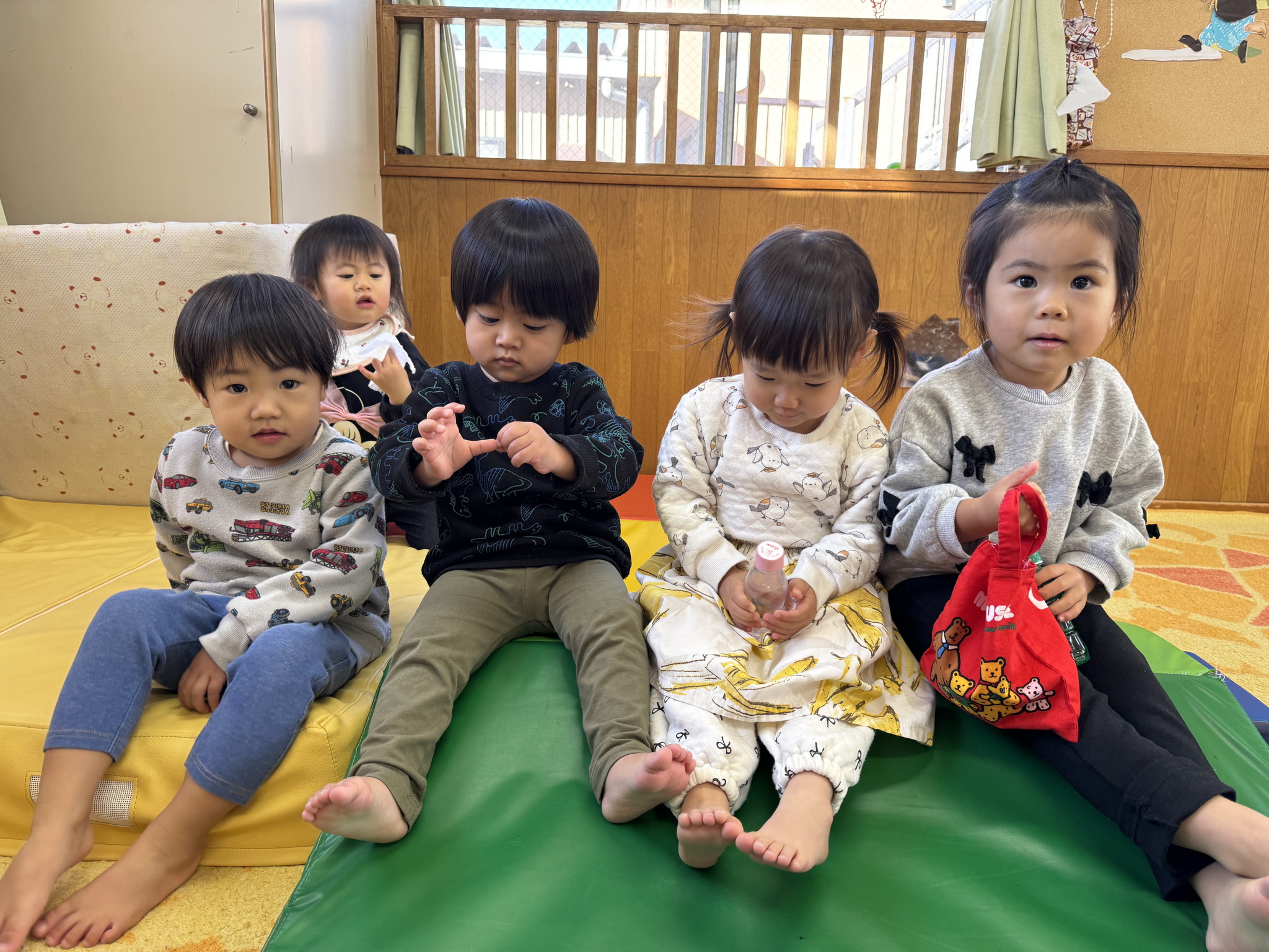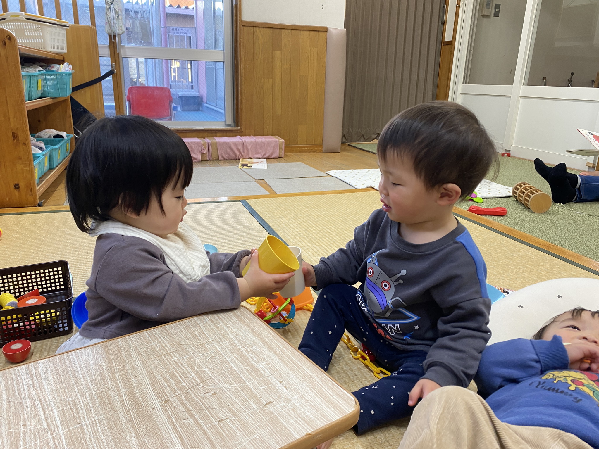 【 ひよこ 】 園長先生がお名前を呼びに来てくれました! 「はーい!」 かんぱーい!ゴクゴク 目線の先は… 鳥さん!すいすい泳いでいるね いいこいいこ はぐ~♡ ハイハイでのぼるよ