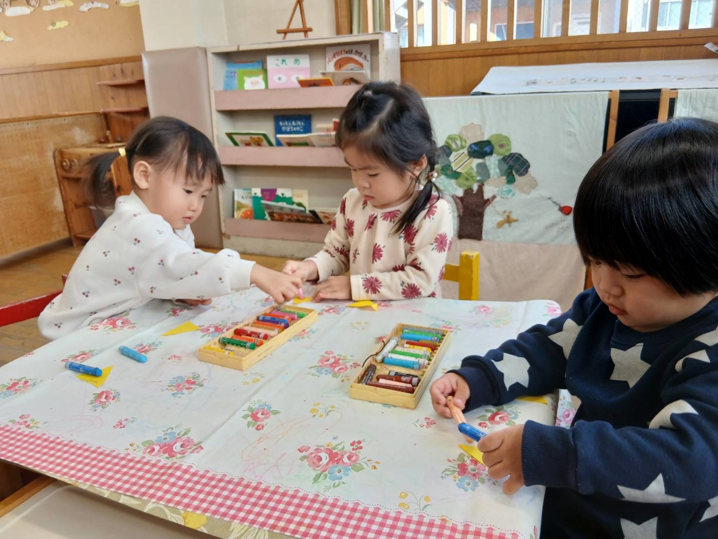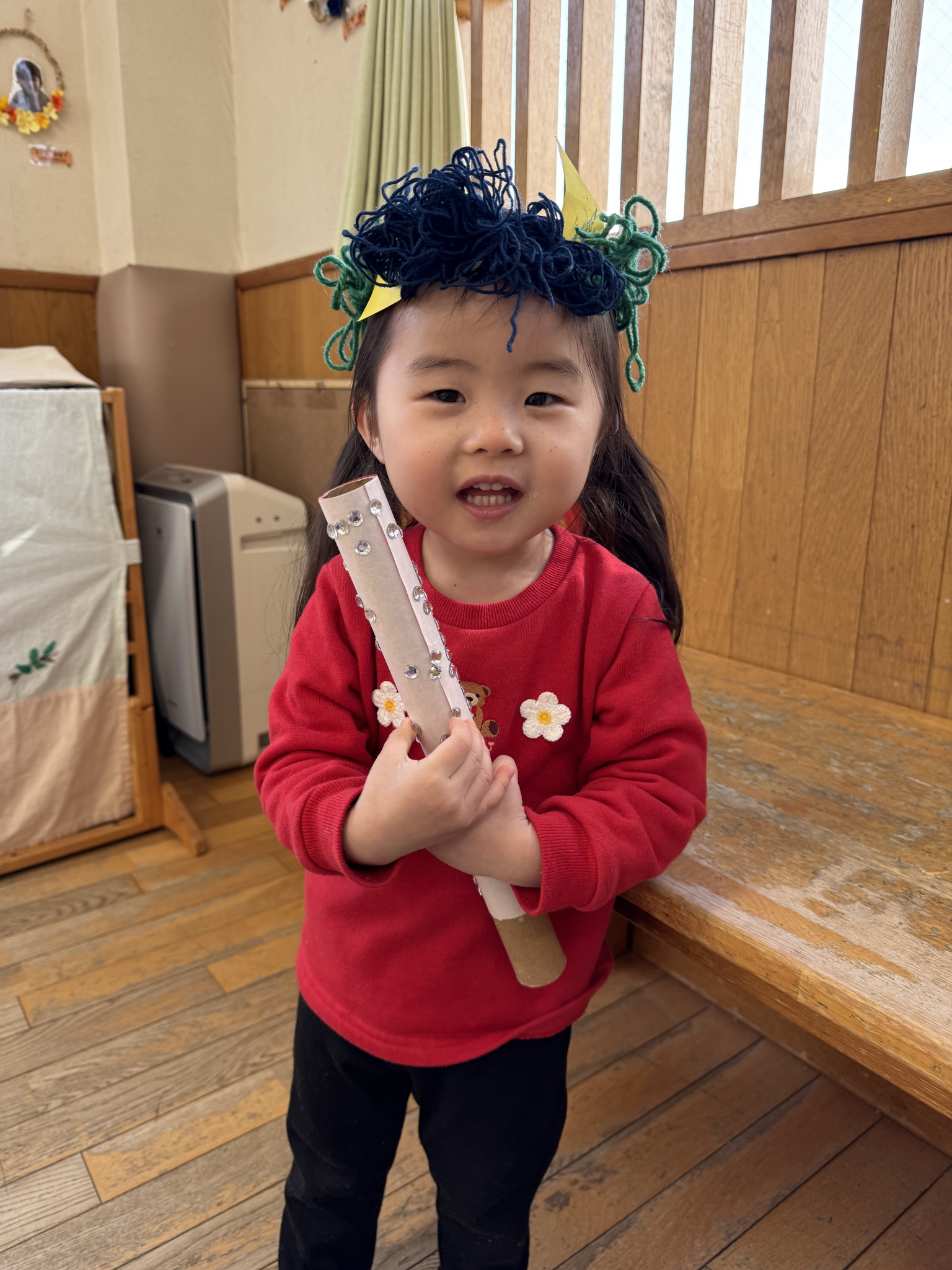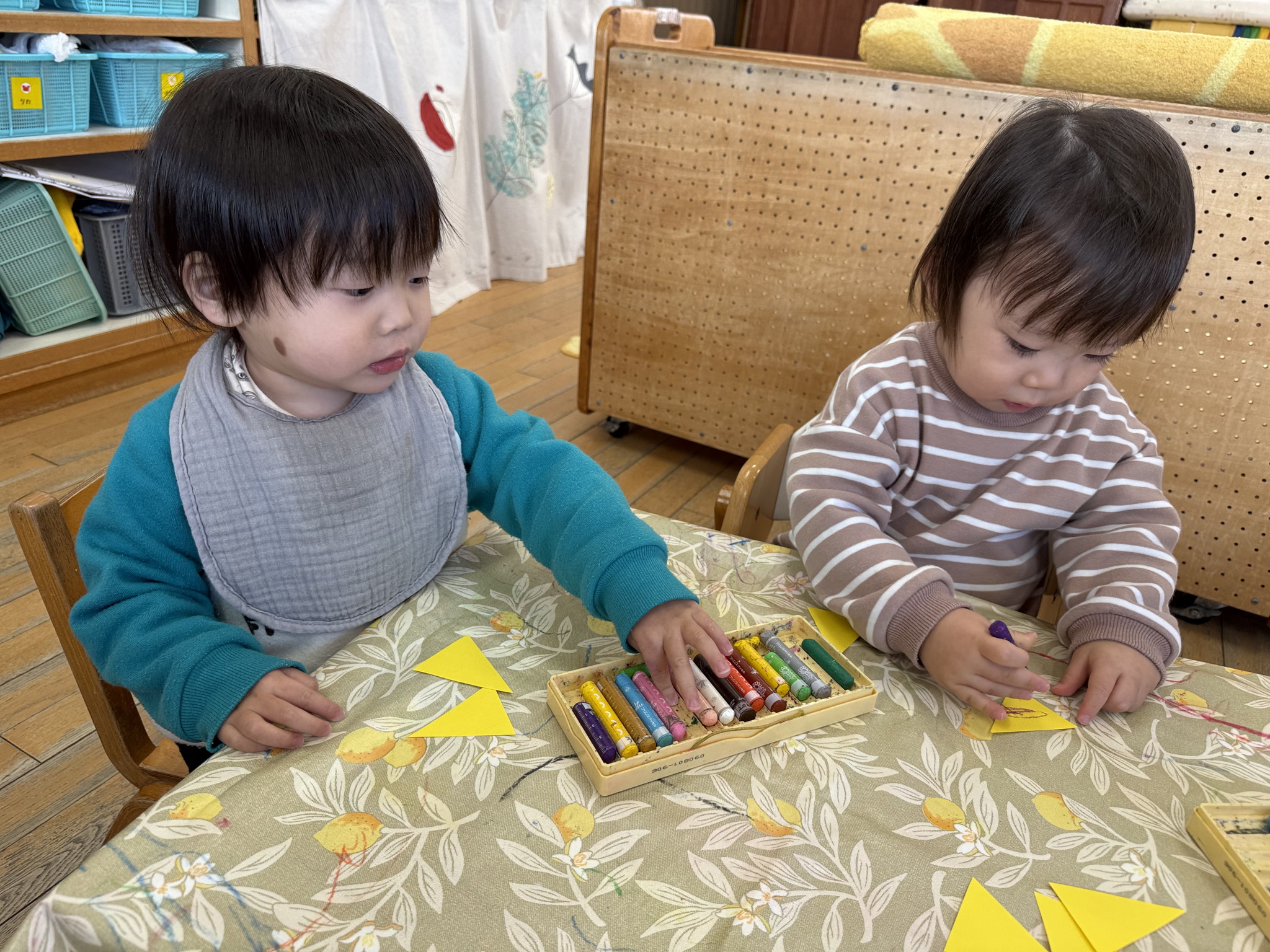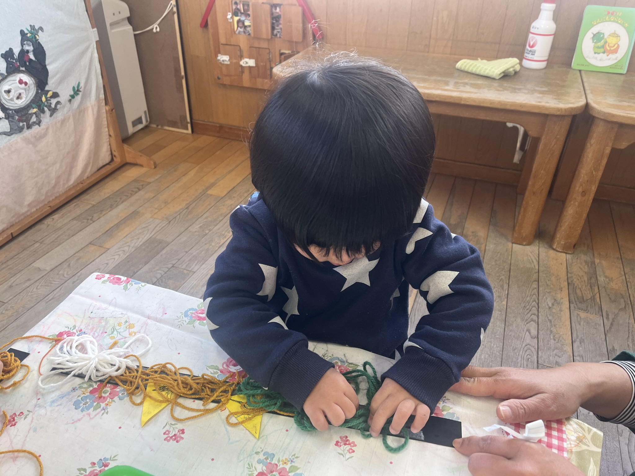 【 あひる 】 クレヨンで描き描き 何ができるでしょう 毛糸をつけて・・・ 自分の好きな色にしたよ ちびオニさん完成~!