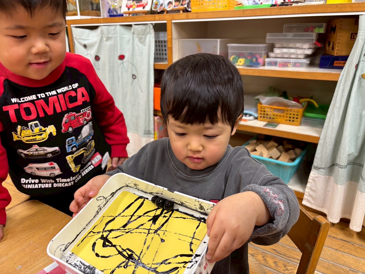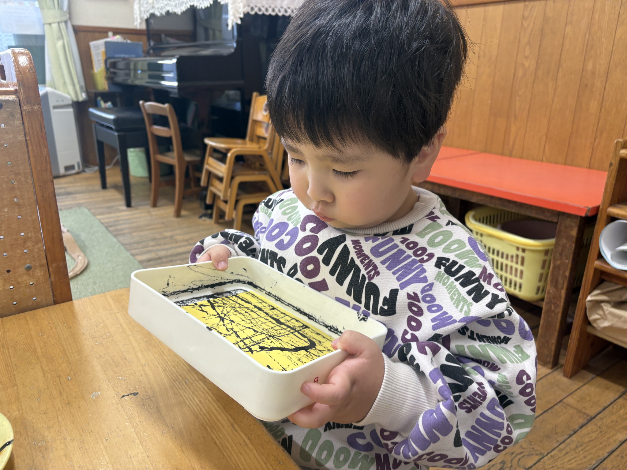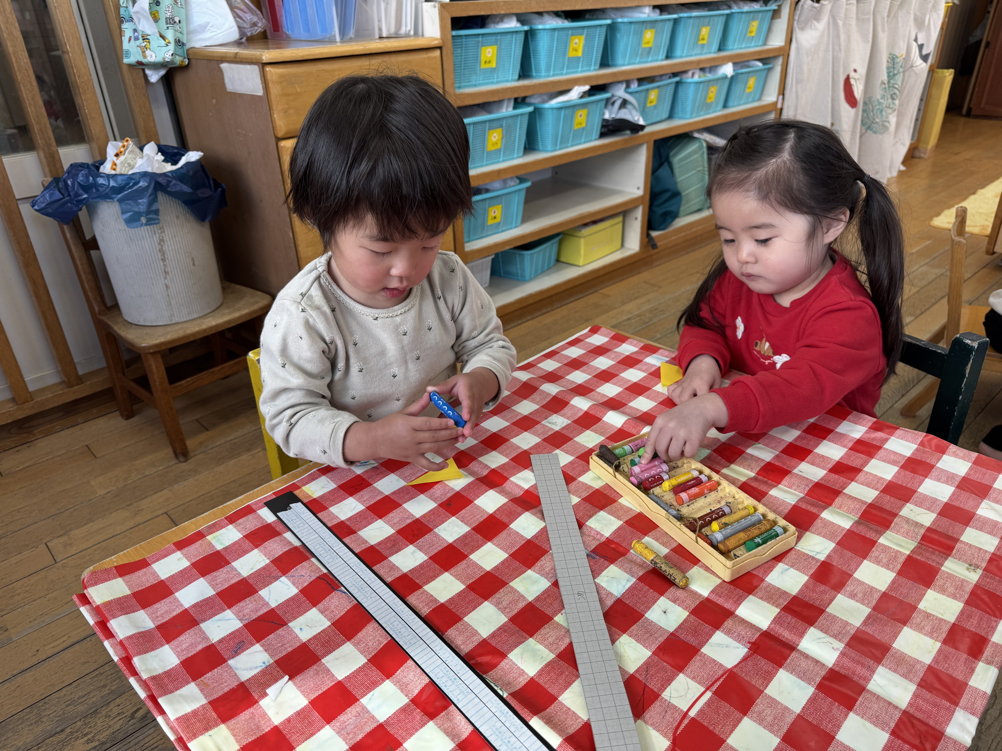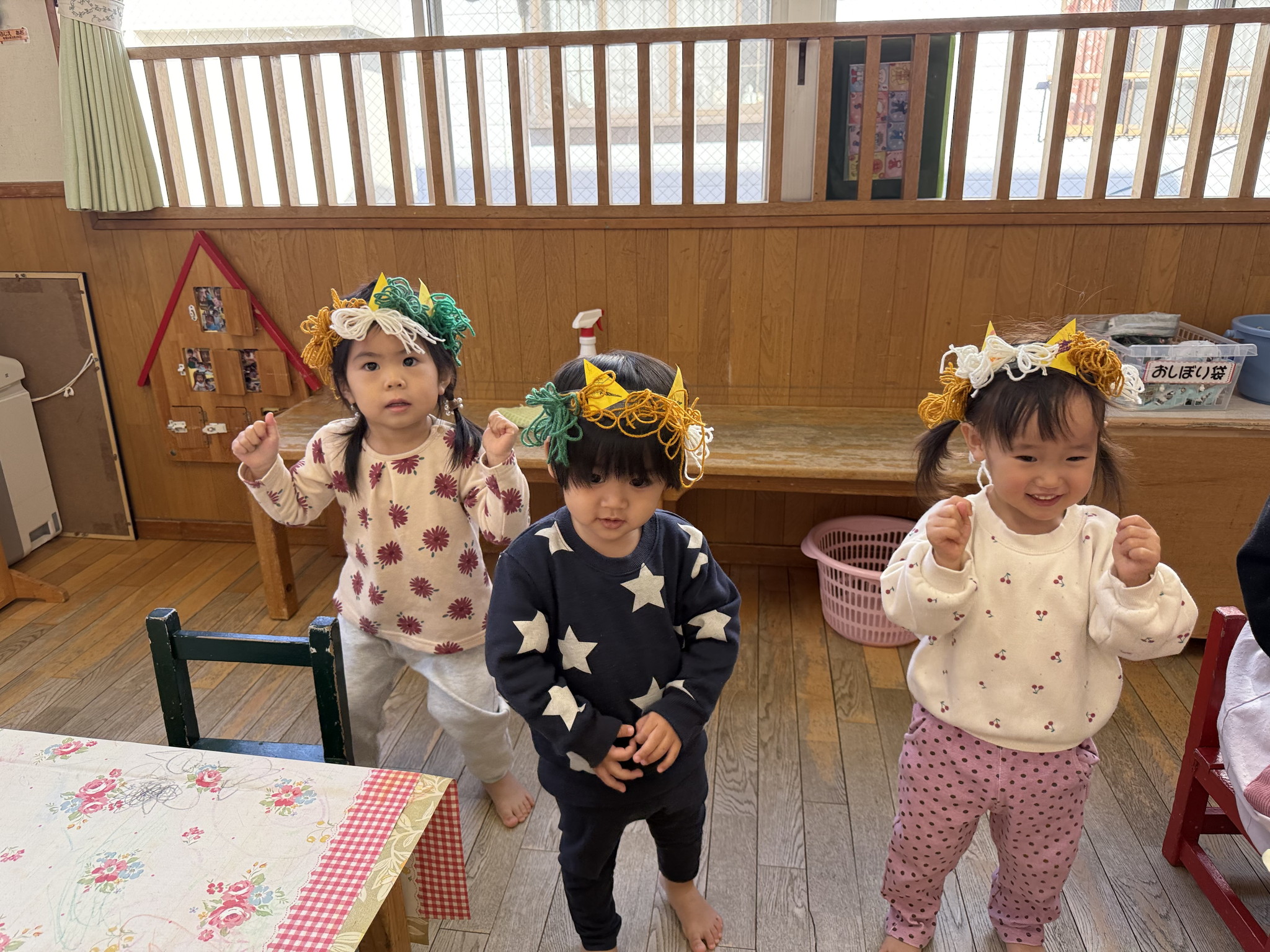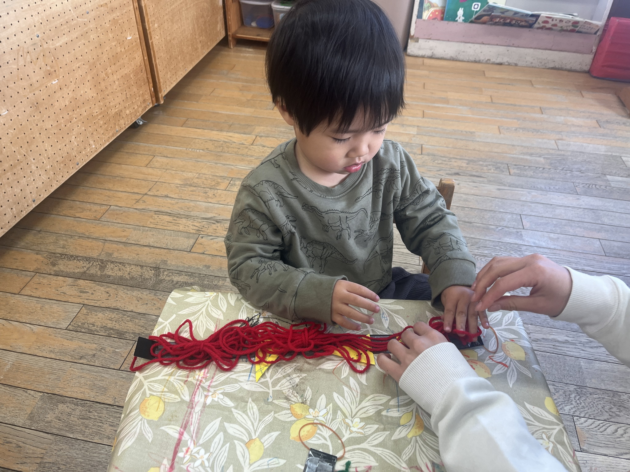 【 あひる 】 クレヨンで描き描き 何ができるでしょう 毛糸をつけて・・・ 自分の好きな色にしたよ ちびオニさん完成~!