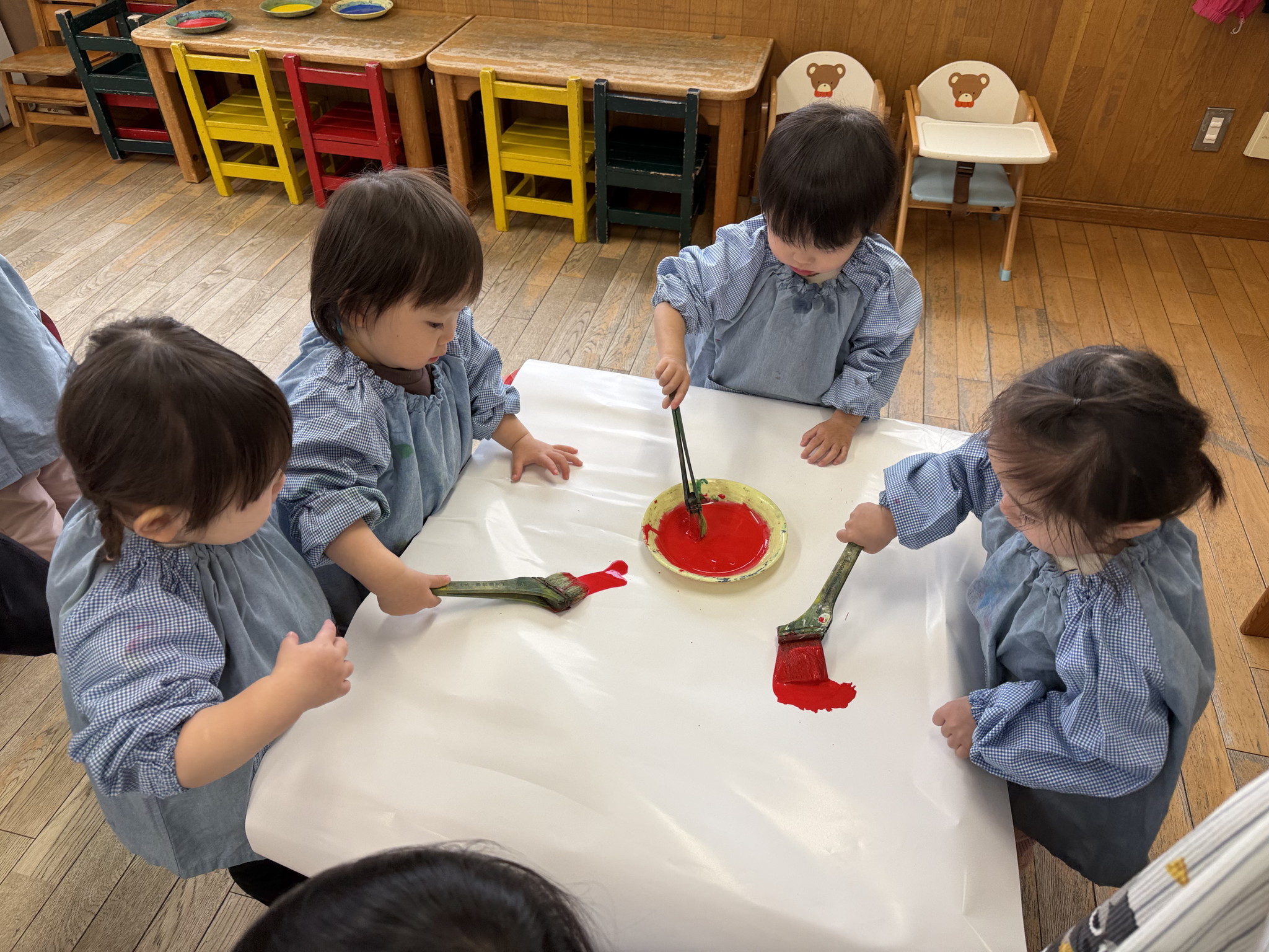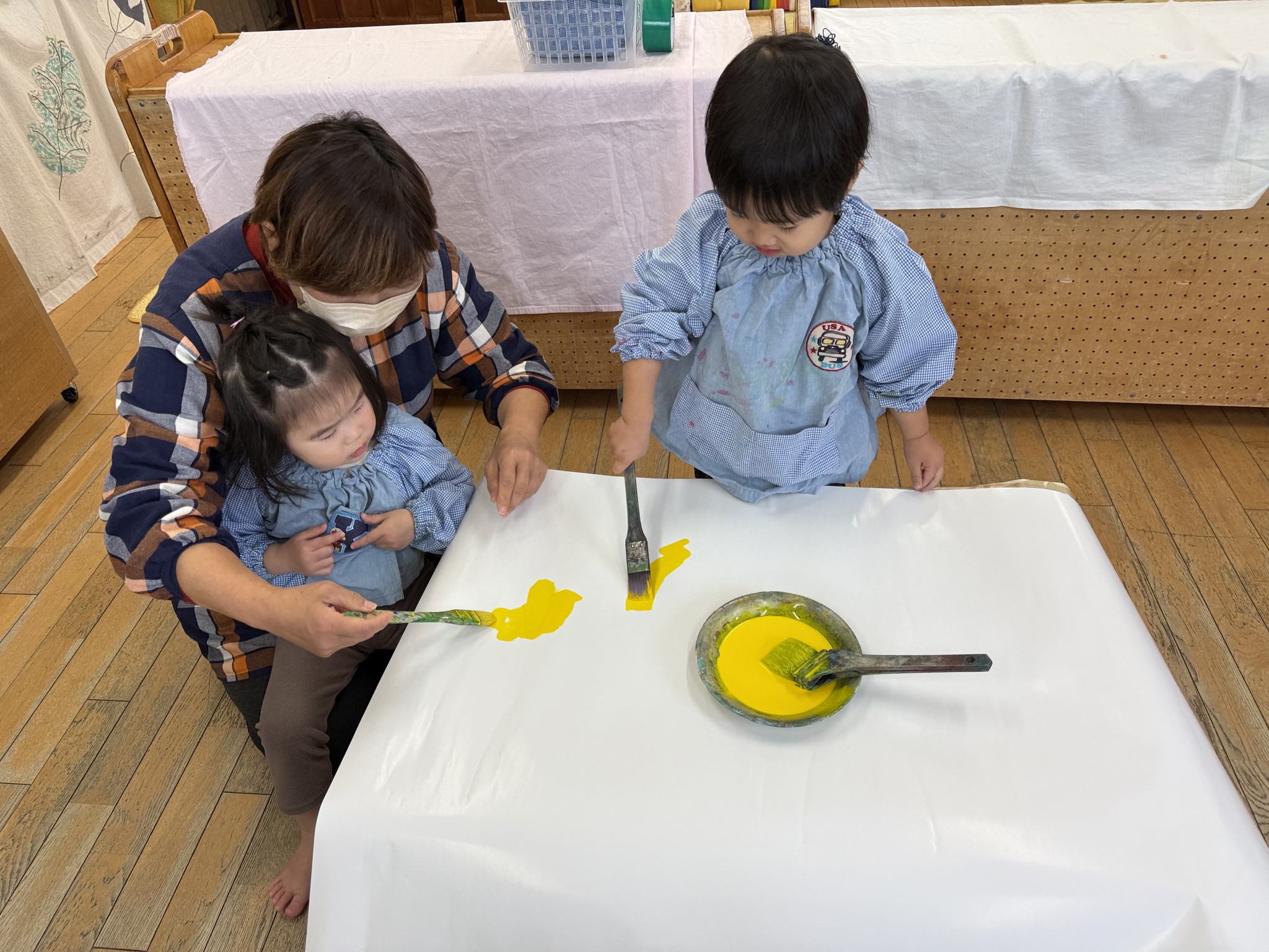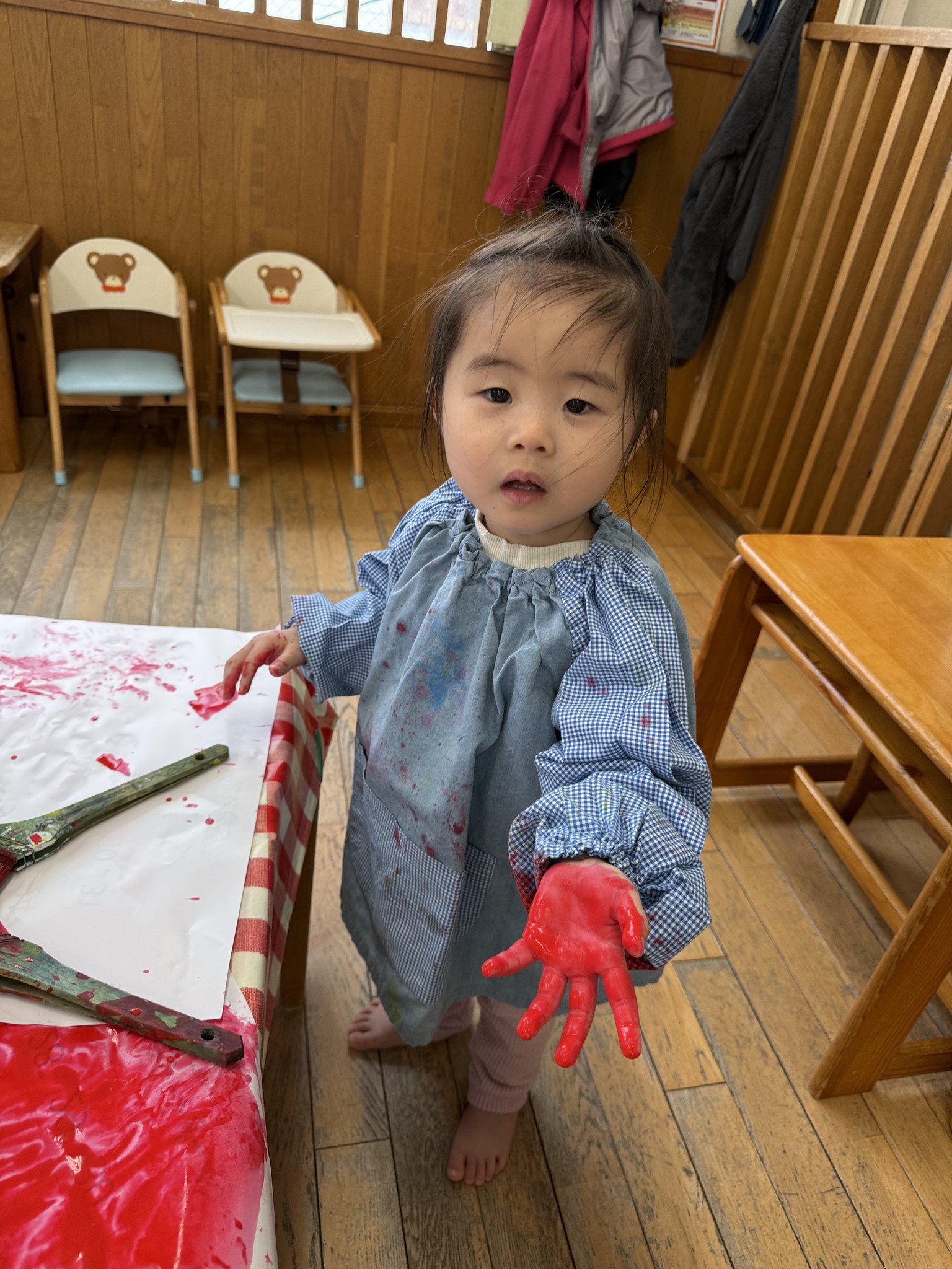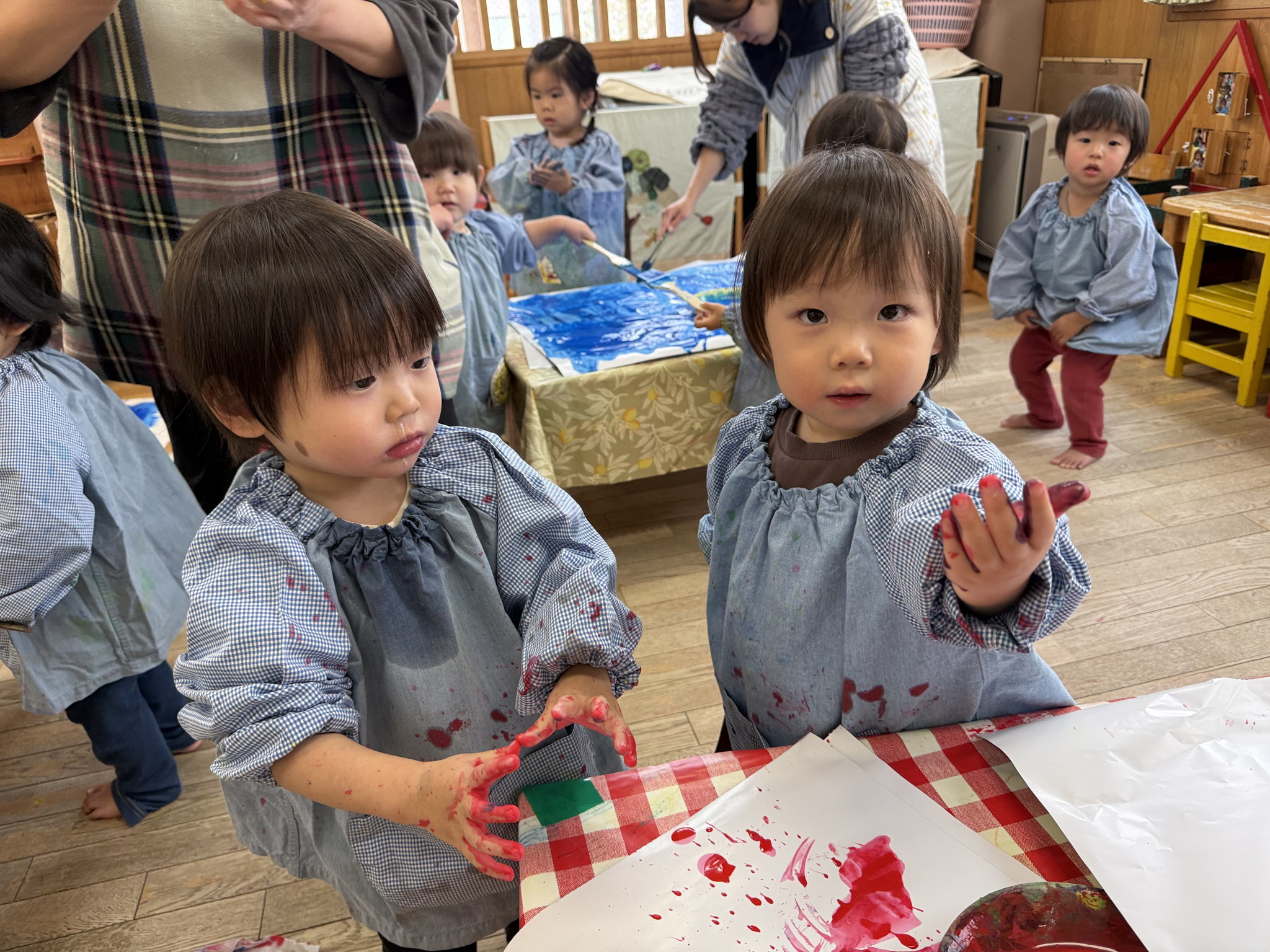 【 あひる 】 赤青黄色・・・何ができるでしょう? みんなえのぐ大スキ たくさんえのぐをぬってあそびました!