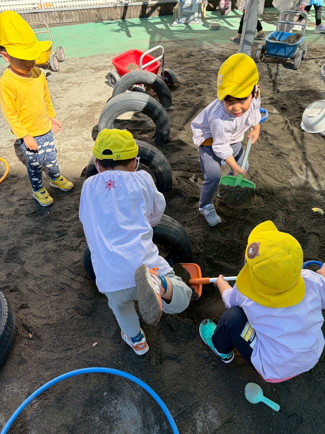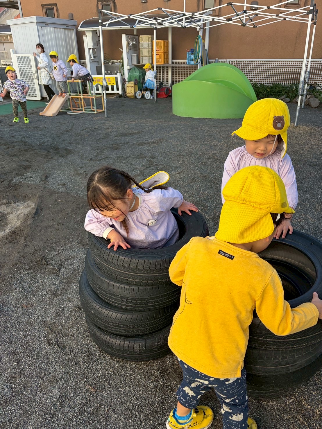 【 うさぎ 】 協力して画用紙いっぱいに塗るよ~ 筆でのびのび描いたよ 葉っぱでうさぎさんを作ったよ タイヤの中に入っちゃおう! タイヤ飛びを作って楽しもう!